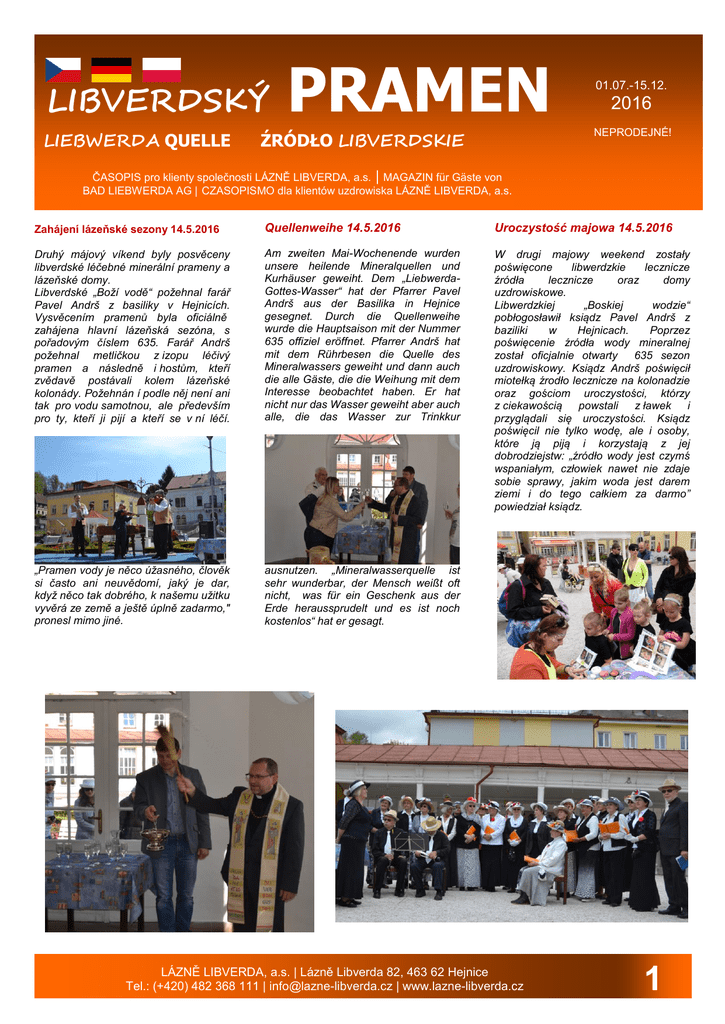 LIBVERDSKÝ LIEBWERDA QUELLE PRAMEN 01.07.-15.12. 2016 NEPRODEJNÉ! ŹRÓDŁO LIBVERDSKIE ČASOPIS pro klienty společnosti LÁZNĚ LIBVERDA, a.s. | MAGAZIN für Gäste von BAD LIEBWERDA AG | CZASOPISMO dla klientów uzdrowiska LÁZNĚ LIBVERDA, a.s. Zahájení lázeňské sezony 14.5.2016 Quellenweihe 14.5.2016 Uroczystość majowa 14.5.2016 Druhý májový víkend byly posvěceny libverdské léčebné minerální prameny a lázeňské domy. Libverdské „Boží vodě“ požehnal farář Pavel Andrš z basiliky v Hejnicích. Vysvěcením pramenů byla oficiálně zahájena hlavní lázeňská sezóna, s pořadovým číslem 635. Farář Andrš požehnal metličkou z izopu léčivý pramen a následně i hostům, kteří zvědavě postávali kolem lázeňské kolonády. Požehnán í podle něj není ani tak pro vodu samotnou, ale především pro ty, kteří ji pijí a kteří se v ní léčí. Am zweiten Mai-Wochenende wurden unsere heilende Mineralquellen und Kurhäuser geweiht. Dem „LiebwerdaGottes-Wasser“ hat der Pfarrer Pavel Andrš aus der Basilika in Hejnice gesegnet. Durch die Quellenweihe wurde die Hauptsaison mit der Nummer 635 offiziel eröffnet. Pfarrer Andrš hat mit dem Rührbesen die Quelle des Mineralwassers geweiht und dann auch die alle Gäste, die die Weihung mit dem Interesse beobachtet haben. Er hat nicht nur das Wasser geweiht aber auch alle, die das Wasser zur Trinkkur W drugi majowy weekend zostały poświęcone libwerdzkie lecznicze źródła lecznicze oraz domy uzdrowiskowe. Libwerdzkiej „Boskiej wodzie“ pobłogosławił ksiądz Pavel Andrš z baziliki w Hejnicach. Poprzez poświęcenie źródła wody mineralnej został oficjalnie otwarty 635 sezon uzdrowiskowy. Ksiądz Andrš poświęcił miotełką źrodło lecznicze na kolonadzie oraz gościom uroczystości, którzy z ciekawością powstali z ławek i przyglądali się uroczystości. Ksiądz poświęcil nie tylko wodę, ale i osoby, które ją piją i korzystają z jej dobrodziejstw: „źródło wody jest czymś wspaniałym, człowiek nawet nie zdaje sobie sprawy, jakim woda jest darem ziemi i do tego całkiem za darmo” powiedział ksiądz. „Pramen vody je něco úžasného, člověk si často ani neuvědomí, jaký je dar, když něco tak dobrého, k našemu užitku vyvěrá ze země a ještě úplně zadarmo," pronesl mimo jiné. ausnutzen. „Mineralwasserquelle ist sehr wunderbar, der Mensch weißt oft nicht, was für ein Geschenk aus der Erde heraussprudelt und es ist noch kostenlos“ hat er gesagt. LÁZNĚ LIBVERDA, a.s. | Lázně Libverda 82, 463 62 Hejnice Tel.: (+420) 482 368 111 | [email protected] | www.lazne-libverda.cz 1 LIBVERDSKÝ PRAMEN | LIEBWERDA QUELLE | ŹRÓDŁO LIBVERDSKIE 1. SEMINÁŘ 13.5.2016 Vážené kolegyně a vážení kolegové, 1. CENTRUM PODPORY PLODNOSTI, s.r.o. zdravotnické zařízení v souvislosti se zahájením spolupráce s lázeňským resortem LÁZNĚ LIBVERDA, a.s. připravilo seminář pro odbornou veřejnost na téma, které je pro tyto lázně netradiční: KOMPLEXNÍ INDIKATIVNÍ A TERAPEUTICKÉ ŘEŠENÍ FUNKČNÍ NEPLODNOSTI (komplexní psychosomatický přístup). Cílem naší spolupráce je možnost podílet se na komplexním řešení celospolečenského problému zvaného „NEPLODNOST“, jehož příčiny často stojí mimo gynekologii a urologii. Právě vhodným vyladěním pohybového aparátu společně s psychosomatickým přístupem týmu 1.CPP a klidným, pohodovým prostředím našeho lázeňského resortu významnou měrou zvýšíme možnost početí, ať už přirozenou cestou nebo IVF. Péče je směrována na celé páry. Seminář byl určen pro lékaře i sestry, hodnocen 4 kredity v systému celoživotního vzdělávání sester a kromě odborných přednášek zde jste měli možnost získat podrobnější a praktické informace o možnostech řešení poruch plodnosti i jak klienty do programů komplexní péče o neplodné páry zařadit a objednat. MUDr. Jana Všetičková Světlana Kulbáblová jednatelka a ředitelka ředitelka 1. CENTRUM PODPORY PLODNOSTI s.r.o. LÁZNĚ LIBVERDA, a.s. PROGRAM SEMINÁŘE 10,00 - 10,45: MUDr. JANA VŠETIČKOVÁ, 1. CPP PRAHA Význam životního stylu, výživy a psychického ladění při řešení funkční neplodnosti 10,45 - 11,30: MUDr. PETR KOLÁTOR, 1. CPP PRAHA Výživa pánve 11,30 - 12,00: MILAN SCHIRLO, MYCOMEDICA Exkurz do TCM ve vztahu k problematice plodnosti a možnosti řešení medicinálními houbami 13,00 - 13,45: GABRIELA KOLÁTOROVÁ, 1. CPP PRAHA Menstruační cyklus a jeho vliv na vnímání ženy 13,45 - 14,45: MICHAL KINDL, SPOLEČNOST PRO VÝZKUM A VZDĚLÁVÁNÍ, s.r.o. Význam role oxidu dusnatého při podpoře početí a udržení těhotenství 15,00 - 15,30: PharmDr. LUCIE KOTLÁŘOVÁ, EDUKAFARM PRAHA Infuzní ochrana zdravé buňky v prevenci a terapii 15,30 - 16,00: MUDr. JIŘÍ ŠUK, 1. CPP PRAHA Vliv přírodních bioaktivních látek na zvýšení vitality a plodnosti (možnosti ovlivnění spermiogramu a schopnosti početí) – kazuistiky LÁZNĚ LIBVERDA, a.s. | Lázně Libverda 82, 463 62 Hejnice Tel.: (+420) 482 368 111 | [email protected] | www.lazne-libverda.cz 2 LIBVERDSKÝ PRAMEN | LIEBWERDA QUELLE | ŹRÓDŁO LIBVERDSKIE Dovolili jsme si pro Vás připravit také doprovodný program v souvislosti s probíhajícím odborným seminářem, kde jsme Vám poradili, jak byste mohli podpořit svoje zdraví a vitalitu pomocí přírodních produktů: 1. 2. 3. 4. „HEALT&COLOSTRUM" produkty jsou 100% přírodní produkty z kravského mleziva na posílení imunity. "TIENS" Diagnostika zdravotního stavu přístrojem Aculife - přes akupunkturní body. "IN PHARM" Stav zdraví je výsledkem permanentní aktivní ochrany zdravých buněk před ohrožujícími rizikovými faktory. Jaký význam má infuze vitaminu C a glutathionu pro organismus? Obě účinné látky přináší do organismu antioxidační kapacitu, která neutralizuje nežádoucí 
