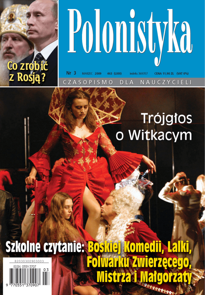 82030300903003 Nr 3 MARZEC 2009 433 (LVIII) indeks 369357 ISSN 0551-3707 nakład 3 000 egz. Czasopisma pedagogiczne CENA zł 11,90 (VAT 0%) Komitet redakcyjny: Bożena Chrząstowska (red. naczelny), Małgorzata Czermińska, Katarzyna Kuczyńska-Koschany, Maria KwiatkowskaRatajczak, Anna Legeżyńska, Wioletta Michałek (korekta), Michał Ratajczak (sekretarz redakcji), Piotr Śliwiński, Zenon Uryga, Wiesława Wantuch, Seweryna Wysłouch. Adres redakcji: 61-701 Poznań, ul. Fredry 10, (Uniwersytet im. A. Mickiewicza IFP Collegium Maius), tel. 0604 214 091, [email protected] Stały dyżur redakcyjny – czwartki, godz. 14-16. Wydawca: Dr Josef Raabe Spółka Wydawnicza Sp. z o.o., Wola Plaza, ul. Młynarska 8/12, 01-194 Warszawa, tel. 022 244 84 78; fax 022 244 84 76, e-mail: [email protected], www.edupress.pl NIP: 526-13-49-514, REGON: 011864960 Sąd Rejonowy dla M.st. Warszawy w Warszawie, XII Wydział Gospodarczy KRS KRS 0000118704 Wysokość Kapitału Zakładowego: 50.000 PLN Prezes Zarządu: Michał Włodarczyk. Dyrektor wydawniczy: Józef Szewczyk, tel. 022 244 84 70, [email protected]. Dział Obsługi Klienta: Anna Konon, tel. 022 244 84 11, [email protected]. Dyrektor marketingu: Anna Gryczewska, [email protected]. Kolportaż: Anna Niepiekło, tel. 022 244 84 78, [email protected]. Reklama: Andrzej Idziak tel. 022 244 84 77, 0692 277 761, [email protected]. Skład i łamanie: Kinga Chudobiecka, tel. 0503 90 25 35. Druk i oprawa: Pabianickie Zakłady Graficzne SA, 95-200 Pabianice, ul. Piotra Skargi 40/42. Inne informacje: Redakcja nie zwraca nadesłanych materiałów i zastrzega sobie prawo formalnych zmian w treści artykułów, nie odpowiada za treść płatnych reklam. Fot. na okładce: PAP @ Polonistyka C Z A S O P I S M O D L A N AU C Z YC I E L I W NUMERZE OD REDAKCJI 5 Maria Kwiatkowska-Ratajczak, Szkolne czytanie! HORYZONTY POLONISTYKI 6 Jerzy Fiećko, Co zrobić z Rosją? 11 Joanna Wosińska, Naród, Ojczyzna, Europa w refleksji Cypriana Norwida 17 Maria Cyran, Trójgłos o Witkacym TAJNIKI WARSZTATU 23 Krzysztof Koc, O potępieńcach, diabłach, pokutujących pyszałkach i egzaminie, czyli dlaczego warto czytać „Boską Komedię” 29 Anna Wodzyńska, Labirynt rzeczywistości w „Lalce” 35 Agata Wójtowicz-Stefańska, Sześć sposobów na „Mistrza i Małgorzatę” 40 Marta Nadolna, „Folwark Zwierzęcy” czytany w szkole 46 Katarzyna Szewczyk-Haake, Stając przed wierszem („Złożenie Chrystusa do grobu”, olej, płótno Jakuba Ekiera) 49 Agnieszka Bal, Różne style i odmiany języka (na przykładzie „Balladyny” Juliusza Słowackiego) RECENZJE 58 Danuta Rajewicz, Edukacja przez film 62 Joanna Krenz, Intrygująca książka Zapraszamy do odwiedzenia naszej strony w Internecie www.edupress.pl RECENZJE Edukacja przez film QDANUTA RAJEWICZ W styczniu 2009 r. do prawie 15 tysięcy szkół w Polsce i polskich szkół za granicą dotarły pakiety składające się z 26 płyt DVD, zawierających ponad 50 polskich filmów. Tym sposobem zainaugurowano niezwykły program edukacyjny nazwany przez autorów Filmoteką Szkolną. Przedsięwzięcie Polskiego Instytutu Sztuki Filmowej nie tylko objęte zostało patronatem Ministra Kultury i Dziedzictwa Narodowego, ale też stanowi realizację jego priorytetowego programu edukacji artystycznej. W merytoryczne przygotowanie projektu zaangażowanych było wielu znawców kina, pracowników naukowych Uniwersytetów Łódzkiego, Jagiellońskiego, Poznańskiego i Toruńskiego. Przewodniczącą zespołu redakcyjnego jest Ewelina Nurczyńska-Fidelska. Zakładanym celem jest włączenie wiedzy o filmie do procesu edukacji szkolnej: „Filmoteka Szkolna” wychodzi naprzeciw potrzebom i oczekiwaniom nauczycieli, którzy w swych działaniach dydaktycznych i wychowawczych traktują obecność sztuki i kultury filmowej jako istotny warunek kształtowania świadomości, wrażliwości i postaw swych uczniów w świecie ekspansywnej kultury audiowizualnej1. Na płycie 1 2 Pakiet filmowy, stanowiący podstawowy element programu, składa się z 26 płyt DVD. Na każdej z nich znajdują się filmy polskie, z reguły jeden fabularny oraz 1-2 dokumenty lub animacje, a także dwa komentarze: filmoznawczy i subiektywny. Dobór materiału koncentruje się wokół przyjętego tematu, którego filmy są reprezentatywną ilustracją. 58 Już sam przegląd tytułów: Kino myśli, Moralność kamery, Obserwacje codzienności, Wokół narodowych stereotypów, Metafory prawdy ujawnia koncepcję autorów2. Odnajdujemy tu zarówno zagadnienia związane stricte ze sztuką filmową, jak i kwestie uniwersalne. Dobór dzieł również jest znaczący. Nie są to ekranizacje lektur szkolnych ani zestaw najważniejszych osiągnięć polskiego kina. Wybór nie był zatem podyktowany chęcią odtworzenia etapów rozwoju polskiej filmografii czy prezentacji sylwetek twórczych najwybitniejszych polskich reżyserów. Wybrane obrazy opisują temat cyklu w sposób specyficzny dla tego medium. Są swoistym komentarzem, głosem jednej z dziedzin sztuki w dyskusji o prawdzie, o pamięci, zbioE. Nurczyńska-Fidelska, cyt. za: Broszura Filmoteka Szkolna, dodatek do materiałów audiowizualnych. W całym pakiecie znalazły się następujące cykle tematyczne: Kino myśli, Moralność kamery, Obserwacje codzienności, Kadry pamięci, Obrazy magiczne, Filmowe przypowieści, Siła symbolu, Metafory prawdy, Mówić nie wprost, Bez komentarza?, Rozdroża historii, Zapisy przeszłości, Wokół narodowych stereotypów, Gorzki śmiech, W krzywym zwierciadle, Współczesne lęki, Portrety zbiorowości, Mali bohaterowie, Między fikcją a rzeczywistością, Poezja i proza kina, Kino o kinie, Gry filmowe, Malarskie inspiracje, Nowa estetyka, Esej filmowy i Kim jestem? polonistyka RECENZJE rowości, powinnościach i naszym stosunku Muniek Staszczyk, Tomasz Lis, Kabaret do imponderabiliów. Na płytach znajdują się Munio, zespół Lao Che, ks. Wojciech Drozzarówno filmy tworzące ka
