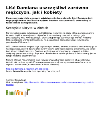 Liść Damiana uszczęśliwi zarówno mężczyzn, jak i kobiety Zioła skrywają wiele cennych właściwości zdrowotnych. Liść Damiana jest tego przykładem. Roślina ta wpływa bowiem na sprawność seksualną, a także nasze samopoczucie. Szczęście ukryte w ziołach Na wszystkie nasze schorzenia odnajdziemy z pewnością zioła, które pomogą nam w leczeniu bądź w zmniejszeniu objawów. I tak możemy czerpać z natury, gdy potrzebujemy leku wykrztuśnego, przeciwzapalnego czy kojącego nerwy. Możemy także poszukać wśród ziół sposobu na polepszenie samopoczucia i rozwiązania problemów łóżkowych. Liść Damiana może nie jest zbyt popularnym ziołem, ale bez problemu dostaniemy go w każdej aptece. Już od dawna stosowany jest w celu oczyszczenia organizmu, ale także jako lek przeciwdepresyjny. Świetnie wpłynie na samopoczucie, uspokoi, a także zwiększy popęd seksualny. Poprawia ukrwienie narządów płciowych i stosowany jest w terapii leczenia bezpłodności. Natura oferuje Panom także inne rozwiązania najbardziej palących ich problemów. Wśród ziół można wyróżnić te na poprawę potencji, na wypadanie włosów, czy na otyłość. Warto znać je i stosować w razie potrzeby. Kup liść damiana z rabatem 3% już teraz ! (wpisz bonavita w polu „kod specjalny” w koszyku) Author: Bonavita.pl Link do artykułu: http://bonavita.pl/lisc-damiana-uszczesliwi-zarowno-mezczyzn-jak-ikobiety
