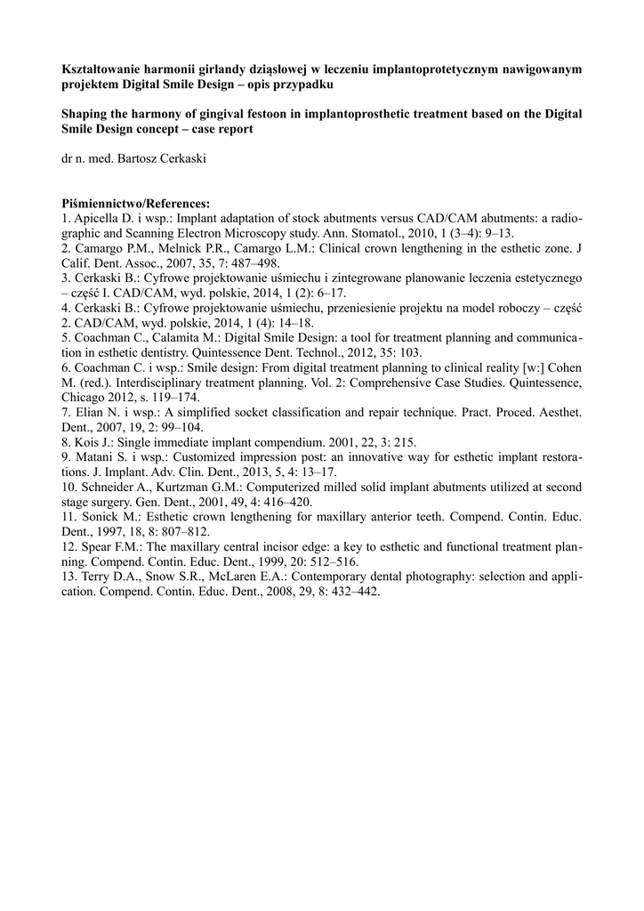 Kształtowanie harmonii girlandy dziąsłowej w leczeniu implantoprotetycznym nawigowanym projektem Digital Smile Design – opis przypadku Shaping the harmony of gingival festoon in implantoprosthetic treatment based on the Digital Smile Design concept – case report dr n. med. Bartosz Cerkaski Piśmiennictwo/References: 1. Apicella D. i wsp.: Implant adaptation of stock abutments versus CAD/CAM abutments: a radiographic and Scanning Electron Microscopy study. Ann. Stomatol., 2010, 1 (3–4): 9–13. 2. Camargo P.M., Melnick P.R., Camargo L.M.: Clinical crown lengthening in the esthetic zone. J Calif. Dent. Assoc., 2007, 35, 7: 487–498. 3. Cerkaski B.: Cyfrowe projektowanie uśmiechu i zintegrowane planowanie leczenia estetycznego – część I. CAD/CAM, wyd. polskie, 2014, 1 (2): 6–17. 4. Cerkaski B.: Cyfrowe projektowanie usmiechu, przeniesienie projektu na model roboczy – częsc 2. CAD/CAM, wyd. polskie, 2014, 1 (4): 14–18. 5. Coachman C., Calamita M.: Digital Smile Design: a tool for treatment planning and communication in esthetic dentistry. Quintessence Dent. Technol., 2012, 35: 103. 6. Coachman C. i wsp.: Smile design: From digital treatment planning to clinical reality [w:] Cohen M. (red.). Interdisciplinary treatment planning. Vol. 2: Comprehensive Case Studies. Quintessence, Chicago 2012, s. 119–174. 7. Elian N. i wsp.: A simplified socket classification and repair technique. Pract. Proced. Aesthet. Dent., 2007, 19, 2: 99–104. 8. Kois J.: Single immediate implant compendium. 2001, 22, 3: 215. 9. Matani S. i wsp.: Customized impression post: an innovative way for esthetic implant restorations. J. Implant. Adv. Clin. Dent., 2013, 5, 4: 13–17. 10. Schneider A., Kurtzman G.M.: Computerized milled solid implant abutments utilized at second stage surgery. Gen. Dent., 2001, 49, 4: 416–420. 11. Sonick M.: Esthetic crown lengthening for maxillary anterior teeth. Compend. Contin. Educ. Dent., 1997, 18, 8: 807–812. 12. Spear F.M.: The maxillary central incisor edge: a key to esthetic and functional treatment planning. Compend. Contin. Educ. Dent., 1999, 20: 512–516. 13. Terry D.A., Snow S.R., McLaren E.A.: Contemporary dental photography: selection and application. Compend. Contin. Educ. Dent., 2008, 29, 8: 432–442.