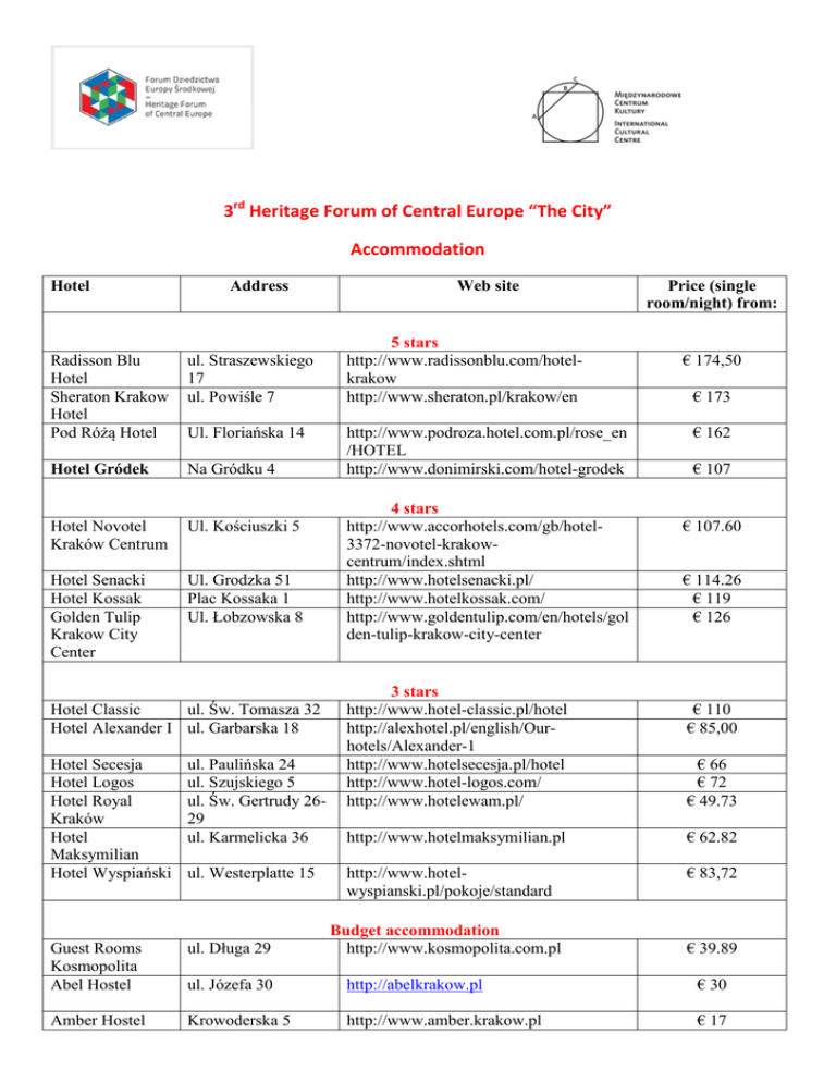 3rd Heritage Forum of Central Europe “The City” Accommodation Hotel Address Radisson Blu Hotel Sheraton Krakow Hotel Pod Różą Hotel ul. Straszewskiego 17 ul. Powiśle 7 Hotel Gródek Na Gródku 4 Ul. Floriańska 14 Hotel Novotel Kraków Centrum Ul. Kościuszki 5 Hotel Senacki Hotel Kossak Golden Tulip Krakow City Center Ul. Grodzka 51 Plac Kossaka 1 Ul. Łobzowska 8 Hotel Classic ul. Św. Tomasza 32 Hotel Alexander I ul. Garbarska 18 Hotel Secesja Hotel Logos Hotel Royal Kraków Hotel Maksymilian Hotel Wyspiański ul. Paulińska 24 ul. Szujskiego 5 ul. Św. Gertrudy 2629 ul. Karmelicka 36 ul. Westerplatte 15 Web site 5 stars http://www.radissonblu.com/hotelkrakow http://www.sheraton.pl/krakow/en http://www.podroza.hotel.com.pl/rose_en /HOTEL http://www.donimirski.com/hotel-grodek 4 stars http://www.accorhotels.com/gb/hotel3372-novotel-krakowcentrum/index.shtml http://www.hotelsenacki.pl/ http://www.hotelkossak.com/ http://www.goldentulip.com/en/hotels/gol den-tulip-krakow-city-center 3 stars http://www.hotel-classic.pl/hotel http://alexhotel.pl/english/Ourhotels/Alexander-1 http://www.hotelsecesja.pl/hotel http://www.hotel-logos.com/ http://www.hotelewam.pl/ Price (single room/night) from: € 174,50 € 173 € 162 € 107 € 107.60 € 114.26 € 119 € 126 € 110 € 85,00 € 66 € 72 € 49.73 http://www.hotelmaksymilian.pl € 62.82 http://www.hotelwyspianski.pl/pokoje/standard € 83,72 Budget accommodation http://www.kosmopolita.com.pl Guest Rooms Kosmopolita Abel Hostel ul. Długa 29 € 39.89 ul. Józefa 30 http://abelkrakow.pl € 30 Amber Hostel Krowoderska 5 http://www.amber.krakow.pl € 17 Student Hotels: Piast, Nawojka, Zaczek, Bydgoska http://www.hotelestu denckie.pl Hotel Studencki Piast ul. Piastowska 47 Hotel Studencki Nawojka ul. Reymonta 11 Hotel Studencki Zaczek al. 3 Maja 5 Hotel Studencki Bydgoska ul. Bydgoska 19 € 22 These are only a few examples of hotels and their approximate prices, for which ICC takes no responsibility. The prices depend on hotels’ current offer. Please remember: if you pay cash, hotels may accept only Polish currency (PLN). A wider database with Kraków accommodations can be found at: http://www.nocowanie.eu/accommodation/cracow/ http://www.cracowonline.com/ http://cracow.travel/for-tourists/accommodation