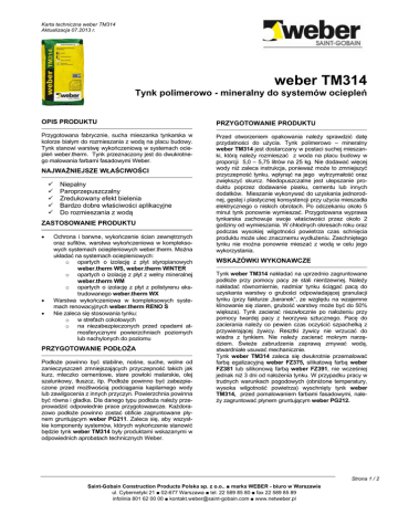 Karta techniczna weber TM314 Aktualizacja 07.2013 r. weber TM314 Tynk polimerowo - mineralny do systemów ociepleń OPIS PRODUKTU PRZYGOTOWANIE PRODUKTU Przygotowana fabrycznie, sucha mieszanka tynkarska w kolorze białym do rozmieszania z wodą na placu budowy. Tynk stanowi warstwę wykończeniową w systemach ociepleń weber.therm. Tynk przeznaczony jest do dwukrotnego malowania farbami fasadowymi Weber. Przed otworzeniem opakowania należy sprawdzić datę przydatności do użycia. Tynk polimerowo – mineralny weber TM314 jest dostarczany w postaci suchej mieszanki, którą należy rozmieszać z woda na placu budowy w proporcji 5,0 – 5,75 litrów na 25 kg. Nie dodawać więcej wody niż zaleca instrukcja, ponieważ może to zmniejszyć przyczepność tynku, wpłynąć na jego wytrzymałość oraz zwiększyć skurcz. Niedopuszczalne jest ulepszanie produktu poprzez dodawanie piasku, cementu lub innych dodatków. Mieszanie wykonywać do uzyskania jednorodnej, gęstej i plastycznej konsystencji przy użycia mieszadła elektrycznego o niskich obrotach. Po odczekaniu około 5 minut tynk ponownie wymieszać. Przygotowana wyprawa tynkarska zachowuje swoje właściwości przez około 2 godziny od wymieszania. W chłodnych okresach roku oraz podczas wysokiej wilgotności powietrza czas schnięcia produktu może ulec znacznemu wydłużeniu. Zaschniętego tynku nie można ponownie mieszać z wodą w celu jego wykorzystania. NAJWAŻNIEJSZE WŁAŚCIWOŚCI Niepalny Paroprzepuszczalny Zredukowany efekt bielenia Bardzo dobre właściwości aplikacyjne Do rozmieszania z wodą ZASTOSOWANIE PRODUKTU Ochrona i barwne, wykończenie ścian zewnętrznych oraz sufitów, warstwa wykończeniowa w kompleksowych systemach ociepleniowych weber.therm. Można układać na systemach ociepleniowych: o opartych o izolację z płyt styropianowych weber.therm WS, weber.therm WINTER o opartych o izolację z płyt z wełny mineralnej weber.therm WM o opartych o izolację z płyt z polistyrenu ekstrudowanego weber.therm WX Warstwa wykończeniowa w kompleksowych systemach renowacyjnych weber.therm RENO S Nie zaleca się stosowania tynku: o w strefach cokołowych o na niezabezpieczonych przed opadami atmosferycznymi powierzchniach poziomych lub nachylonych do poziomu PRZYGOTOWANIE PODŁOŻA Podłoże powinno być stabilne, nośne, suche, wolne od zanieczyszczeń zmniejszających przyczepność takich jak kurz, mleczko cementowe, stare powłoki malarskie, olej szalunkowy, tłuszcz, itp. Podłoże powinno być zabezpieczone przed możliwością podciągania kapilarnego wody lub zawilgocenia z innych przyczyn. Powierzchnia powinna być równa i gładka. Dla danego typu podłoża należy przeprowadzić odpowiednie prace przygotowawcze. Każdorazowo podłoże powinno zostać obficie zagruntowane płynem gruntującym weber PG211. Zaleca się, aby wszystkie komponenty systemów, których wykończenie stanowić będzie tynk weber TM314 były produktami wskazanymi w odpowiednich aprobatach technicznych Weber. WSKAZÓWKI WYKONAWCZE Tynk weber TM314 nakładać na uprzednio zagruntowane podłoże przy pomocy pacy ze stali nierdzewnej. Należy nakładać równomiernie, nadmiar tynku ściągać pacą do uzyskania warstwy o grubości odpowiadającej granulacji tynku (przy fakturze „baranek”, ze względu na wzajemne klinowanie się ziaren, grubość warstwy może być do 50% większa). Tynk zacierać niezwłocznie po nałożeniu przy pomocy twardej pacy z tworzywa sztucznego. Pacę do zacierania należy co pewien czas oczyścić szpachelką z przywierającej żywicy. Resztki żywicy nie wrzucać do wiadra z tynkiem. Nie należy zacierać mokrym narzędziem. Świeże zabrudzenia zaprawą zmywać wodą, stwardniałe usuwać mechanicznie. Tynk weber TM314 zaleca się dwukrotnie przemalować farbą egalizacyjną weber FZ375, silikatową farbą weber FZ381 lub silikonową farbą weber FZ391, nie wcześniej jednak niż 3 dni od nałożenia tynku. W przypadku pracy w trudnych warunkach pogodowych (obniżone temperatury, wysoka wilgotność powietrza) wyschnięty tynk weber TM314, przed pomalowaniem farbami fasadowymi, należy zagruntować płynem gruntującym weber PG212. Strona 1 / 2 Saint-Gobain Construction Products Polska sp. z o.o.. ■ marka WEBER - biuro w Warszawie ul. Cybernetyki 21 ■ 02-677 Warszawa ■ tel. 22 589 85 80 ■ fax 22 589 85 89 infolinia 801 62 00 00 ■ [email protected] ■ www.netweber.pl Karta techniczna weber TM314 Aktualizacja 07.2013 r. WARUNKI PODCZAS STOSOWANIA I WIĄZANIA WYROBU W trakcie nakładania i wiązania tynku temperatura otoczenia i podłoża nie może być niższa niż: +5°C ani wyższa niż +25°C (w systemach weber.therm WS, weber.therm WM, weber.therm WX, weber.therm RENO S). +2°C ani wyższa niż +20°C (w systemie weber.therm WINTER) Wykonywaną wyprawę należy chronić przed bezpośrednim działaniem opadów atmosferycznych, aż do pełnego związania tynku. W trakcie nakładania tynku należy unikać wietrznej pogody, a także bezpośredniego działania promieni słonecznych na ścianę – takie warunki przyśpieszają wiązanie tynku, skracając znacznie czas otwarty nałożonej wyprawy i uniemożliwiając właściwe zatarcie. Czas całkowitego wiązania tynku w warunkach wysokiej wilgotności względnej powietrza i niskiej temperatury może się wydłużyć do kilku dni. DANE TECHNICZNE Gęstość nasypowa Temperatura stosowania weber.therm WS, weber.therm WX, weber SD030, weber.therm RENO S weber.therm WINTER Czas otwarty Zużycie masy tynkarskiej na równym podłożu Termin przydatności do użycia Kolorystyka Opakowania Systemy Dokument odniesienia 1,58 ±10% g/cm³ +5°C do +25°C MAGAZYNOWANIE I TRANSPORT Masę przewozić i przechowywać w oryginalnych, nieuszkodzonych opakowaniach. Tynk weber TM314 zachowuje swoje właściwości przez minimum 12 miesięcy od daty produkcji. Składować w suchym, przewiewnym miejscu. ŚRODKI BEZPIECZEŃSTWA Produkt zawiera cement oraz wapno. Pr