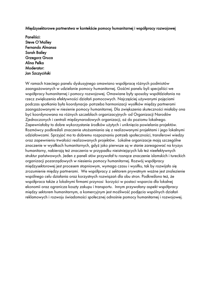 Międzysektorowe partnerstwa w kontekście pomocy humanitarnej i współpracy rozwojowej Paneliści: Steve O’Malley Fernando Almansa Sarah Bailey Grzegorz Gruca Alina Pelka Moderator: Jan Szczyciński W ramach trzeciego panelu dyskusyjnego omawiano współpracę różnych podmiotów zaangażowanych w udzielanie pomocy humanitarnej. Gośćmi panelu byli specjaliści we współpracy humanitarnej i pomocy rozwojowej. Omawiane były sposoby współdziałania na rzecz zwiększenia efektywności działań pomocowych. Najczęściej używanymi pojęciami podczas spotkania była koordynacja- potrzeba harmonizacji wysiłków między partnerami zaangażowanymi w niesienie pomocy humanitarnej. Dla zwiększenia skuteczności miałaby ona być koordynowana na różnych szczeblach organizacyjnych- od Organizacji Narodów Zjednoczonych i centrali międzynarodowych organizacji, aż do poziomu lokalnego. Zapewniałoby to dobre wykorzystanie środków użytych i uniknięcia powielania projektów. Rozmówcy podkreślali znaczenie utożsamiania się z realizowanymi projektami i jego lokalnymi udziałowcami. Sprzyjać ma to dobremu rozpoznaniu potrzeb społeczności, transferowi wiedzy oraz zapewnieniu trwałości realizowanych projektów. Lokalne organizacje mają szczególne znaczenie w wysiłkach humanitarnych, gdyż jako pierwsze są w stanie zareagować na kryzys humanitarny, nabierają też znaczenia w przypadku nieistniejących lub też nieefektywnych struktur państwowych. Jeden z paneli stów przywołał tu rosnące znaczenie islamskich i tureckich organizacji pozarządowych w niesieniu pomocy humanitarnej. Rozwój współpracy międzysektorowej jest procesem stopniowym, wymaga czasu i wysiłku, tak by rozwijało się zrozumienie między partnerami. We współpracy z sektorem prywatnym ważne jest znalezienie wspólnego celu działania oraz korzystnych rozwiązań dla obu stron. Podkreślono też, że współpraca także z lokalnymi firmami przynosi korzyści w postaci wsparcia dla lokalnej ekonomii oraz ogranicza koszty zakupu i transportu. Innym przywołany aspekt współpracy między sektorem humanitarnym, a komercyjnym jest możliwość podjęcia wspólnych działań reklamowych i rozwoju świadomości społecznej odnośnie pomocy humanitarnej i rozwojowej.