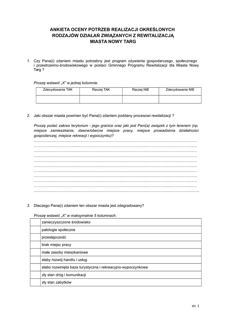 ANKIETA OCENY POTRZEB REALIZACJI OKREŚLONYCH RODZAJÓW DZIAŁAŃ ZWIĄZANYCH Z REWITALIZACJĄ MIASTA NOWY TARG 1. Czy Pana(i) zdaniem miastu potrzebny jest program ożywienia gospodarczego, społecznego i przestrzenno-środowiskowego w postaci Gminnego Programu Rewitalizacji dla Miasta Nowy Targ ? Proszę wstawić „X” w jednej kolumnie. Zdecydowanie TAK Raczej TAK Raczej NIE Zdecydowanie NIE 2. Jaki obszar miasta powinien być Pana(i) zdaniem poddany procesowi rewitalizacji ? Proszę podać zakres terytorium - jego granice oraz jaki jest Pani(a) związek z tym terenem (np. miejsce zamieszkania, dawne/obecne miejsce pracy, miejsce prowadzenia działalności gospodarczej, miejsce rekreacji i wypoczynku)? ………………………………………………………………………………………………………………… ………………………………………………………………………………………………………………… ………………………………………………………………………………………………………………… ………………………………………………………………………………………………………………… ………………………………………………………………………………………………………………… ………………………………………………………………………………………………………………… ………………………………………………………………………………………………………………… ………………………………………………………………………………………………………………… ………………………………………………………………………………………………………………… ………………………………………………………………………………………………………………… ………………………………………………………………………………………………………………….. 3. Dlaczego Pana(i) zdaniem ten obszar miasta jest zdegradowany? Proszę wstawić „X” w maksymalnie 5 kolumnach. zanieczyszczone środowisko patologie społeczne przestępczość brak miejsc pracy małe zasoby mieszkaniowe słaby rozwój handlu i usług słabo rozwinięta baza turystyczna i rekreacyjno-wypoczynkowa zły stan dróg i komunikacji zły stan zabytków str. 1 4. Jakie problemy ekonomiczne, na wskazanym obszarze, chciałby Pan(i) rozwiązać w procesie rewitalizacji ? Proszę wstawić „X” w maksymalnie 5 kolumnach. brak miejsc pracy brak, lub zła jakość terenów inwestycyjnych brak lub zbyt mała ilość połączeń komunikacyjnych z innymi ośrodkami brak wsparcia dla małych i średnich przedsiębiorstw zła gospodarka odpadami, ściekami niewystarczająca ilość i niski standard mieszkań zły stan zabytków słaby rozwój handlu niewielka ilość (mała aktywność) małych i średnich przedsiębiorstw Inne (wpisać jakie) 5. Jakie problemy społeczne, na wskazanym obszarze, chciałby Pan(i) rozwiązać w procesie rewitalizacji ? Proszę wstawić „X” w maksymalnie 6 kolumnach. przestępczość bezrobocie bieda alkoholizm przemoc w rodzinie narkomania przestępczość młodocianych chuligaństwo utrudniony dostęp społeczeństwa do dobrych szkół niedobór organizacji pomagających w znalezieniu pracy (przekwalifikowanie, szkolenia) brak dostępu do nowoczesnej technologii (komputer, internet) emigracja ludzi młodych i dobrze wykształconych str. 2 6. Jakie problemy związane z jakością życia, na wskazanym obszarze, chciałby Pan(i) rozwiązać w procesie rewitalizacji ? Proszę wstawić „X” w maksymalnie 4 kolumnach. zły stan estetyczny otoczenia zły stan infrastruktury wokół budynków brak instytucji, organizacji integrujących mieszkańców danych osiedli brak lub słaba aktywność ośrodków kulturalno-rekreacyjnych i sportowych w pobliżu miejsca zamieszkania brak poczucia bezpieczeństwa w okolicy zamieszkania słaby przepływ informacji w sprawach dotyczących najbliższego otoczenia zamieszkania słaba samoorganizacja społeczna i współpraca między mieszkańcami a władzami publicznymi 7. Jakie zostaną osiągnięte efekty, według Pana(i), w procesie rewitalizacji ? Proszę wstawić „X” w maksymalnie 6 kolumnach. bardziej wykształcone społeczeństwo poprawa bezpieczeństwa na ulicach zwiększenie ilości miejsc pracy przyciągnięcie dużych inwestorów rozwój małej i średniej przedsiębiorczości stworzenie lub rozszerzenie bazy turystycznej poprawienie jakości i estetyki środowiska naturalnego eliminacja patologii w społeczeństwie podniesienie standardu życia społeczeństwa zatrzymanie w mieście ludzi młodych i wykształconych polepszenie komunikacji na terenie miasta Nowy Targ zwiększenie ilości i poprawa jakości punktów handlowych, rzemieślniczych i usługowych. 8. Na jakie przedsięwzięcia, które zamierzałby Pan(i) zrealizować w ramach programu rewitalizacji, chciałby Pan(i) otrzymać wsparcie finansowe ? ………………………………………………………………………………………………………………… ………………………………………………………………………………………………………………… ………………………………………………………………………………………………………………… ………………………………………………………………………………………………………………… ………………………………………………………………………………………………………………… …………………………………………………………………………………………………....................... ..................