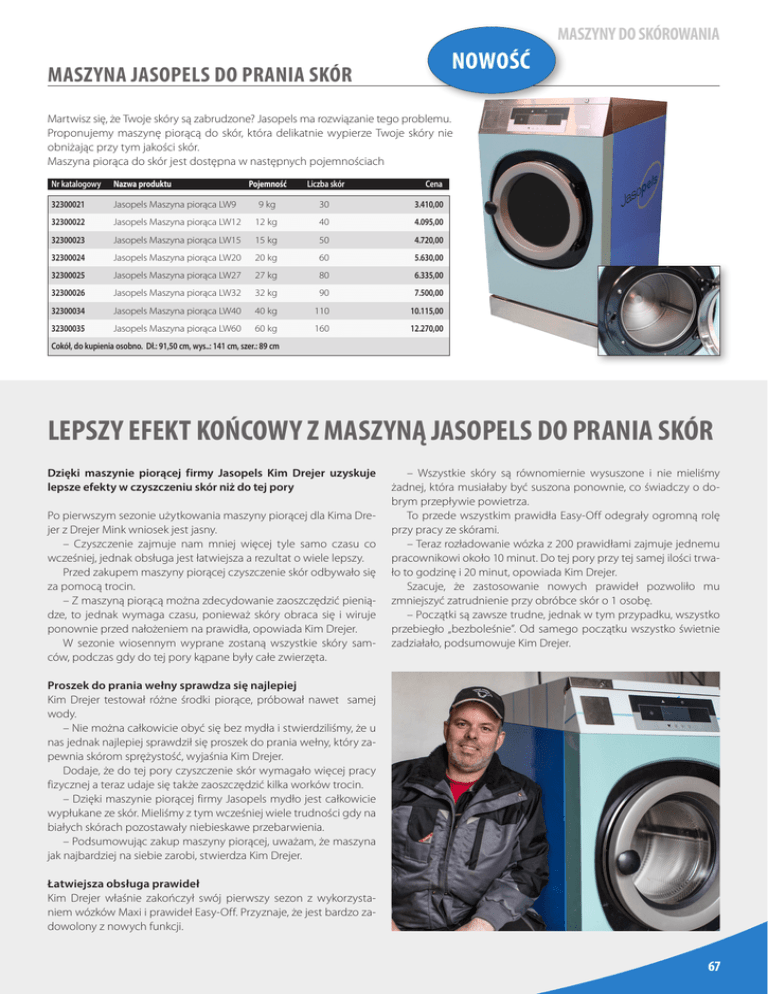 MASZYNY DO SKÓROWANIA NOWOŚĆ MASZYNA JASOPELS DO PRANIA SKÓR Martwisz się, że Twoje skóry są zabrudzone? Jasopels ma rozwiązanie tego problemu. Proponujemy maszynę piorącą do skór, która delikatnie wypierze Twoje skóry nie obniżając przy tym jakości skór. Maszyna piorąca do skór jest dostępna w następnych pojemnościach Nazwa produktu Pojemność Liczba skór 32300021 Jasopels Maszyna piorąca LW9 9 kg 30 32300022 Jasopels Maszyna piorąca LW12 12 kg 404.095,00 32300023 Jasopels Maszyna piorąca LW15 15 kg 504.720,00 32300024 Jasopels Maszyna piorąca LW20 20 kg 605.630,00 32300025 Jasopels Maszyna piorąca LW27 27 kg 806.335,00 32300026 Jasopels Maszyna piorąca LW32 32 kg 907.500,00 32300034 Jasopels Maszyna piorąca LW40 40 kg 11010.115,00 32300035 Jasopels Maszyna piorąca LW60 60 kg 16012.270,00 Nr katalogowy Cena 3.410,00 Cokół, do kupienia osobno. Dł.: 91,50 cm, wys..: 141 cm, szer.: 89 cm LEPSZY EFEKT KOŃCOWY Z MASZYNĄ JASOPELS DO PRANIA SKÓR Dzięki maszynie piorącej firmy Jasopels Kim Drejer uzyskuje lepsze efekty w czyszczeniu skór niż do tej pory Po pierwszym sezonie użytkowania maszyny piorącej dla Kima Drejer z Drejer Mink wniosek jest jasny. – Czyszczenie zajmuje nam mniej więcej tyle samo czasu co wcześniej, jednak obsługa jest łatwiejsza a rezultat o wiele lepszy. Przed zakupem maszyny piorącej czyszczenie skór odbywało się za pomocą trocin. – Z maszyną piorącą można zdecydowanie zaoszczędzić pieniądze, to jednak wymaga czasu, ponieważ skóry obraca się i wiruje ponownie przed nałożeniem na prawidła, opowiada Kim Drejer. W sezonie wiosennym wyprane zostaną wszystkie skóry samców, podczas gdy do tej pory kąpane były całe zwierzęta. – Wszystkie skóry są równomiernie wysuszone i nie mieliśmy żadnej, która musiałaby być suszona ponownie, co świadczy o dobrym przepływie powietrza. To przede wszystkim prawidła Easy-Off odegrały ogromną rolę przy pracy ze skórami. – Teraz rozładowanie wózka z 200 prawidłami zajmuje jednemu pracownikowi około 10 minut. Do tej pory przy tej samej ilości trwało to godzinę i 20 minut, opowiada Kim Drejer. Szacuje, że zastosowanie nowych prawideł pozwoliło mu zmniejszyć zatrudnienie przy obróbce skór o 1 osobę. – Początki są zawsze trudne, jednak w tym przypadku, wszystko przebiegło „bezboleśnie”. Od samego początku wszystko świetnie zadziałało, podsumowuje Kim Drejer. Proszek do prania wełny sprawdza się najlepiej Kim Drejer testował różne środki piorące, próbował nawet samej wody. – Nie można całkowicie obyć się bez mydła i stwierdziliśmy, że u nas jednak najlepiej sprawdził się proszek do prania wełny, który zapewnia skórom sprężystość, wyjaśnia Kim Drejer. Dodaje, że do tej pory czyszczenie skór wymagało więcej pracy fizycznej a teraz udaje się także zaoszczędzić kilka worków trocin. – Dzięki maszynie piorącej firmy Jasopels mydło jest całkowicie wypłukane ze skór. Mieliśmy z tym wcześniej wiele trudności gdy na białych skórach pozostawały niebieskawe przebarwienia. – Podsumowując zakup maszyny piorącej, uważam, że maszyna jak najbardziej na siebie zarobi, stwierdza Kim Drejer. Łatwiejsza obsługa prawideł Kim Drejer właśnie zakończył swój pierwszy sezon z wykorzystaniem wózków Maxi i prawideł Easy-Off. Przyznaje, że jest bardzo zadowolony z nowych funkcji. 67