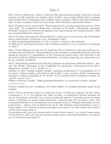 Lista 3 Zad.1. Pewien człowiek ma n kluczy, z których tylko jeden pasuje do zamka. Z przyczyn, których możemy się tylko domyślać, nie pamięta, który to klucz, więc wyciąga kolejno klucze i próbuje nimi otworzyć drzwi. Niepasujący klucz odkłada i bierze następny. Obliczyć prawdopodobieństwo tego, że trafi na właściwy klucz za k-tym razem. Wsk. Narysować odpowiednie drzewo. Zad.2. W puszce są trzy rodzaje losów. Wygrywających jest p, przegrywających q, jest też r losów „graj dalej”. Po wyciągnieciu takiego losu, wrzucamy go do puszki i dokonujemy ponownego losowania. Losujemy do momentu wyciągnięcia losu wygrywającego albo przegrywajacego. Jakie jest prawdopodobieństwo wygranej? Zad.3. W zbiorze 100 monet jest 99 prawdziwych, a jedna ma po obu stronach orły. Wybraliśmy losowo jedną monetę i rzucili nią 5 razy, otrzymując 5 orłów. a) Jakie jest prawdopodobieństwo, że jest to moneta z orłami po obu stronach? b) Jakie jest to prawdopodobieństwo, gdy dodatkowo rzucimy 15 razy tą monetą i otrzymamy 15 orłów? Zad.4. Pewną bakterią zarażone jest 5% populacji. Test do badania jej obecności wykrywa rzeczywistą obecność bakterii w 99 przypadkach na 100, natomiast w przypadku jej braku stwierdza jednak jej obecność w 5 przypadkach na 100. Wylosowano jedną osobę i test stwierdził u niej obecność tej bakterii. Obliczyć prawdopodobieństwo, że tak jest naprawdę, tzn. wylosowana osoba jest zarażona tą bakterią. Zad.5. Telegraficzne przekazywanie informacji polegało na przesyłaniu alfabetem Morse’a „kropek” lub „kresek”. Zauważmy, że jest to dokładnie ten sam sposób, z którego korzystamy dziś w informatyce: „kropka” to 0, a „kreska” to 1. Załóżmy, że przy wysłaniu sygnału „kropka” następuje przekłamanie w 2 przypadkach na 15 (to znaczy wysłano kropkę, a odczytano to jako kreskę), a przy wysłaniu „kreski” przekłamanie następuje w jednym przypadku na 10. Wiemy też, że stosunek liczby wysyłanych „kropek” do „kresek” wynosi 5 do 3. Odbiorca otrzymał „kropkę”. Oblicz prawdopodobieństwo, że rzeczywiście wysłano „kropkę”. *************** Poniższe zadanie jest nieco trudniejsze, ale bardzo ciekawe, bo istnieją teleturnieje oparte na tej zasadzie. Zad.6. Pewien teleturniej polega na wybieraniu bramy, za którą jest nagroda. Są trzy bramy, z numerami 1, 2 i 3, ale nagroda jest tylko za jedną, za pozostałymi dwiema bramami nie ma nic. Prowadzący oczywiście wie, za którą bramą jest nagroda. Uczestnik wybrał już bramę numer 2. Ponieważ nie mamy żadnej informacji, a nagroda może być za każdą z bram, więc prawdopodobieństwo, że za bramą numer 2 jest nagroda wynosi 13 . Następnie prowadzący otwiera jedną bramę — jedną z tych, za którymi nie ma nic. Dla ustalenia uwagi powiedzmy, że jest to brama numer 1. Po otwarciu tej bramy prowadzący pyta gracza, czy chce zmienić swój wybór i wybrać teraz bramę numer 3. Co powinien zrobić gracz tzn. pozostać przy wyborze bramy numer 2, czy wybrać bramę numer 3? Innymi słowy: jakie jest teraz (po otwarciu bramy numer 1) prawdopodobieństwo, że nagroda jest za wybraną bramą numer 2?