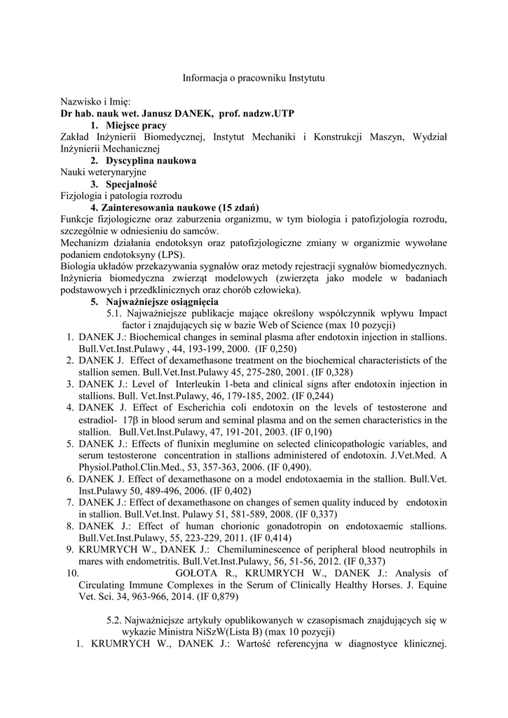 Informacja o pracowniku Instytutu Nazwisko i Imię: Dr hab. nauk wet. Janusz DANEK, prof. nadzw.UTP 1. Miejsce pracy Zakład Inżynierii Biomedycznej, Instytut Mechaniki i Konstrukcji Maszyn, Wydział Inżynierii Mechanicznej 2. Dyscyplina naukowa Nauki weterynaryjne 3. Specjalność Fizjologia i patologia rozrodu 4. Zainteresowania naukowe (15 zdań) Funkcje fizjologiczne oraz zaburzenia organizmu, w tym biologia i patofizjologia rozrodu, szczególnie w odniesieniu do samców. Mechanizm działania endotoksyn oraz patofizjologiczne zmiany w organizmie wywołane podaniem endotoksyny (LPS). Biologia układów przekazywania sygnałów oraz metody rejestracji sygnałów biomedycznych. Inżynieria biomedyczna zwierząt modelowych (zwierzęta jako modele w badaniach podstawowych i przedklinicznych oraz chorób człowieka). 5. Najważniejsze osiągnięcia 5.1. Najważniejsze publikacje mające określony współczynnik wpływu Impact factor i znajdujących się w bazie Web of Science (max 10 pozycji) 1. DANEK J.: Biochemical changes in seminal plasma after endotoxin injection in stallions. Bull.Vet.Inst.Pulawy , 44, 193-199, 2000. (IF 0,250) 2. DANEK J. Effect of dexamethasone treatment on the biochemical characteristicts of the stallion semen. Bull.Vet.Inst.Pulawy 45, 275-280, 2001. (IF 0,328) 3. DANEK J.: Level of Interleukin 1-beta and clinical signs after endotoxin injection in stallions. Bull. Vet.Inst.Pulawy, 46, 179-185, 2002. (IF 0,244) 4. DANEK J. Effect of Escherichia coli endotoxin on the levels of testosterone and estradiol- 17 in blood serum and seminal plasma and on the semen characteristics in the stallion. Bull.Vet.Inst.Pulawy, 47, 191-201, 2003. (IF 0,190) 5. DANEK J.: Effects of flunixin meglumine on selected clinicopathologic variables, and serum testosterone concentration in stallions administered of endotoxin. J.Vet.Med. A Physiol.Pathol.Clin.Med., 53, 357-363, 2006. (IF 0,490). 6. DANEK J. Effect of dexamethasone on a model endotoxaemia in the stallion. Bull.Vet. Inst.Pulawy 50, 489-496, 2006. (IF 0,402) 7. DANEK J.: Effect of dexamethasone on changes of semen quality induced by endotoxin in stallion. Bull.Vet.Inst. Pulawy 51, 581-589, 2008. (IF 0,337) 8. DANEK J.: Effect of human chorionic gonadotropin on endotoxaemic stallions. Bull.Vet.Inst.Pulawy, 55, 223-229, 2011. (IF 0,414) 9. KRUMRYCH W., DANEK J.: Chemiluminescence of peripheral blood neutrophils in mares with endometritis. Bull.Vet.Inst.Pulawy, 56, 51-56, 2012. (IF 0,337) 10. GOŁOTA R., KRUMRYCH W., DANEK J.: Analysis of Circulating Immune Complexes in the Serum of Clinically Healthy Horses. J. Equine Vet. Sci. 34, 963-966, 2014. (IF 0,879) 5.2. Najważniejsze artykuły opublikowanych w czasopismach znajdujących się w wykazie Ministra NiSzW(Lista B) (max 10 pozycji) 1. KRUMRYCH W., DANEK J.: Wartość referencyjna w diagnostyce klinicznej. Med.Weter., 49, 421-422, 1993. (pkt. 10) 2. DANEK J., WIŚNIEWSKI E., KRUMRYCH W., DĄBROWSKI J.: Changes in the qualities of stallion semen after incubation with Streptococcus zooepidemicus. Bull.Vet.Inst.Pulawy, 40, 111-116, 1996. (pkt. 15) 3. KRUMRYCH W., DANEK J.: Zastosowanie analizatora biochemicznego Kodak Ektachem DT 60 System w diagnostyce laboratoryjnej u koni. Med.Weter., 53, 351-354, 1997. (pkt. 10) 4. DANEK J., WIŚNIEWSKI E., KRUMRYCH W.: Wpływ dodatku wapnia i cynku na wskaźniki hematologiczne i biochemiczne krwi ogierów. Med.Weter., 53, 351-354, 1997. (pkt. 10) 5. DANEK J.: The effect of zinc supplementation on zinc content in blood serum and seminal plasma and on the quality of stallion semen. Pferdeheilkunde 14, 231-240, 1998. (pkt. 10) 6. DANEK J.: Hematologiczne i biochemiczne zmiany u ogierów po podaniu endotoksyny. Med.Weter., 61, 212-215, 2005. (pkt. 10) 7. DANEK J.: Wpływ deksametazonu na stężenie testosteronu, estronu i 17-estradiolu oraz na biochemiczne wskaźniki w nasieniu ogierów. Med.Weter., 61, 335-337, 2005. (pkt. 10) 8. DANEK J.: Wpływ endotoksyny i fluniksyny na wskaźniki krwi u ogierów Med.Weter., 2005, 61, 1395-1399. (pkt. 10) 9. DANEK J..: Wpływ lipopolisacharydu i fluniksyny na stężenie steroidów płciowych i biochemiczne wskaźniki nasienia ogierów. Med.Weter., 62, 713-716, 2006. (pkt. 10) 10. DANEK J..: Wpływ deksametazonu na wybrane steroidy płciowe i biochemiczne wskaźniki w nasieniu ogierów po podaniu LPS. Med.Weter., 63, 348-352, 2007. (pkt. 10) 5.3. Uzyskane Patenty (5 najważniejszych) 5.4. Publikacje książkowe i monografie (5 najważniejszych) a/ Monografie 11. DANEK J. .: Wpływ endotoksyny i niesterydowego leku przeciwzapalnego na sterydogenezę i jakość nasienia ogierów. Rozprawa habilitacyjna. Wydawnictwo PIWet Puławy, 1999. b/ Rozdziały monograficzne 12. KRUMRYCH W., KUCZYŃSKA I., GEHRKE M., DANEK J.: Einflu wiederholbaren Injektion von LPS E. coli auf den Gehalt von Fe, Zn und Cu in Blutserum der Pferde. Mengen-und Spuren- und Ultraspurenelemente in der Prevention. WVG Stuttgart, 2001. 13. DANEK J.: Zmiany u ogierów poddanych wpływowi endotoksyny. W: Zaburzenia w rozrodzie zwierząt. red. E. Malinowski, A. Kłosowska, J. Twardoń. Wydawnictwo. PIWet Puławy, 2003. 14. DANEK J.: The problem of endotoxemia in the reproduction of horses. In: Eliminating agricultural risk to health and environment-indicators for future. Ed. A. Myczko. Scientific Network, Poznań, 2003. 1. 2. 3. 4. 5. 5.5. Prestiżowe nagrody i wyróżnienia (5 najważniejszych) Nagroda i wyróżnienie Dyrektora oraz Rady Naukowej Instytutu Weterynaryjnego w Puławach za pracę doktorską, Puławy 1991. Wyróżnienie Polskiego Towarzystwa Nauk Weterynaryjnych za pracę opublikowaną w J. Vet.Med. A Physiol.Pathol.Clin.Med. w 2006 r. Nagroda Prezydenta Miasta Bydgoszczy za aktywne kształtowanie renomy lokalnego środowiska akademickiego, wkład w rozwój nauki oraz lata specjalistycznej praktyki, Bydgoszcz, 2008 r. Nagroda J.M. Rektora UTP w Bydgoszczy za działalność dydaktyczną w 2009 r. Medal 40-lecia Wydziału Hodowli i Biol