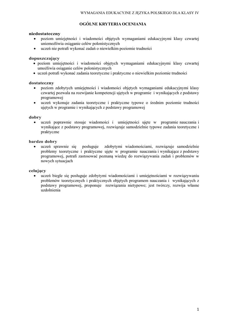 WYMAGANIA EDUKACYJNE Z JĘZYKA POLSKIEGO DLA KLASY IV OGÓLNE KRYTERIA OCENIANIA niedostateczny • poziom umiejętności i wiadomości objętych wymaganiami edukacyjnymi klasy czwartej uniemożliwia osiąganie celów polonistycznych • uczeń nie potrafi wykonać zadań o niewielkim poziomie trudności dopuszczający • poziom umiejętności i wiadomości objętych wymaganiami edukacyjnymi klasy czwartej umożliwia osiąganie celów polonistycznych • uczeń potrafi wykonać zadania teoretyczne i praktyczne o niewielkim poziomie trudności dostateczny • poziom zdobytych umiejętności i wiadomości objętych wymaganiami edukacyjnymi klasy czwartej pozwala na rozwijanie kompetencji ujętych w programie i wynikających z podstawy programowej • uczeń wykonuje zadania teoretyczne i praktyczne typowe o średnim poziomie trudności ujętych w programie i wynikających z podstawy programowej dobry • uczeń poprawnie stosuje wiadomości i umiejętności ujęte w programie nauczania i wynikające z podstawy programowej, rozwiązuje samodzielnie typowe zadania teoretyczne i praktyczne bardzo dobry • uczeń sprawnie się posługuje zdobytymi wiadomościami, rozwiązuje samodzielnie problemy teoretyczne i praktyczne ujęte w programie nauczania i wynikające z podstawy programowej, potrafi zastosować poznaną wiedzę do rozwiązywania zadań i problemów w nowych sytuacjach celujący • uczeń biegle się posługuje zdobytymi wiadomościami i umiejętnościami w rozwiązywaniu problemów teoretycznych i praktycznych objętych programem nauczania i wynikających z podstawy programowej, proponuje rozwiązania nietypowe; jest twórczy, rozwija własne uzdolnienia 1 WYMAGANIA EDUKACYJNE Z JĘZYKA POLSKIEGO DLA KLASY IV SZCZEGÓŁOWE KRYTERIA OCENIANIA DLA KLASY IV Ocenę niedostateczną otrzymuje uczeń, który nie spełnia wymagań kryterialnych na dopuszczającą. ocenę Ocenę dopuszczającą otrzymuje uczeń, który: I. ODBIÓR WYPOWIEDZI I WYKORZYSTYWANIE ZAWARTYCH W NICH INFORMACJI SŁUCHANIE • skupia uwagę na krótkich wypowiedziach innych osób • reaguje na wypowiedzi innych werbalnie i niewerbalnie (mimiką, gestem, • postawą) • rozumie polecenia nauczyciela, wypowiedzi innych uczniów • rozpoznaje proste intencje nadawcy, np. pytanie, prośbę, odmowę, zaproszenie, przeprosiny • wskazuje najważniejsze informacje w wysłuchanym niedługim tekście, zwłaszcza w jego warstwie dosłownej • rozumie ogólny sens słuchanych utworów CZYTANIE • identyfikuje nadawcę i odbiorcę wypowiedzi w prostych tekstach literackich oraz typowych sytuacjach znanych uczniowi z doświadczenia i obserwacji • rozpoznaje proste intencje nadawcy, np. pytanie, prośbę, odmowę, zaproszenie, przeprosiny • wskazuje najważniejsze informacje w przeczytanym tekście, zwłaszcza w dosłownej warstwie tekstu i wyrażone wprost • rozumie dosłowne znaczenie wyrazów w wypowiedzi • rozumie ogólny sens czytanych utworów • stara się czytać teksty płynnie i poprawnie pod względem artykulacyjnym DOCIERANIE DO INFORMACJI • sprawdza pisownię wyrazu w słowniku ortograficznym II. ANALIZA I INTERPRETACJA TEKSTÓW KULTURY • mówi o swoich reakcjach czytelniczych • odróżnia fikcję od rzeczywistości • odróżnia elementy fantastyczne od realistycznych • określa wybrane elementy świata przedstawionego w utworze epickim, takie jak: miejsce, bohaterowie, zdarzenia • zna cechy baśni i legendy • wyodrębnia film i spektakl spośród innych przekazów i tekstów kultur czas, III. TWORZENIE WYPOWIEDZI MÓWIENIE • nawiązuje i podtrzymuje kontakt werbalny z innymi uczniami i nauczycielem • formułuje proste pytania i udziela prostych pod względem konstrukcyjnym odpowiedzi • wypowiada komunikaty zawierające proste informacje • wyraża wprost swoje intencje • odróżnia sytuację oficjalną od nieoficjalnej i potrafi odpowiednio do sytuacji • komunikacyjnej skierować prośbę, pytanie, odmowę, wyjaśnienie, zaproszenie • stosuje podstawowe zwroty grzecznościowe podczas rozmowy z osobą dorosłą i rówieśnikiem • mówi na temat, opowiada o obserwowanych zdarzeniach, akcji książki, filmu • za pomocą kilku prostych zdań opisuje przedmiot, miejsce, krajobraz, postać, zwierzę • za pomocą kilku prostych zdań opisuje obraz, ilustrację, plakat • stosuje wyrazy o znaczeniu dosłownym 2 WYMAGANIA EDUKACYJNE Z JĘZYKA POLSKIEGO DLA KLASY IV • wygłasza tekst utworu z pamięci PISANIE • stosuje wielką literę na początku wypowiedzenia i odpowiednie znaki interpunkcyjne na jego końcu • zna podstawowe zasady dotyczące pisowni wielką literą oraz pisowni ó – u, rz – ż, ch – h • dzieli wyrazy na sylaby, przenosi wyraz do następnego wersu • tworzy proste wypowiedzi na podany temat • uzupełnia prosty schemat, tabelę • zna podstawowe zasady układu graficznego listu prywatnego, dialogu, zaproszenia, planu ramowego wypowiedzi i z pomocą nauczyciela zapisuje list, dialog, układa plan ramowy wypowiedzi, redaguje zaproszenie • zapisuje kilkuzdaniowe opowiadanie odtwórcze • za pomocą kilku prostych zdań tworzy opis przedmiotu, miejsca, krajobrazu,postaci, zwierzęcia • za pomocą kilku prostych zdań tworzy opis obrazu, ilustracji, plakatu • stosuje wiedzę językową w zakresie: słownictwa (np. dobiera wyrazy bliskoznaczne), składni (konstruuje poprawne zdania pojedyncze, stosuje wielkie litery na początku wypowiedzenia i odpowiednie znaki interpunkcyjne na końcu), fleksji (wskazuje czasowniki, rzeczowniki, przymiotniki i przysłówki w zdaniu, przy pomocy nauczyciela określa formę odmiennych części mowy), fonetyki (zna alfabet, dzieli wyrazy na litery, głoski i sylaby) • stara się o estetykę zapisu wypowiedzi Ocenę dostateczną otrzymuje uczeń, który spełnia wymagania kryterialne na ocenę dopuszczającą oraz: I. ODBIÓR WYPOWIEDZI I WYKORZYSTYWANIE ZAWARTYCH W NICH NFORMACJI SŁUCHANIE • słucha 