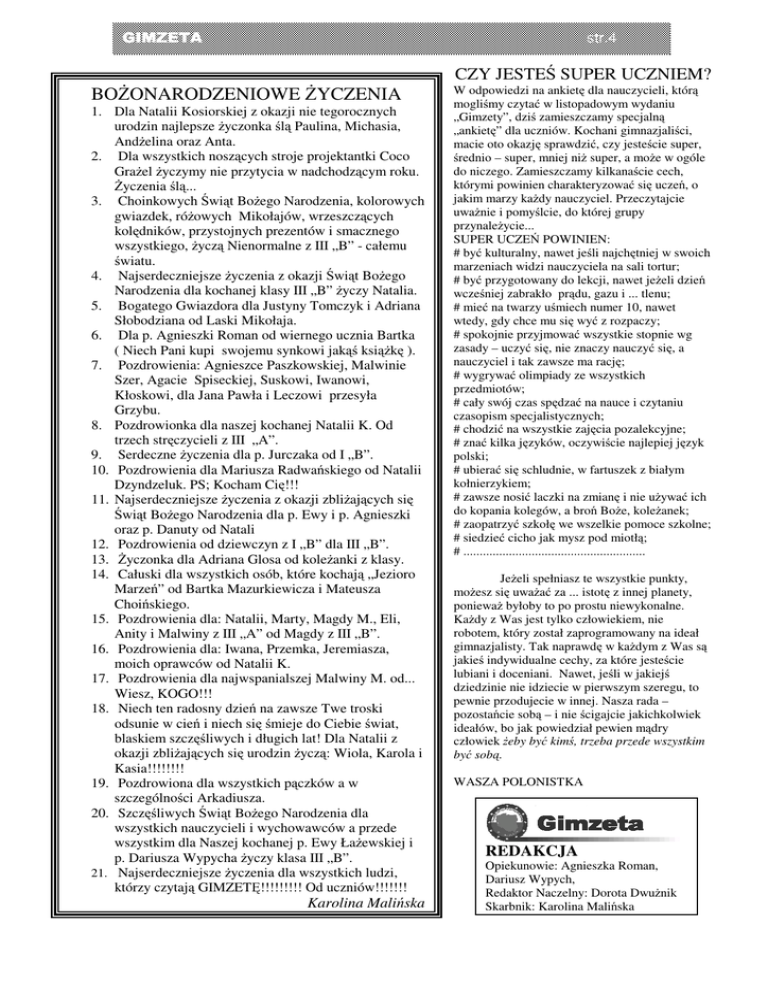 str.4 BO ONARODZENIOWE YCZENIA 1. Dla Natalii Kosiorskiej z okazji nie tegorocznych urodzin najlepsze yczonka l Paulina, Michasia, And elina oraz Anta. 2. Dla wszystkich nosz cych stroje projektantki Coco Gra el yczymy nie przytycia w nadchodz cym roku. yczenia l ... 3. Choinkowych wi t Bo ego Narodzenia, kolorowych gwiazdek, ró owych Mikołajów, wrzeszcz cych kol dników, przystojnych prezentów i smacznego wszystkiego, ycz Nienormalne z III „B” - całemu wiatu. 4. Najserdeczniejsze yczenia z okazji wi t Bo ego Narodzenia dla kochanej klasy III „B” yczy Natalia. 5. Bogatego Gwiazdora dla Justyny Tomczyk i Adriana Słobodziana od Laski Mikołaja. 6. Dla p. Agnieszki Roman od wiernego ucznia Bartka ( Niech Pani kupi swojemu synkowi jak ksi k ). 7. Pozdrowienia: Agnieszce Paszkowskiej, Malwinie Szer, Agacie Spiseckiej, Suskowi, Iwanowi, Kłoskowi, dla Jana Pawła i Leczowi przesyła Grzybu. 8. Pozdrowionka dla naszej kochanej Natalii K. Od trzech str czycieli z III „A”. 9. Serdeczne yczenia dla p. Jurczaka od I „B”. 10. Pozdrowienia dla Mariusza Radwa skiego od Natalii Dzyndzeluk. PS; Kocham Ci !!! 11. Najserdeczniejsze yczenia z okazji zbli aj cych si wi t Bo ego Narodzenia dla p. Ewy i p. Agnieszki oraz p. Danuty od Natali 12. Pozdrowienia od dziewczyn z I „B” dla III „B”. 13. yczonka dla Adriana Glosa od kole anki z klasy. 14. Całuski dla wszystkich osób, które kochaj „Jezioro Marze ” od Bartka Mazurkiewicza i Mateusza Choi skiego. 15. Pozdrowienia dla: Natalii, Marty, Magdy M., Eli, Anity i Malwiny z III „A” od Magdy z III „B”. 16. Pozdrowienia dla: Iwana, Przemka, Jeremiasza, moich oprawców od Natalii K. 17. Pozdrowienia dla najwspanialszej Malwiny M. od... Wiesz, KOGO!!! 18. Niech ten radosny dzie na zawsze Twe troski odsunie w cie i niech si mieje do Ciebie wiat, blaskiem szcz liwych i długich lat! Dla Natalii z okazji zbli aj cych si urodzin ycz : Wiola, Karola i Kasia!!!!!!!! 19. Pozdrowiona dla wszystkich p czków a w szczególno ci Arkadiusza. 20. Szcz liwych wi t Bo ego Narodzenia dla wszystkich nauczycieli i wychowawców a przede wszystkim dla Naszej kochanej p. Ewy Ła ewskiej i p. Dariusza Wypycha yczy klasa III „B”. 21. Najserdeczniejsze yczenia dla wszystkich ludzi, którzy czytaj GIMZET !!!!!!!!! Od uczniów!!!!!!! Karolina Mali ska CZY JESTE SUPER UCZNIEM? W odpowiedzi na ankiet dla nauczycieli, któr mogli my czyta w listopadowym wydaniu „Gimzety”, dzi zamieszczamy specjaln „ankiet ” dla uczniów. Kochani gimnazjali ci, macie oto okazj sprawdzi , czy jeste cie super, rednio – super, mniej ni super, a mo e w ogóle do niczego. Zamieszczamy kilkana cie cech, którymi powinien charakteryzowa si ucze , o jakim marzy ka dy nauczyciel. Przeczytajcie uwa nie i pomy lcie, do której grupy przynale ycie... SUPER UCZE POWINIEN: # by kulturalny, nawet je li najch tniej w swoich marzeniach widzi nauczyciela na sali tortur; # by przygotowany do lekcji, nawet je eli dzie wcze niej zabrakło pr du, gazu i ... tlenu; # mie na twarzy u miech numer 10, nawet wtedy, gdy chce mu si wy z rozpaczy; # spokojnie przyjmowa wszystkie stopnie wg zasady – uczy si , nie znaczy nauczy si , a nauczyciel i tak zawsze ma racj ; # wygrywa olimpiady ze wszystkich przedmiotów; # cały swój czas sp dza na nauce i czytaniu czasopism specjalistycznych; # chodzi na wszystkie zaj cia pozalekcyjne; # zna kilka j zyków, oczywi cie najlepiej j zyk polski; # ubiera si schludnie, w fartuszek z białym kołnierzykiem; # zawsze nosi laczki na zmian i nie u ywa ich do kopania kolegów, a bro Bo e, kole anek; # zaopatrzy szkoł we wszelkie pomoce szkolne; # siedzie cicho jak mysz pod miotł ; # ........................................................ Je eli spełniasz te wszystkie punkty, mo esz si uwa a za ... istot z innej planety, poniewa byłoby to po prostu niewykonalne. Ka dy z Was jest tylko człowiekiem, nie robotem, który został zaprogramowany na ideał gimnazjalisty. Tak naprawd w ka dym z Was s jakie indywidualne cechy, za które jeste cie lubiani i doceniani. Nawet, je li w jakiej dziedzinie nie idziecie w pierwszym szeregu, to pewnie przodujecie w innej. Nasza rada – pozosta cie sob – i nie cigajcie jakichkolwiek ideałów, bo jak powiedział pewien m dry człowiek eby by kim , trzeba przede wszystkim by sob . WASZA POLONISTKA REDAKCJA Opiekunowie: Agnieszka Roman, Dariusz Wypych, Redaktor Naczelny: Dorota Dwu nik Skarbnik: Karolina Mali ska