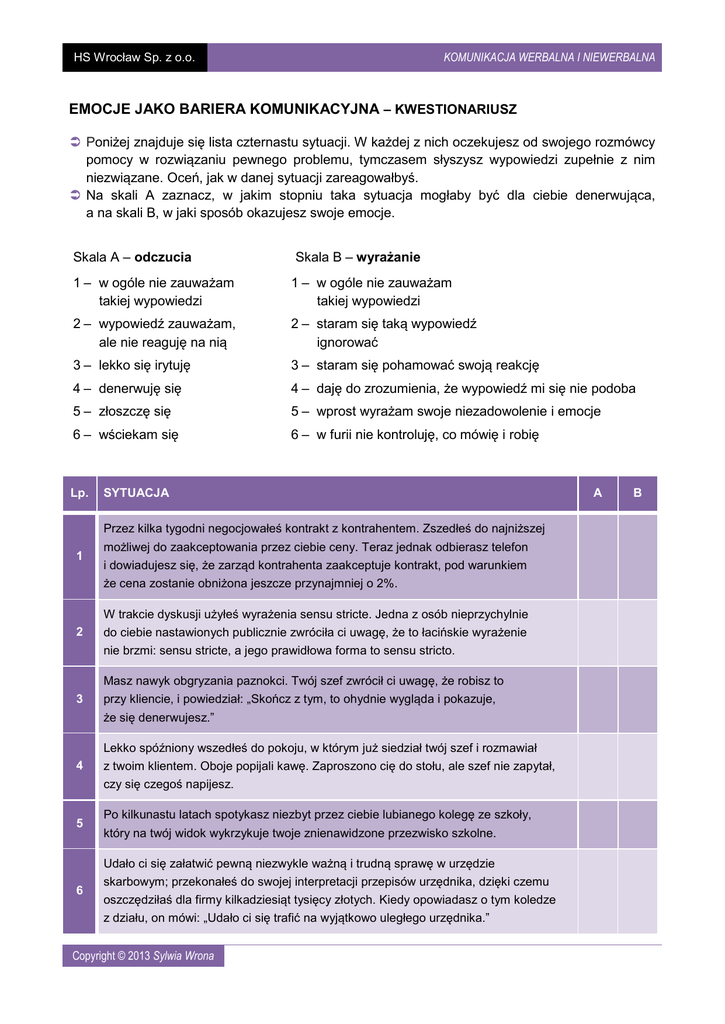 KOMUNIKACJA WERBALNA I NIEWERBALNA HS Wrocław Sp. z o.o. EMOCJE JAKO BARIERA KOMUNIKACYJNA – KWESTIONARIUSZ Poniżej znajduje się lista czternastu sytuacji. W każdej z nich oczekujesz od swojego rozmówcy pomocy w rozwiązaniu pewnego problemu, tymczasem słyszysz wypowiedzi zupełnie z nim niezwiązane. Oceń, jak w danej sytuacji zareagowałbyś. Na skali A zaznacz, w jakim stopniu taka sytuacja mogłaby być dla ciebie denerwująca, a na skali B, w jaki sposób okazujesz swoje emocje. Skala A – odczucia Skala B – wyrażanie 1 – w ogóle nie zauważam takiej wypowiedzi 1 – w ogóle nie zauważam takiej wypowiedzi 2 – wypowiedź zauważam, ale nie reaguję na nią 2 – staram się taką wypowiedź ignorować 3 – lekko się irytuję 3 – staram się pohamować swoją reakcję 4 – denerwuję się 4 – daję do zrozumienia, że wypowiedź mi się nie podoba 5 – złoszczę się 5 – wprost wyrażam swoje niezadowolenie i emocje 6 – wściekam się 6 – w furii nie kontroluję, co mówię i robię Lp. SYTUACJA Przez kilka tygodni negocjowałeś kontrakt z kontrahentem. Zszedłeś do najniższej 1 możliwej do zaakceptowania przez ciebie ceny. Teraz jednak odbierasz telefon i dowiadujesz się, że zarząd kontrahenta zaakceptuje kontrakt, pod warunkiem że cena zostanie obniżona jeszcze przynajmniej o 2%. W trakcie dyskusji użyłeś wyrażenia sensu stricte. Jedna z osób nieprzychylnie 2 do ciebie nastawionych publicznie zwróciła ci uwagę, że to łacińskie wyrażenie nie brzmi: sensu stricte, a jego prawidłowa forma to sensu stricto. Masz nawyk obgryzania paznokci. Twój szef zwrócił ci uwagę, że robisz to 3 przy kliencie, i powiedział: „Skończ z tym, to ohydnie wygląda i pokazuje, że się denerwujesz.” Lekko spóźniony wszedłeś do pokoju, w którym już siedział twój szef i rozmawiał 4 z twoim klientem. Oboje popijali kawę. Zaproszono cię do stołu, ale szef nie zapytał, czy się czegoś napijesz. 5 Po kilkunastu latach spotykasz niezbyt przez ciebie lubianego kolegę ze szkoły, który na twój widok wykrzykuje twoje znienawidzone przezwisko szkolne. Udało ci się załatwić pewną niezwykle ważną i trudną sprawę w urzędzie 6 skarbowym; przekonałeś do swojej interpretacji przepisów urzędnika, dzięki czemu oszczędziłaś dla firmy kilkadziesiąt tysięcy złotych. Kiedy opowiadasz o tym koledze z działu, on mówi: „Udało ci się trafić na wyjątkowo uległego urzędnika.” Copyright © 2013 Sylwia Wrona A B HS Wrocław Sp. z o.o. KOMUNIKACJA WERBALNA I NIEWERBALNA Realizacja projektu, jakim obecnie kierujesz, może zostać wstrzymana z powodu braku zamówień na produkt, który przygotowujesz wraz ze swoim zespołem. 7 Wracasz z zebrania kierowników projektów w niezbyt dobrym humorze, a twój kolega z pokoju mówi: „Nie przejmuj się, jutro wymyślisz coś równie dobrego. Wierzę w ciebie.” Chcesz sprzedać swój stary samochód, wysłałeś więc e-maile do znajomych, 8 oferując cenę o 10% niższą od tej, którą widziałeś na giełdzie. Jeden z nich mówi ci, że się wygłupiasz z tak wygórowaną ceną i że jeśli chcesz sprzedać auto, musisz obniżyć cenę co najmniej o połowę. Dwukrotnie nie udało ci się przyjść na spotkanie komisji programowej, do której 9 zostałeś zaproszony. Obiecałeś sobie, że na trzecie spotkanie na pewno pójdziesz. Tymczasem dowiadujesz się, że trzecie zebranie już się odbyło, a nikt cię o nim nie zawiadomił, gdyż uznano, że zrezygnowałeś z pracy w komisji. Jesteś w ślepym zaułku negocjacji związanych z wdrożeniem pewnego nowatorskiego rozwiązania. Rozwiązanie to może okazać się przełomem w działalności twojej firmy. Tymczasem w trakcie negocjacji twój współpracownik, 10 mając poparcie dyrektora finansowego podchodzącego do sprawy z rezerwą, mówi: „Rzeczywiście jest to rozwiązanie nowatorskie i jeśli wszystko się uda, będziemy mogli zdystansować konkurencję. Ale też rozwiązanie to jest obarczone dużym ryzykiem.” Podczas negocjacji, będąc pewny, że masz rację, proponujesz poddać pewną 11 drażliwą sprawę pod osąd wszystkich pracowników w drodze zakładowego referendum. Twój współpracownik krytykuje to rozwiązanie przy wszystkich negocjujących osobach, twierdząc, że jest to najszybsza droga do przegranej. Dużym nakładem pracy przygotowałeś skomplikowaną ekspertyzę, udowadniającą 12 konieczność wprowadzenia zmian w firmie i wskazującą możliwości naprawy sytuacji. Zauważasz, że na ostatecznej wersji raportu, która została rozesłana do wszystkich kierowników jednostek, wykreślono twoje nazwisko jako autora. Na prośbę szefa, po długich i żmudnych staraniach udało ci się w końcu znaleźć nową pracę dla nielubianego i ciągle niewywiązującego się z obowiązków 13 pracownika firmy. Możesz mu zagwarantować przejście do innego przedsiębiorstwa, w którym jego kompetencje będą lepiej wykorzystane. Tymczasem dowiadujesz się, że twój przełożony postanowił awansować go i przesunąć do innego działu, żeby wam więcej nie przeszkadzał. Z powodu kłopotów rodzinnych i kilku dni zwolnienia nie udało ci się w terminie 14 zakończyć realizowanego w firmie projektu, co skończyło się pewnymi stratami dla firmy, związanymi z koniecznością zapłacenia kar umownych. Szef wezwał cię i poprosił, abyś znalazł sobie inną pracę, bo nie ma już dla ciebie miejsca w firmie. Źródło: Stocki R.: Doskonalenie umiejętności negocjacyjnych, Wolters Kluwer Polska Sp. z o.o., 2005 Copyright © 2013 Sylwia Wrona