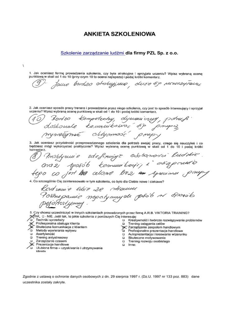 ANKIETA SZKOLENIOWA Szkolenie zarządzanie ludźmi dla firmy PZL Sp. z o.o. \ Zgodnie z ustawą o ochronie danych osobowych z dn. 29 sierpnia 1997 r. (Dz.U. 1997 nr 133 poz. 883) dane uczestnika zostały zakryte. Biznes Edukator Sp. z o.o. - profesjonalna firma szkoleniowa zaprasza do współpracy szkoleniowej Dlaczego warto z nami współpracować, jakie mamy atuty jako organizator szkoleń? Jako firma szkoleniowa prowadzimy działalność szkoleniowo-doradczą od 1999 roku (do roku 2004 pod nazwą Viktoria Training sp. z o.o.). Realizujemy szkolenia dla przedsiębiorstw i urzędów w całym kraju. Przeprowadzamy szkolenia dla pracowników i menedżerów (ponad 14550 osób stan na czerwiec 2012). Uczestnicy naszych szkoleń oceniali naszą pracę bardzo wysoko: ocena szkolenia pod względem formy i praktyczności – 9,08 (w skali 1 do 10), ocena trenera prowadzącego szkolenie – 9,17. Dzięki wysokiej jakości naszych szkoleń zostaliśmy dwukrotnym laureatem Certyfikatu ORGANIZATOR SZKOLEŃ NAJWYŻSZEJ JAKOŚCI Jako firma szkoleniowa jesteśmy członkiem – założycielem Polskiej Izby Firm Szkoleniowych (od 2007 roku). Jesteśmy uprawnieni do posługiwania się certyfikatem STANDARD USŁUGI SZKOLENIOWEJ nadawany przez Polską Izbę Firm Szkoleniowych (zbiór zasad realizacji szkoleń mających na celu utrzymanie ich wysokiej jakości) Jesteśmy wpisani pod numerem 2.14/00107/2011 do rejestru firm szkoleniowych prowadzonych przez Wojewódzki Urząd Pracy w Warszawie Mamy w swoim zespole szkoleniowym 18 ekspertów (trenerów, coachów, doradców, aktorów) – wszyscy mają duże doświadczenie biznesowe oraz szkoleniowe. Możemy prowadzić szkolenia biznesowe w języku angielskim i francuskim (oczywiście oprócz polskiego:) Mamy doświadczenia w realizacji szkoleń w projektach finansowych ze środków EFS Specjalizujemy się w tworzeniu orygianalnych i innowacyjnych gier szkoleniowych dopasowanych do potrzeb klienta (gry teambuildingowe, gry handlowe i negocjacyjne, gry z zarządzania czasem, gry integracyjne) Jak wszystkie firmy szkoleniowe prowadzimy interaktywne szkolenia warsztatowe, natomiast od połowy 2010 roku z powodzeniem wdrażamy nowe, znacznie bardziej skuteczne i praktyczne szkolenia: POLIGON HANDLOWY, POLIGON NEGOCJACYJNY, POLIGON PREZENTACYJNY, POLIGON MENEDŻERSKI. Jakie szkolenia możemy przeprowadzić? SZKOLENIA ZAMKNIĘTE szkolenia handlowe: szkolenie skuteczna sprzedaż, szkolenie telemarketing, szkolenie prezentacje handlowe, szkolenie negocjacje handlowe, szkolenie obsługa klienta, szkolenie zarządzanie czasem handlowca, szkolenie psychologia klienta, szkolenie techniki sprzedaży, szkolenie komunikacja z klientem, szkolenie windykacja, szkolenie przyjmowanie reklamacji, szkolenie zarządzanie sprzedażą, szkolenie emisja głosu; szkolenia menedżerskie: szkolenie zarządzanie ludźmi, szkolenie komunikacja z pracownikami, szkolenie negocjacje biznesowe dla menedżerów, szkolenie prezentacje i wystąpienia publiczne, szkolenie zarządzanie zmianą, szkolenie ocena okresowa, szkolenie zarządzanie zespołem w sytuacji kryzysowej, szkolenie rekrutacja i selekcja, szkolenie zarządzanie konfliktem w zespole, szkolenie coaching w pracy menedżera, szkolenie strategiczne myślenie, szkolenie feedback i komunikowanie trudnych rzeczy, szkolenie komunikacja kryzysowa; szkolenia z budowania zespołów: szkolenie motywacja zespołu, szkolenie komunikacja wewnętrzna, szkolenie teamwork, szkolenie integracyjne, szkolenie z teambuildingu, szkolenie budowanie współpracy, szkolenie synergia zespołu, szkolenie etapy rozwoju zespołu, szkolenie Ja w zespole; szkolenia rozwojowe: szkolenie zarządzanie czasem, szkolenie asertywność, szkolenie antystresowe, szkolenie zarządzanie emocjami, szkolenie komunikacja interpersonalna, szkolenie osiąganie celów, szkolenie autoprezentacja, szkolenie rozwiązywanie konfliktów, szkolenie kreatywność, szkolenie savoir-vivre i elegancja w biznesie, szkolenie train the trainer, szkolenie siła motywacji, szkolenie etyka w biznesie, szkolenie rozwój osobisty; SZKOLENIA OTWARTE: szkolenie ze sprzedaży, szkolenie z telemarketingu, szkolenie z obsługi klienta, szkolenie z prezentacji, szkolenie z negocjacji, szkolenie z zarządzania ludźmi, szkolenie z zarzadzania czasem, szkolenie zarzadzanie stresem, szkolenie z prezentacji i wystąpień publicznych, szkolenie ze skutecznej sprzedaży – psychologia klienta i techniki sprzedaży, , szkolenie z obsługi reklamacji i trudnego klienta, szkolenie z rekrutacji i selekcji, coaching dla menedżerów, szkolenie lidership, szkolenie z zarządzania zmianą, szkolenie z oceny okresowej, szkolenie z komunikacji organizacyjnej, szkolenie z zarządzania sszkolenie z savoir-vivre'u i elegancji w biznesie, szkolenie z komunikacji kryzysowej, szkolenie z komunikacji interpersonalnej, szkolenie z obsługi klienta, szkolenie ze sprzedaży i obsługi klienta w sklepieprzedażą; SZKOLENIA INDYWIDUALNE GRY SZKOLENIOWE: gra negocjacyjna, gra handlowa, gra z budowania zespołu, gra z zarządzania czasem, gra integracyjna, gra motywacyjna, gra teambuildingowa, gra komunikacyjna, gra z zarządzania zespołem, gra z zarządzania sytuacją kryzysową; POLIGONY SZKOLENIOWE: Poligon Handlowy (szkolenie sprzedażowe, szkolenie telemarketingowe, szkolenie negocjacyjne, szkolenie z obsługi klienta, szkolenie z prezentacji handlowych), Poligon Menedżerski (szkolenie komunikacyjne, szkolenie motywacyjne, szkolenie na temat zarządzania ludźmi), Poligon Prezentacyjny (szkolenie wystąpienia publiczne i prezentacje, szkolenie trenerskie) SZKOLENIA I IMPREZY INTEGRACYJNE ROZWIJAJ SIĘ I WYGRYWAJ! *** szkolenia biznesowe i rozwojowe *** ROZWIJAJ SIĘ I WYGRYWAJ!