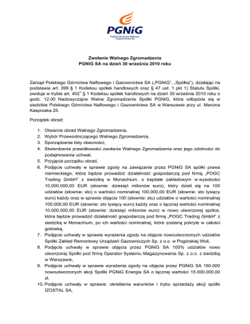 Zwołanie Walnego Zgromadzenia PGNiG SA na dzień 30 września 2010 roku Zarząd Polskiego Górnictwa Naftowego i Gazownictwa SA („PGNiG”, „Spółka”), działając na podstawie art. 399 § 1 Kodeksu spółek handlowych oraz § 47 ust. 1 pkt 1) Statutu Spółki, zwołuje w trybie art. 4021 § 1 Kodeksu spółek handlowych na dzień 30 września 2010 roku o godz. 12.00 Nadzwyczajne Walne Zgromadzenie Spółki PGNiG, które odbędzie się w siedzibie Polskiego Górnictwa Naftowego i Gazownictwa SA w Warszawie przy ul. Marcina Kasprzaka 25. Porządek obrad: 1. 2. 3. 4. Otwarcie obrad Walnego Zgromadzenia, Wybór Przewodniczącego Walnego Zgromadzenia, Sporządzenie listy obecności, Stwierdzenie prawidłowości zwołania Walnego Zgromadzenia oraz jego zdolności do podejmowania uchwał, 5. Przyjęcie porządku obrad, 6. Podjęcie uchwały w sprawie zgody na zawiązanie przez PGNiG SA spółki prawa niemieckiego, która będzie prowadzić działalność gospodarczą pod firmą „POGC Trading GmbH” z siedzibą w Monachium, o kapitale zakładowym w wysokości 10.000.000,00 EUR (słownie: dziesięć milionów euro), który dzieli się na 100 udziałów (słownie: sto) o wartości nominalnej 100.000,00 EUR (słownie: sto tysięcy euro) każdy oraz w sprawie objęcia 100 (słownie: stu) udziałów o wartości nominalnej 100.000,00 EUR (słownie: sto tysięcy euro) każdy oraz o łącznej wartości nominalnej 10.000.000,00 EUR (słownie: dziesięć milionów euro) w nowo utworzonej spółce, która będzie prowadzić działalność gospodarczą pod firmą „POGC Trading GmbH” z siedzibą w Monachium, po ich wartości nominalnej, które zostaną pokryte w całości gotówką, 7. Podjęcie uchwały w sprawie wyrażenia zgody na objęcie nowoutworzonych udziałów Spółki Zakład Remontowy Urządzeń Gazowniczych Sp. z o.o. w Pogórskiej Woli, 8. Podjęcie uchwały w sprawie objęcia przez PGNiG SA 100% udziałów nowo utworzonej Spółki pod firmą Operator Systemu Magazynowania Sp. z o.o. z siedzibą w Warszawie, 9. Podjęcie uchwały w sprawie wyrażenia zgody na objęcie przez PGNiG SA 150.000 nowoutworzonych akcji Spółki PGNiG Energia SA o łącznej wartości 15.000.000,00 zł, 10. Podjęcie uchwały w sprawie: określenia warunków i trybu sprzedaży akcji spółki IZOSTAL SA, 11. Sprawy różne, 12. Zamknięcie obrad Walnego Zgromadzenia. Akcjonariusz lub akcjonariusze reprezentujący co najmniej 1/20 kapitału zakładowego mogą żądać umieszczenia określonych spraw w porządku obrad tego Zgromadzenia. Żądanie takie winno być przesłane do Spółki na piśmie bądź w postaci elektronicznej na skrzynkę email: [email protected], w języku polskim oraz powinno zawierać uzasadnienie lub projekt uchwały dotyczącej proponowanego punktu porządku obrad. Żądanie powinno być zgłoszone Zarządowi nie później niż na 21 dni przed wyznaczonym terminem Walnego Zgromadzenia. Akcjonariusz lub akcjonariusze powinni udokumentować swe uprawnienie do wykonywania tego prawa, przedstawiając odpowiednie dokumenty w formie pisemnej. Akcjonariusz lub akcjonariusze Spółki reprezentujący co najmniej 1/20 kapitału zakładowego mogą przed terminem Walnego Zgromadzenia zgłaszać Spółce na piśmie lub drogą elektroniczną na skrzynkę e-mail: [email protected] projekty uchwał dotyczące spraw wprowadzonych do porządku obrad Walnego Zgromadzenia lub spraw, które mają zostać wprowadzone do porządku obrad. Projekty uchwał powinny być sporządzone w języku polskim w programie Word. Akcjonariusze powinni udokumentować swe uprawnienie do wykonywania tego prawa, przedstawiając odpowiednie dokumenty w formie pisemnej. Każdy akcjonariusz może podczas obrad Walnego Zgromadzenia zgłaszać projekty uchwał dotyczące spraw wprowadzonych do porządku obrad. Projekty te winny być przedstawione w języku polskim. Akcjonariusze mogą uczestniczyć w Walnym Zgromadzeniu osobiście lub przez pełnomocników. Zgodnie z art. 4121 § 2 ksh, pełnomocnictwo do uczestniczenia w Walnym Zgromadzeniu spółki publicznej i wykonywania prawa głosu wymaga udzielenia na piśmie. Pełnomocnictwo powinno być udzielone na piśmie lub w postaci elektronicznej. Pełnomocnictwo winno być sporządzone w języku polskim i może być przesłane do Spółki przed walnym zgromadzeniem w wersji elektronicznej w programie PDF na adres e-mail: [email protected]. W związku z tym, iż Spółka nie przewiduje możliwości uczestnictwa w Walnym Zgromadzeniu przy wykorzystaniu środków komunikacji elektronicznej (w tym wypowiadania się w trakcie Walnego Zgromadzenia przy wykorzystaniu środków komunikacji elektronicznej), wykonywania prawa głosu drogą korespondencyjną lub przy wykorzystaniu środków komunikacji elektronicznej, formularze do głosowania przez pełnomocników nie będą publikowane. Przedstawiciele osób prawnych powinni dysponować oryginałem lub poświadczoną przez notariusza kopią odpisu z właściwego rejestru (z ostatnich 3 miesięcy), a jeżeli ich prawo do reprezentowania nie wynika z rejestru, to powinni dysponować pisemnym pełnomocnictwem (w oryginale lub kopii poświadczonej przez notariusza) oraz aktualnym na dzień wydania pełnomocnictwa oryginałem lub poświadczoną przez notariusza kopią odpisu z właściwego rejestru. Akcjonariusze i pełnomocnicy powinni posiadać przy sobie dowód tożsamości. Dzień rejestracji uczestnictwa w Walnym Zgromadzeniu przypada na dzień 14 września 2010 roku. Prawo uczestnictwa w WZ mają tylko osoby będące akcjonariuszami w dniu rejestracji uczestnictwa w Walnym Zgromadzeniu tj. na szesnaście dni przed datą Walnego Zgromadzenia. Osoba uprawniona do uczestnictwa w Walnym Zgromadzeniu może uzyskać pełny tekst dokumentacji, która ma być przedstawiona Walnemu Zgromadzeniu oraz projekty uchwał lub uwagi Zarządu bądź Rady Nadzorczej w siedzibie Spółki Osoba uprawniona do uczestnictwa w Walnym Zgromadzeniu może uzyskać o
