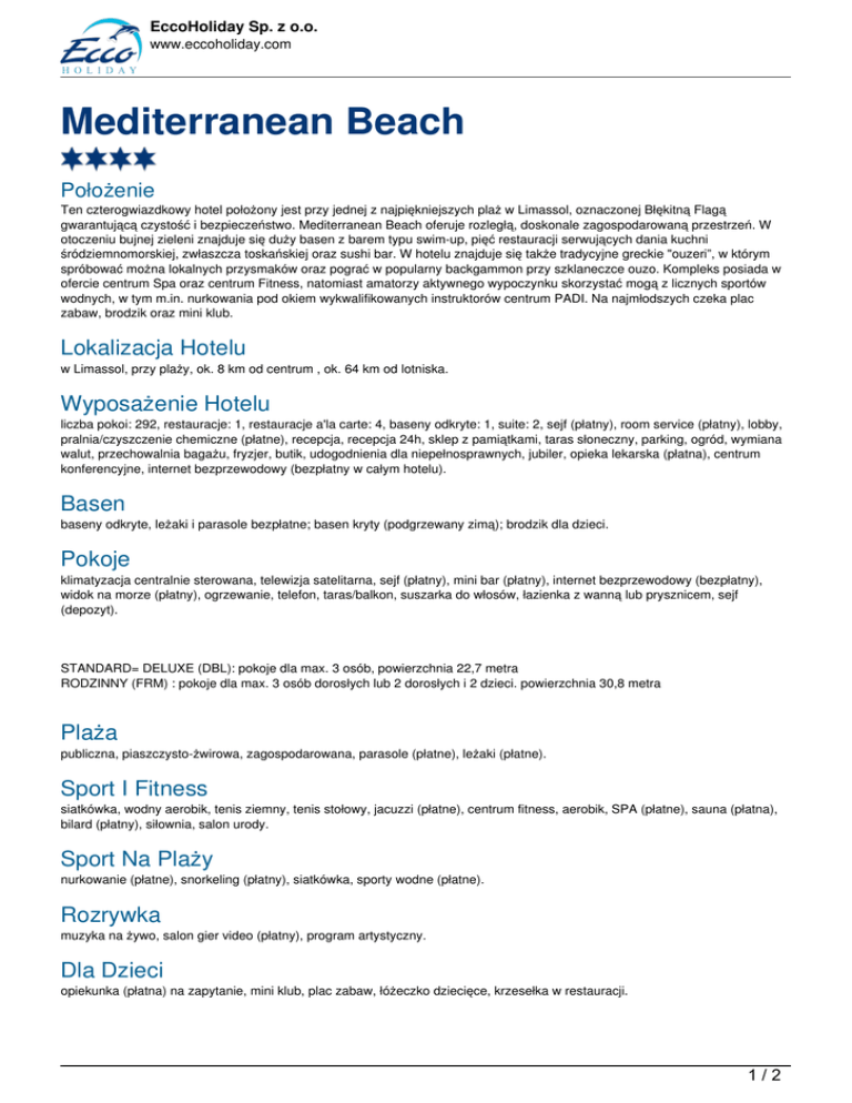 EccoHoliday Sp. z o.o. www.eccoholiday.com Mediterranean Beach Położenie Ten czterogwiazdkowy hotel położony jest przy jednej z najpiękniejszych plaż w Limassol, oznaczonej Błękitną Flagą gwarantującą czystość i bezpieczeństwo. Mediterranean Beach oferuje rozległą, doskonale zagospodarowaną przestrzeń. W otoczeniu bujnej zieleni znajduje się duży basen z barem typu swim-up, pięć restauracji serwujących dania kuchni śródziemnomorskiej, zwłaszcza toskańskiej oraz sushi bar. W hotelu znajduje się także tradycyjne greckie "ouzeri”, w którym spróbować można lokalnych przysmaków oraz pograć w popularny backgammon przy szklaneczce ouzo. Kompleks posiada w ofercie centrum Spa oraz centrum Fitness, natomiast amatorzy aktywnego wypoczynku skorzystać mogą z licznych sportów wodnych, w tym m.in. nurkowania pod okiem wykwalifikowanych instruktorów centrum PADI. Na najmłodszych czeka plac zabaw, brodzik oraz mini klub. Lokalizacja Hotelu w Limassol, przy plaży, ok. 8 km od centrum , ok. 64 km od lotniska. Wyposażenie Hotelu liczba pokoi: 292, restauracje: 1, restauracje a'la carte: 4, baseny odkryte: 1, suite: 2, sejf (płatny), room service (płatny), lobby, pralnia/czyszczenie chemiczne (płatne), recepcja, recepcja 24h, sklep z pamiątkami, taras słoneczny, parking, ogród, wymiana walut, przechowalnia bagażu, fryzjer, butik, udogodnienia dla niepełnosprawnych, jubiler, opieka lekarska (płatna), centrum konferencyjne, internet bezprzewodowy (bezpłatny w całym hotelu). Basen baseny odkryte, leżaki i parasole bezpłatne; basen kryty (podgrzewany zimą); brodzik dla dzieci. Pokoje klimatyzacja centralnie sterowana, telewizja satelitarna, sejf (płatny), mini bar (płatny), internet bezprzewodowy (bezpłatny), widok na morze (płatny), ogrzewanie, telefon, taras/balkon, suszarka do włosów, łazienka z wanną lub prysznicem, sejf (depozyt). STANDARD= DELUXE (DBL): pokoje dla max. 3 osób, powierzchnia 22,7 metra RODZINNY (FRM) : pokoje dla max. 3 osób dorosłych lub 2 dorosłych i 2 dzieci. powierzchnia 30,8 metra Plaża publiczna, piaszczysto-żwirowa, zagospodarowana, parasole (płatne), leżaki (płatne). Sport I Fitness siatkówka, wodny aerobik, tenis ziemny, tenis stołowy, jacuzzi (płatne), centrum fitness, aerobik, SPA (płatne), sauna (płatna), bilard (płatny), siłownia, salon urody. Sport Na Plaży nurkowanie (płatne), snorkeling (płatny), siatkówka, sporty wodne (płatne). Rozrywka muzyka na żywo, salon gier video (płatny), program artystyczny. Dla Dzieci opiekunka (płatna) na zapytanie, mini klub, plac zabaw, łóżeczko dziecięce, krzesełka w restauracji. 1/2 EccoHoliday Sp. z o.o. www.eccoholiday.com Wyżywienie śniadania i obiadokolacje w formie bufetu, możliwość dopłaty do lunchu. Oferta: Wylot 01.01.1970 Powrót 01.01.1970 godz. godz. Zakwaterowanie -() Dni dni Cena os. dorosła 2/2 Powered by TCPDF (www.tcpdf.org)