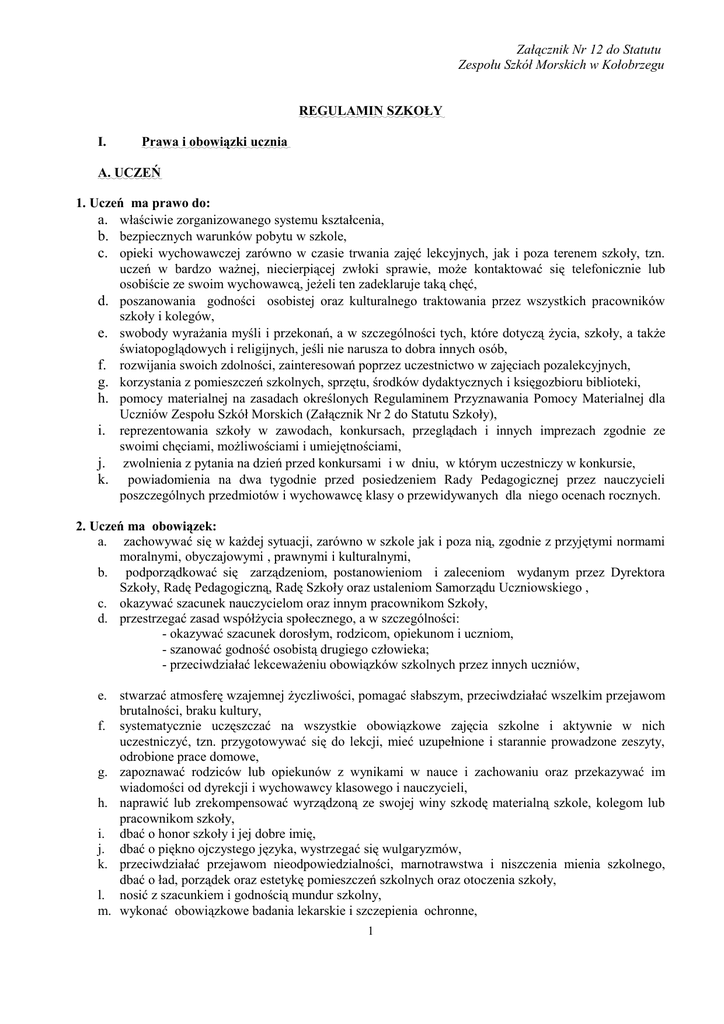 Załącznik Nr 12 do Statutu Zespołu Szkół Morskich w Kołobrzegu REGULAMIN SZKOŁY I. Prawa i obowiązki ucznia A. UCZEŃ 1. Uczeń ma prawo do: a. właściwie zorganizowanego systemu kształcenia, b. bezpiecznych warunków pobytu w szkole, c. opieki wychowawczej zarówno w czasie trwania zajęć lekcyjnych, jak i poza terenem szkoły, tzn. uczeń w bardzo ważnej, niecierpiącej zwłoki sprawie, może kontaktować się telefonicznie lub osobiście ze swoim wychowawcą, jeżeli ten zadeklaruje taką chęć, d. poszanowania godności osobistej oraz kulturalnego traktowania przez wszystkich pracowników szkoły i kolegów, e. swobody wyrażania myśli i przekonań, a w szczególności tych, które dotyczą życia, szkoły, a także światopoglądowych i religijnych, jeśli nie narusza to dobra innych osób, f. rozwijania swoich zdolności, zainteresowań poprzez uczestnictwo w zajęciach pozalekcyjnych, g. korzystania z pomieszczeń szkolnych, sprzętu, środków dydaktycznych i księgozbioru biblioteki, h. pomocy materialnej na zasadach określonych Regulaminem Przyznawania Pomocy Materialnej dla Uczniów Zespołu Szkół Morskich (Załącznik Nr 2 do Statutu Szkoły), i. reprezentowania szkoły w zawodach, konkursach, przeglądach i innych imprezach zgodnie ze swoimi chęciami, możliwościami i umiejętnościami, j. zwolnienia z pytania na dzień przed konkursami i w dniu, w którym uczestniczy w konkursie, k. powiadomienia na dwa tygodnie przed posiedzeniem Rady Pedagogicznej przez nauczycieli poszczególnych przedmiotów i wychowawcę klasy o przewidywanych dla niego ocenach rocznych. 2. Uczeń ma obowiązek: a. zachowywać się w każdej sytuacji, zarówno w szkole jak i poza nią, zgodnie z przyjętymi normami moralnymi, obyczajowymi , prawnymi i kulturalnymi, b. podporządkować się zarządzeniom, postanowieniom i zaleceniom wydanym przez Dyrektora Szkoły, Radę Pedagogiczną, Radę Szkoły oraz ustaleniom Samorządu Uczniowskiego , c. okazywać szacunek nauczycielom oraz innym pracownikom Szkoły, d. przestrzegać zasad współżycia społecznego, a w szczególności: - okazywać szacunek dorosłym, rodzicom, opiekunom i uczniom, - szanować godność osobistą drugiego człowieka; - przeciwdziałać lekceważeniu obowiązków szkolnych przez innych uczniów, e. stwarzać atmosferę wzajemnej życzliwości, pomagać słabszym, przeciwdziałać wszelkim przejawom brutalności, braku kultury, f. systematycznie uczęszczać na wszystkie obowiązkowe zajęcia szkolne i aktywnie w nich uczestniczyć, tzn. przygotowywać się do lekcji, mieć uzupełnione i starannie prowadzone zeszyty, odrobione prace domowe, g. zapoznawać rodziców lub opiekunów z wynikami w nauce i zachowaniu oraz przekazywać im wiadomości od dyrekcji i wychowawcy klasowego i nauczycieli, h. naprawić lub zrekompensować wyrządzoną ze swojej winy szkodę materialną szkole, kolegom lub pracownikom szkoły, i. dbać o honor szkoły i jej dobre imię, j. dbać o piękno ojczystego języka, wystrzegać się wulgaryzmów, k. przeciwdziałać przejawom nieodpowiedzialności, marnotrawstwa i niszczenia mienia szkolnego, dbać o ład, porządek oraz estetykę pomieszczeń szkolnych oraz otoczenia szkoły, l. nosić z szacunkiem i godnością mundur szkolny, m. wykonać obowiązkowe badania lekarskie i szczepienia ochronne, 1 n. uczestniczenia w konsultacjach organizowanych w klasach uczących się w zawodzie technik nawigator morski i technik mechanik okrętowy z tematów konwencyjnych zgodnie z programem nauczania, o. przebywania na terenie szkoły w danym dniu, zgodnie z planem zajęć szkolnych. B. SAMORZĄD UCZNIOWSKI Uczniowie mają prawo do: a. demokratycznych wyborów swoich przedstawicieli do Rady Samorządu Klasowego, Rady Samorządu Uczniowskiego, b. uchwalania regulaminu Samorządu Uczniowskiego, c. pomocy organizacyjnej i merytorycznej od opiekuna samorządu. Uczniowie mają obowiązek: a. traktowania wyborów do władz samorządu z powagą, aby funkcje w nich objęły osoby godne zaufania i odpowiedzialne, b. respektowania uchwał władz samorządu lub odwołania go, jeżeli nie spełnia swoich funkcji. C. LEKCJA Uczeń ma prawo do: a. znajomości celów i zadań lekcyjnych oraz jasnego i zrozumiałego przekazu treści lekcji, b. pomocy ze strony nauczyciela w przypadku natrafienia na trudności, c. znajomości przedmiotowych planów pracy i przedmiotowych systemu oceniania oraz regulaminu pracowni i zasad BHP. Uczeń ma obowiązek: a. punktualnego i systematycznego przychodzenia na zajęcia szkolne, b. aktywnego udziału w lekcjach i przestrzegania ustalonych zasad porządkowych, c. uzupełnienia braków wynikających z nieobecności, d. w czasie zajęć: wychowania fizycznego, warsztatowych, laboratoryjnych, fizyki, chemii, przestrzegać regulaminu korzystania z obiektu (pracowni), w którym odbywają się zajęcia. II. REGUŁY WSPÓŁŻYCIA W SZKOLE 1. PROCEDURY LEKCYJNE a. b. c. d. Przy wejściu do klasy w pierwszych rzędach powinny stać dziewczęta, później chłopcy. Wszyscy stają przy ławkach i następuje powitanie, a następnie przygotowanie do lekcji. Nauczyciel sprawdza listę obecności. Uczeń spóźniony to ten, który wchodzi do klasy po nauczycielu (nauczyciel wchodzi do pracowni jako ostatni). e. Uczniowie zachowują podstawy kultury wiążące się z niespożywaniem na lekcji posiłków, żuciem gumy, trzymaniem na ławce butelek, ciastek, itp. (nie będących pomocami do danej lekcji). f. Uczniowie wstają ze swoich miejsc, jeżeli do klasy wchodzi osoba dorosła, siadają na polecenie nauczyciela prowadzącego lekcje. g. Posiadacze telefonów komórkowych podczas trwania zajęć lekcyjnych wyłączają aparaty, dzwoniący na lekcji telefon komórkowy zostanie odebrany uczniowi i pozostawiony w depozycie szkoły do czasu odebrania przez rodziców. h. Lekcja kończy się na wyraźny sygnał nauczyciela, nie wcześniej niż równo z dzwonkiem. 2. NIEOBECNOŚCI a. Uczeń okazuje 