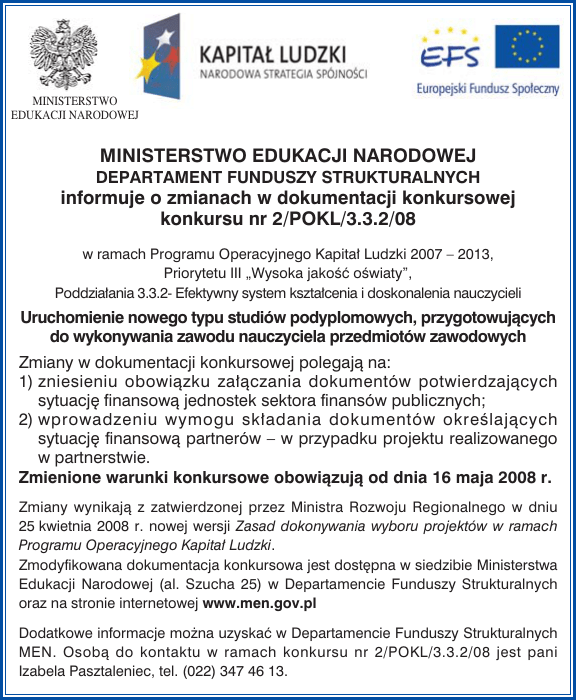 MINISTERSTWO EDUKACJI NARODOWEJ MINISTERSTWO EDUKACJI NARODOWEJ DEPARTAMENT FUNDUSZY STRUKTURALNYCH informuje o zmianach w dokumentacji konkursowej konkursu nr 2/POKL/3.3.2/08 w ramach Programu Operacyjnego Kapitał Ludzki 2007 – 2013, Priorytetu III „Wysoka jakość oświaty”, Poddziałania 3.3.2- Efektywny system kształcenia i doskonalenia nauczycieli Uruchomienie nowego typu studiów podyplomowych, przygotowujących do wykonywania zawodu nauczyciela przedmiotów zawodowych Zmiany w dokumentacji konkursowej polegają na: 1) zniesieniu obowiązku załączania dokumentów potwierdzających sytuację finansową jednostek sektora finansów publicznych; 2) wprowadzeniu wymogu składania dokumentów określających sytuację finansową partnerów – w przypadku projektu realizowanego w partnerstwie. Zmienione warunki konkursowe obowiązują od dnia 16 maja 2008 r. Zmiany wynikają z zatwierdzonej przez Ministra Rozwoju Regionalnego w dniu 25 kwietnia 2008 r. nowej wersji Zasad dokonywania wyboru projektów w ramach Programu Operacyjnego Kapitał Ludzki. Zmodyfikowana dokumentacja konkursowa jest dostępna w siedzibie Ministerstwa Edukacji Narodowej (al. Szucha 25) w Departamencie Funduszy Strukturalnych oraz na stronie internetowej www.men.gov.pl Dodatkowe informacje można uzyskać w Departamencie Funduszy Strukturalnych MEN. Osobą do kontaktu w ramach konkursu nr 2/POKL/3.3.2/08 jest pani Izabela Pasztaleniec, tel. (022) 347 46 13.