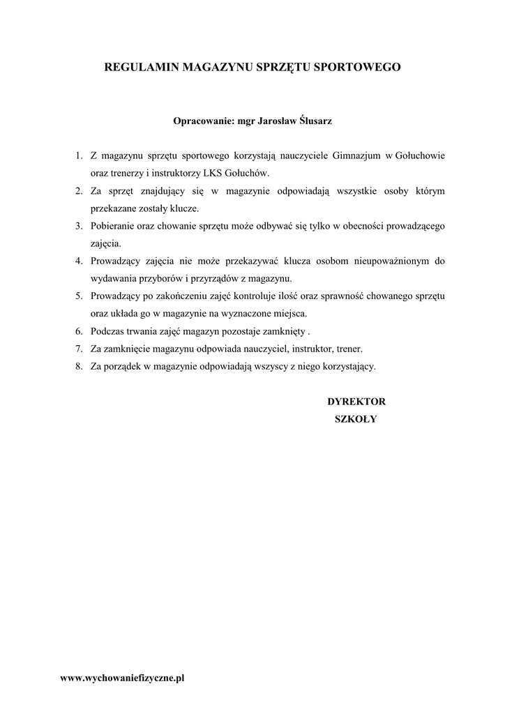 5(*8/$0,10$*$=<18635=78632572:(*2 2SUDFRZDQLHPJU-DURVáDZOXVDU] = PDJD]\QX VSU] WX VSRUWRZHJR NRU]\VWDM QDXF]\FLHOH *LPQD]MXP Z *RáXFKRZLH RUD]WUHQHU]\LLQVWUXNWRU]\/.6*RáXFKyZ =D VSU] W ]QDMGXMF\ VL Z PDJD]\QLH RGSRZLDGDM ZV]\VWNLH RVRE\ NWyU\P SU]HND]DQH]RVWDá\NOXF]H 3RELHUDQLHRUD]FKRZDQLHVSU] WXPR*HRGE\ZDüVL W\ONRZREHFQRFLSURZDG]FHJR ]DM FLD 3URZDG]F\ ]DM FLD QLH PR*H SU]HND]\ZDü NOXF]D RVRERP QLHXSRZD*QLRQ\P GR Z\GDZDQLDSU]\ERUyZLSU]\U]GyZ]PDJD]\QX 3URZDG]F\SR]DNRF]HQLX]DM üNRQWUROXMHLORüRUD]VSUDZQRüFKRZDQHJRVSU] WX RUD]XNáDGDJRZPDJD]\QLHQDZ\]QDF]RQHPLHMVFD 3RGF]DVWUZDQLD]DM üPDJD]\QSR]RVWDMH]DPNQL W\ =D]DPNQL FLHPDJD]\QXRGSRZLDGDQDXF]\FLHOLQVWUXNWRUWUHQHU =DSRU]GHNZPDJD]\QLHRGSRZLDGDM ZV]\VF\]QLHJRNRU]\VWDMF\ '<5(.725 6=.2à< ZZZZ\FKRZDQLHIL]\F]QHSO