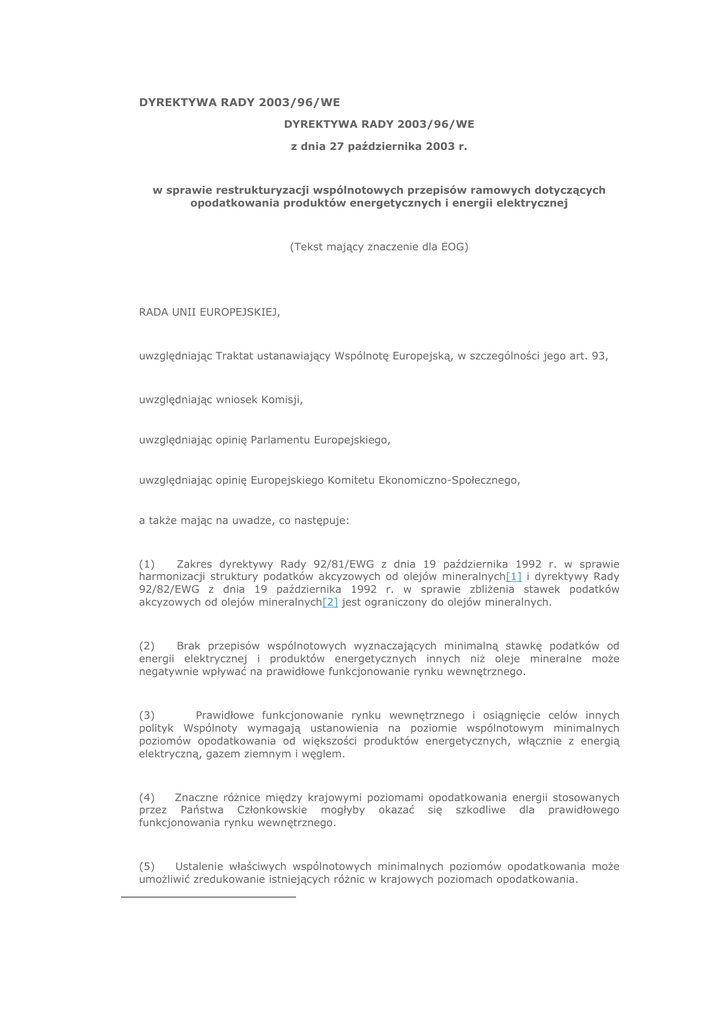DYREKTYWA RADY 2003/96/WE DYREKTYWA RADY 2003/96/WE z dnia 27 października 2003 r. w sprawie restrukturyzacji wspólnotowych przepisów ramowych dotyczących opodatkowania produktów energetycznych i energii elektrycznej (Tekst mający znaczenie dla EOG) RADA UNII EUROPEJSKIEJ, uwzględniając Traktat ustanawiający Wspólnotę Europejską, w szczególności jego art. 93, uwzględniając wniosek Komisji, uwzględniając opinię Parlamentu Europejskiego, uwzględniając opinię Europejskiego Komitetu Ekonomiczno-Społecznego, a także mając na uwadze, co następuje: (1) Zakres dyrektywy Rady 92/81/EWG z dnia 19 października 1992 r. w sprawie harmonizacji struktury podatków akcyzowych od olejów mineralnych[1] i dyrektywy Rady 92/82/EWG z dnia 19 października 1992 r. w sprawie zbliżenia stawek podatków akcyzowych od olejów mineralnych[2] jest ograniczony do olejów mineralnych. (2) Brak przepisów wspólnotowych wyznaczających minimalną stawkę podatków od energii elektrycznej i produktów energetycznych innych niż oleje mineralne może negatywnie wpływać na prawidłowe funkcjonowanie rynku wewnętrznego. (3) Prawidłowe funkcjonowanie rynku wewnętrznego i osiągnięcie celów innych polityk Wspólnoty wymagają ustanowienia na poziomie wspólnotowym minimalnych poziomów opodatkowania od większości produktów energetycznych, włącznie z energią elektryczną, gazem ziemnym i węglem. (4) Znaczne różnice między krajowymi poziomami opodatkowania energii stosowanych przez Państwa Członkowskie mogłyby okazać się szkodliwe dla prawidłowego funkcjonowania rynku wewnętrznego. (5) Ustalenie właściwych wspólnotowych minimalnych poziomów opodatkowania może umożliwić zredukowanie istniejących różnic w krajowych poziomach opodatkowania. (6) Zgodnie z postanowieniami art. 6 Traktatu, wymogi ochrony środowiska muszą być włączone do określania i wykonywania innych polityk Wspólnoty. (7) Jako strona Konwencji Ramowej Narodów Zjednoczonych w sprawie zmian klimatu, Wspólnota ratyfikowała Protokół z Kioto. Opodatkowanie produktów energetycznych i – w odpowiednim przypadku - energii elektrycznej jest jednym z instrumentów dostępnych w celu osiągania celów Protokołu z Kioto. (8) Rada musi w regularnych odstępach czasu badać zwolnienia i obniżki oraz minimalne poziomy podatków, biorąc pod uwagę prawidłowe funkcjonowanie rynku wewnętrznego, rzeczywistą wartość minimalnych poziomów opodatkowania, międzynarodową konkurencyjność gospodarki Wspólnoty oraz ogólne cele Traktatu. (9) Państwom Członkowskim należy przyznać elastyczność potrzebną do określania i wykonywania polityk właściwych do ich okoliczności krajowych. (10) Państwa Członkowskie chcą wprowadzać lub utrzymywać różne rodzaje podatków od produktów energetycznych i energii elektrycznej. W tym celu należy postanowić, że Państwa Członkowskie spełniają wymaganie odnośnie minimalnych poziomów opodatkowania, jeśli całość pobranych przez nie, jako podatki pośrednie, opłat (z wyłączeniem podatku od wartości dodanej), nie jest niższa od wspólnotowych minimalnych poziomów opodatkowania. (11) Decydowanie o tym, jakimi środkami podatkowymi wprowadzone zostaną w życie wspólnotowe ramy dotyczące opodatkowania produktów energetycznych i energii elektrycznej jest sprawą poszczególnych Państw Członkowskich. W tym względzie, Państwa Członkowskie mogą zdecydować nie podwyższać ogólnego obciążenia podatkowego, jeśli uznają że wprowadzenie w życie takiej zasady neutralności podatkowej mogłoby przyczynić się do restrukturyzacji i unowocześnienia ich systemów podatkowych poprzez zachęcanie do zachowań bardziej sprzyjających ochronie środowiska i zwiększonego uwzględnienia czynnika udziału w pracy. (12) Ceny energii są elementami kluczowymi wspólnotowej polityki energetycznej, transportowej i ochrony środowiska. (13) Podatki mają udział w ustalaniu cen produktów energetycznych i energii elektrycznej. (14) Minimalne poziomy opodatkowania powinny odzwierciedlać pozycję konkurencyjności różnych produktów energetycznych i energii elektrycznej. W związku z powyższym, słusznym byłoby oparcie kalkulacji tych minimalnych poziomów opodatkowania, w takim stopniu jak to jest możliwe, na zawartości energii w tych produktach. Metoda ta nie powinna jednak być stosowana w stosunku do paliw silnikowych. (15) Możliwość stosowania zróżnicowanych krajowych stawek podatkowych względem tego samego produktu powinna być dopuszczalna w niektórych okolicznościach lub na określonych warunkach, pod warunkiem przestrzegania wspólnotowych minimalnych poziomów opodatkowania oraz zasad rynku wewnętrznego i konkurencji. (16) Ponieważ ciepło jest przedmiotem bardzo ograniczonego handlu wewnątrzwspólnotowego, końcowe opodatkowanie ciepła powinno pozostać poza zakresem niniejszych ram wspólnotowych. (17) Niezbędne jest ustalenie różnych wspólnotowych minimalnych poziomów opodatkowania odnośnie wykorzystania produktów energetycznych i energii elektrycznej. (18) Produkty energetyczne wykorzystywane jako paliwo silnikowe do niektórych celów przemysłowych i handlowych oraz te wykorzystywane jako paliwo do ogrzewania są zazwyczaj opodatkowane na niższych poziomach niż te mające zastosowanie do produktów energetycznych wykorzystywanych jako materiały pędne. (19) Konieczne jest przewidzenie możliwości szczególnego potraktowania opodatkowania oleju napędowego wykorzystywanego przez przedsiębiorstwa transportu towarowego, w szczególności te zaangażowane w działalność wewnątrz Wspólnoty, włącznie ze środkami pozwalającymi na wprowadzenie systemu opłat od użytkowników dróg w celu ograniczenia zakłóceń konkurencji jakie mogą napotkać podmioty gospodarcze. (20) Państwa Członkowskie muszą w danym przypadku rozróżniać między olejem napędowym wykorzystywanym na cele handlowe i niehandlo