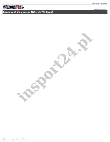 Informacje o produkcie Utworzono 07-03-2017 in sp or t2 4. p l Impregnat do odzieży NikwaX TX Direct Wygenerowano w programie www.oscGold.com l 4. p sp or t2 Cena : 42,00 zł Cena promocyjna : 39,00 zł in Producent : NikwaX Dostępność : Dostępny Stan magazynowy : bardzo wysoki Średnia ocena : brak recenzji Informacje o produkcie Impregnat do odzieży firmy NikwaX model TX Direct. Opis: Impregnat do odzieży przeciwdeszczowej do stosowania w praniu ● Nadaje / odnawia właściwości wodoodporne i odświeża właściwości 'oddychające' Przedłuża okres korzystania ze sprzętu i optymalizuje jego właściwości na świeżym powietrzu Pojemność 300 ml Doskonały do: Jak zastosować: sp or t2 - Do odzieży z podpinką - Membranami z mikroporami - Gore-Tex - Sympatex - eVENT - Tripple-Point Ceramic - Włóknami Microfibre - "Oddychającym" laminatem 4. p ● l Nadaje właściwości wodoodporne i odświeża zdolność do oddychania tkanin bez podpinek absorbujących wilgoć. 1. Włożyć ubranie do pralki automatycznej 2. Wlać Nikwax TX.Direct do dozownika pralki 3. Nastawić pralkę na cykl prania zwykłego, włączyć i pozwolić jej prać aż do ukończenia cyklu płukania 4. Można również zastosować Nikwax w zwykłym praniu ręcznym 5. Suszyć w stanie rozwieszonym lub w suszarce bębnowej jeśli zezwala na to etykieta produktu. Uwaga: - Za każdym razem należy sprawdzić etykietę dołączoną do ubrania i postępować zgodnie z zawartymi na niej instrukcjami - Przed ponowną impregnacją za każdym razem należy wyprać ubranie stosując Nikwax Tech Wash - Podczas prania w pralce automatycznej przed dodaniem Nikwax należy usunąć wszelkie ślady detergentu z dozownika pralki Dozowanie - Do impregnacji użyć 3 pełnych nakrętek (100 ml) na jedną sztukę odzieży Kiedy należy stosować ten produkt: in Po wyczyszczeniu i ponownym zaimpregnowaniu odzieży, aby utrzymać jej nieprzemakalność, należy często czyścić ją w Nikwax Tech Wash. Po 3,4 cyklach czyszczenia w Nikwax Tech Wash należy ponownie zastosować Nikwax TX.Direct celem nowej impregnacji. Prosimy pamiętać o tym, że nie ma konieczności suszenia odzieży w czasie między czyszczeniem a impregnacją. Łatwy w użyciu - może być stosowany w pralce, nie wymaga suszenia w suszarce bębnowej Nie ma wpływu na wygląd zewnętrzny Na bazie wody - bezpieczny dla środowiska naturalnego, ulegajacy biodegradacji, niepalny, bezpieczny w użyciu Nie zawiera fluorokarbonów Gwarancja trwałości producenta obejmuje 4 lata Wygenerowano w programie www.oscGold.com ● ● ● ● ●