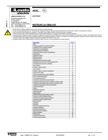 1 ADXL… PL I456PL07 16 SOFTSTART INSTRUKCJA OBSŁUGI Przed użyciem i instalacją urządzenia należy uważnie przeczytać niniejszą instrukcję. W celu uniknięcia zagrożenia dla życia i mienia tego typu urządzenia muszą być instalowane przez wykwalifikowany personel oraz w zgodzie z obowiązującymi przepisami. Przed rozpoczęciem jakichkolwiek prac związanych z przyrządem należy odłączyć napięcie od wejść pomiarowych i zasilających. Producent nie przyjmuje na siebie odpowiedzialności za bezpieczeństwo elektryczne w przypadku niewłaściwego użytkowania urządzenia. Produkty opisane w niniejszym dokumencie mogą być w każdej chwili udoskonalone lub zmodyfikowane. Opisy oraz dane katalogowe nie mogą mieć w związku z tym żadnej wartości umownej. W instalacji elektrycznej budynku należy uwzględnić przełącznik lub wyłącznik automatyczny. Powinien on znajdować się w bliskim sąsiedztwie urządzenia i być łatwo osiągalny przez operatora. Musi być oznaczony jako urządzenie służące do wyłączania urządzenia: IEC/ EN 61010-1 § 6.12.2.1. Urządzenie należy czyścić miękką szmatką, nie stosować środków ściernych, płynnych detergentów lub rozpuszczalników. Spis treści Opis Funkcje przycisków na panelu przednim Wskaźniki LED na panelu przednim Wskazania na wyświetlaczu Kreator aplikacji (AUTOSET) Poruszanie się po stronach wyświetlacza Status pracy Klawiatura zdalna Metody rozruchu Zabezpieczenia Zabezpieczenie termiczne silnika Zabezpieczenie termiczne silnika poprzez PTC Zabezpieczenie termiczne softstartu Menu główne Dostęp z użyciem hasła Lista zdarzeń Wejścia, wyjścia, zmienne wewnętrzne Progi limitów (LIMx) Zmienne kontrolowane zdalnie (REMx) Alarmy użytkownika (UAx) Port programowania IR Ustawianie parametrów przez komputer Ustawianie parametrów przez smartfon lub tablet z Wi-Fi Ustawianie parametrów przez smartfon lub tablet z NFC Ustawianie parametrów przez panel przedni Tabela parametrów Alarmy Właściwości alarmów Tabela alarmów Opis alarmów Tabela funkcji programowalnych wejść Domyślne wejścia programowalne Tabela funkcji wyjść programowalnych Domyślne wyjścia programowalne Menu komend Instalacja Zalecenia Poprawa współczynnika mocy Schematy połączeń Wymiary mechaniczne Rozmieszczenie zacisków Wybór softstartu Koordynacja Parametry techniczne Historia wersji instrukcji Dok.: I456PL10_16.docx 03/10/2016 Strona 2 2 2 2 3 4 4 4 5 6 6 6 6 7 7 7 7 8 8 8 9 9 9 9 10 10 14 14 14 14 15 15 15 15 16 17 17 17 17 19 19 20 20 20 21 str. 1 / 21 Opis Podświetlany wyświetlacz LCD z ikonami. 3 wskaźniki LED wskazujące status pracy (zasilanie, rampa/praca, awaria). Teksty pomiarów, ustawień i komunikaty w 6 językach (EN-IT-FR-ES-P-D). Klawiatura na panelu przednim z 4 przyciskami umożliwiająca ustawienie wszystkich parametrów. Kreator aplikacji AUTOSET do szybkiego ustawiania, w 4 krokach, typowych aplikacji (pompy, pompy przeciwpożarowe, przenośniki taśmowe, mieszadła, wentylatory, zastosowanie ogólne). Kontrola w 2-fazach, wbudowany przekaźnik obejściowy (by-pass). 4 różne rozmiary mechaniczne i 11 zakresów elektrycznych: do silników od 30 do 320 A prądu znamionowego. Rozruch rampą napięcia lub momentu obrotowego, z uwzględnieniem ograniczenia prądu maksymalnego rozruchu. Wentylator z termostatem (opcja w ADXL30…115), z dedykowaną diagnostyką (wentylator odłączony lub zablokowany). 3 programowalne wejścia cyfrowe, w tym jedno z możliwością skonfigurowania pod zabezpieczenie poprzez czujnik PTC. 3 programowalne wyjścia cyfrowe typu przekaźnikowego, w tym jedno przełączne (C/O) i dwa normalnie otwarte (NO). Separowane zasilanie pomocnicze. Podwójne zaciski mocy. Wbudowane elektroniczne zabezpieczenie termiczne, typu multi-class, oddzielne w przypadku rozruchu i pracy. Kompletny zestaw zabezpieczeń silnika: zanik fazy, brak linii zasilającej, kolejność faz, niezrównoważenie faz, utyk wirnika, suchobieg (minimalny moment), zbyt długi czas rozruchu, zbyt wysokie lub zbyt niskie napięcie. Analogowy czujnik temperatury do zabezpieczania tyrystorów, ze wskazaniami na wyświetlaczu oraz progami dla alarmu i alarmu wstępnego. Zaawansowana autodiagnostyka. Interfejs NFC do programowania przy użyciu smartfona. Przedni interfejs optyczny do wykonywania programowania i konserwacji. Izolowany opcjonalny interfejs RS485, podłączenie w dedykowanym gnieździe z protokołami Modbus. Alarmy z programowalnym przez użytkownika tekstem w danym języku i właściwościami. Kompatybilność z aplikacją SAM1, aplikacją NFC configurator, oprogramowaniem nadzorującym Synergy i oprogramowaniem do konfiguracji oraz kontroli zdalnej Xpress. Opcjonalne akcesoria do montażu na szynie DIN (w przypadku ADXL 30…115). Opcjonalny wyświetlacz na drzwi szafy, do sterowania wieloma urządzeniami rozruchowymi. Funkcje przycisków przednich Przyciski ▲ ▼ – Umożliwiają przewijanie poszczególnych opcji. Równoczesne naciśnięcie ich umożliwia wejście lub wyjście z poszczególnych menu. Przycisk START – Potwierdza dokonany wybór lub zwiększa wybraną wartość numeryczną. W przypadku odpowiedniego zaprogramowania go umożliwia rozruch silnika za pomocą klawiatury na panelu przednim. Przycisk STOP – Powoduje wyjście lub zmniejsza wybraną wartość numeryczną. W przypadku odpowiedniego zaprogramowania go umożliwia wyłączenie silnika za pomocą klawiatury na panelu przednim. Wskaźniki LED na panelu przednim Wskaźnik LED POWER (zielony) – Obecne zasilanie pomocnicze. Wskaźnik LED RUN (zielony) – Miganie oznacza rampę w toku. Świeci światłem ciągłym: działanie przy pełnym napięciu. Wskaźnik LED FAULT (czerwony) – Aktywny alarm. Wskazania na wyświetlaczu Aplikacja typu przenośnik taśmowy Aplikacja typu wentylator Aplikacja typu mieszadło Aplikacja typu pompa przeciwpożarowa Aplikacja ogólna Aplikacja typu pompa odśrodkowa Wyświetlanie stan