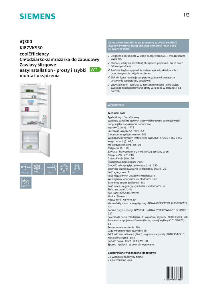 1/3 iQ300 KI87VKS30 coolEfficiency Chłodziarko-zamrażarka do zabudowy Zawiasy ślizgowe easyInstallation - prosty i szybki montaż urządzenia Chłodziarko-zamrażarka do zabudowy zachowa świeżość owoców i warzyw dłużej dzięki pojemnikowi Fresh Box z falowanym dnem. ✓ Urządzenie chłodnicze w klasie energetycznej A++ chłodzi bardzo wydajnie. ✓ Owoce i warzywa pozostaną chrupkie w pojemniku Fresh Box z falowanym dnem. ✓ Szuflada bigBox optymalnie dużo miejsca do składowania i przechowywania dużych mrożonek. ✓ Elektroniczna regulacja temperatury: proste i przejrzyste ustawienie temperatury docelowej. ✓ Wszystkie półki i szuflady w zamrażarce można łatwo wyjąć, swoboda zagospodarowania strefy varioZone w zależności od potrzeb. Wyposażenie Technical data Typ budowy : Do zabudowy Warianty paneli frontowych : Ramy dekoracyjne bez możliwości nabycia jako wyposażenie dodatkowe Wysokość (mm) : 1772 Szerokość urządzenia (mm) : 541 Głębokość urządzenia (mm) : 545 Wymagana przestrzeń instalacyjna (WxSxG) : 1775.0 x 560 x 550 Waga netto (kg) : 62,0 Moc przyłączeniowa (W) : 90 Natężenie (A) : 10 Zawiasy : Prawostronnie z możliwością zamiany stron Napięcie (V) : 220-240 Częstotliwość (Hz) : 50 Świadectwa homologacji : VDE Długość kabla przyłączeniowego (cm) : 230 Zdolność przechowywania w przypadku awarii : 26 Ilość agregatów : 1 Ilość niezależnych układów chłodzenia : 1 Wewnętrzny wentylator w chłodziarce : nie Zamienna strona zawiasów : Tak Ilość półek z regulacją wysokości w chłodziarce : 4 Stelaż na butelki : nie Kod EAN : 4242003749395 Marka : Siemens Nazwa serii : KI87VKS30 Klasa efektywności energetycznej - NOWA DYREKTYWA (2010/30/WE) : A++ Roczne zużycie energii (kWh/rok) - NOWA DYREKTYWA (2010/30/WE) : 227 Pojemność netto chłodziarki (l) - wg nowej etykiety (2010/30/EC) : 209 Zamrażarka - pojemność netto (l) - wg nowej etykiety (2010/30/EC) : 63 Bezszronowe mrożenie : Nie Czas wzrostu temperatury (h) : 26 Zdolność zamrażania (kg/24h) - wg nowej etykiety (2010/30/EC) : 3 Klasa klimatyczna : SN-T Poziom hałasu (db(A) re 1 pW) : 38 Sposób instalacji : W pełni zintegrowane Zintegrowane wyposażenie dodatkowe 2 x wkład akumulacyjny zimna 2 x pojemnik na jajka '!2E20AD-hejdjf! 2/3 iQ300 KI87VKS30 coolEfficiency Chłodziarko-zamrażarka do zabudowy Zawiasy ślizgowe easyInstallation - prosty i szybki montaż urządzenia Wyposażenie Dane eksploatacyjne ● Klasa efektywności energetycznej: A++ ● Zużycie energii¹: 227 kWh/rok ● Pojemność całkowita: 272 l ● Poziom hałasu: 38 dB dB(A) re 1 pW ● Klasa klimatyczna: SN-T Design ● Oświetlenie LED w chłodziarce Komfort użytkowania ● ● ● Elektroniczna regulacja temperatury, wyświetlacz LED freshSense - stała temperatura, dzięki inteligentnemu systemowi czujników Supermrożenie Chłodziarka ● Pojemność chłodziarki: 209 l ● Ilość półek z bezpiecznego szkła: 5, z tego 4 o zmiennej wysokości ● Ilość półek na drzwiach: 5 System świeżości ● 1 pojemnik Fresh Box Zamrażarka ● Zamrażarka *(***) Pojemność: 63 l l ● Zdolność zamrażania: 3 kg w ciągu 24h ● Zdolność przech. w przypadku awarii: 26h ● ● ● varioZone - wyjmowane półki i szuflady dla uzyskania większej przestrzeni Ilość przezroczystych szuflad na mrożonki: 2, w tym 1 zamykana półka Kalendarz zamrażania żywności Wymiary ● ● Wymiary urządzenia: W 177,2 cm x S 54,1 cm x G 54,5 cm Wymiary niszy do zabudowy W x S x G: 177,5 cm x 56,0 cm x 55,0 cm Parametry techniczne ● z możliwością zmiany strony, Drzwi zamocowane prawostronnie ● Moc przyłączeniowa: 90 W ● Uchwyty do przenoszenia Wyposażenie ● ● ● 2 x wkład akumulacyjny zimna, 2 x pojemnik na jajka ¹W oparciu o standardowy, 24-godzinny test. Faktyczne zużycie energii zależy od sposobu użytkowania urządzenia i jego umiejscowienia. Zużycie energii¹: 227 kWh/rok Ogólne informacje 3/3 iQ300 KI87VKS30 coolEfficiency Chłodziarko-zamrażarka do zabudowy Zawiasy ślizgowe easyInstallation - prosty i szybki montaż urządzenia Rysunki wymiarowe