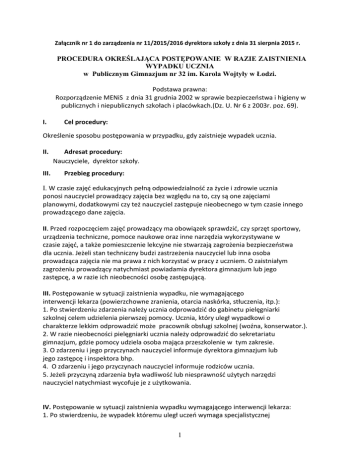 Załącznik nr 1 do zarządzenia nr 11/2015/2016 dyrektora szkoły z dnia 31 sierpnia 2015 r. PROCEDURA OKREŚLAJĄCA POSTĘPOWANIE W RAZIE ZAISTNIENIA WYPADKU UCZNIA w Publicznym Gimnazjum nr 32 im. Karola Wojtyły w Łodzi. Podstawa prawna: Rozporządzenie MENiS z dnia 31 grudnia 2002 w sprawie bezpieczeństwa i higieny w publicznych i niepublicznych szkołach i placówkach.(Dz. U. Nr 6 z 2003r. poz. 69). I. Cel procedury: Określenie sposobu postępowania w przypadku, gdy zaistnieje wypadek ucznia. II. Adresat procedury: Nauczyciele, dyrektor szkoły. III. Przebieg procedury: I. W czasie zajęć edukacyjnych pełną odpowiedzialność za życie i zdrowie ucznia ponosi nauczyciel prowadzący zajęcia bez względu na to, czy są one zajęciami planowymi, dodatkowymi czy też nauczyciel zastępuje nieobecnego w tym czasie innego prowadzącego dane zajęcia. II. Przed rozpoczęciem zajęć prowadzący ma obowiązek sprawdzić, czy sprzęt sportowy, urządzenia techniczne, pomoce naukowe oraz inne narzędzia wykorzystywane w czasie zajęć, a także pomieszczenie lekcyjne nie stwarzają zagrożenia bezpieczeństwa dla ucznia. Jeżeli stan techniczny budzi zastrzeżenia nauczyciel lub inna osoba prowadząca zajęcia nie ma prawa z nich korzystać w pracy z uczniem. O zaistniałym zagrożeniu prowadzący natychmiast powiadamia dyrektora gimnazjum lub jego zastępcę, a w razie ich nieobecności osobę zastępującą. III. Postępowanie w sytuacji zaistnienia wypadku, nie wymagającego interwencji lekarza (powierzchowne zranienia, otarcia naskórka, stłuczenia, itp.): 1. Po stwierdzeniu zdarzenia należy ucznia odprowadzić do gabinetu pielęgniarki szkolnej celem udzielenia pierwszej pomocy. Ucznia, który uległ wypadkowi o charakterze lekkim odprowadzić może pracownik obsługi szkolnej (woźna, konserwator.). 2. W razie nieobecności pielęgniarki ucznia należy odprowadzić do sekretariatu gimnazjum, gdzie pomocy udziela osoba mająca przeszkolenie w tym zakresie. 3. O zdarzeniu i jego przyczynach nauczyciel informuje dyrektora gimnazjum lub jego zastępcę i inspektora bhp. 4. O zdarzeniu i jego przyczynach nauczyciel informuje rodziców ucznia. 5. Jeżeli przyczyną zdarzenia była wadliwość lub niesprawność użytych narzędzi nauczyciel natychmiast wycofuje je z użytkowania. IV. Postępowanie w sytuacji zaistnienia wypadku wymagającego interwencji lekarza: 1. Po stwierdzeniu, że wypadek któremu uległ uczeń wymaga specjalistycznej 1 pomocy należy doprowadzić go do gabinetu pielęgniarki szkolnej lub wezwać ją na miejsca zdarzenia. 2. W razie nieobecności pielęgniarki szkolnej należy natychmiast wezwać pogotowie ratunkowe oraz powiadomić o zdarzeniu dyrektora gimnazjum lub jego zastępcę i inspektora bhp. 3. Do czasu przybycie pogotowia ratunkowego osoby przeszkolone w udzielaniu pomocy przedmedycznej podejmują natychmiast niezbędne czynności ratujące zdrowie i życie ucznia. 4. Nauczyciel powiadamia o wypadku rodziców ucznia. 5. Okoliczności wypadku bada komisja w składzie :inspektor bhp i społeczny inspektor pracy. 6. Ustalenia komisji dokumentowane są w protokole wypadku ucznia. 7. Wypadek jest wpisywany do rejestru wypadków, a wnioski komisji są omawiane na posiedzeniu rady pedagogicznej. V. Postępowanie w sytuacji zaistnienia wypadku śmiertelnego, ciężkiego, lub zbiorowego: 1. W sytuacji, kiedy nastąpiło ciężkie uszkodzenie ciała należy natychmiast wezwać pogotowie ratunkowe, a do czasu jego przybycia osoby przeszkolone w udzielaniu pomocy przedmedycznej podejmują natychmiast niezbędne czynności ratujące zdrowie i życie ucznia. 2. Nauczyciel prowadzący zajęcia edukacyjne zabezpiecza miejsce zdarzenia i natychmiast wzywa na jego miejsce dyrektora gimnazjum lub jego zastępcę. 3. Dyrektor gimnazjum lub jego zastępca informuje o zdarzeniu rodziców ucznia prokuratora i kuratora oświaty. 4. O wypadku, do którego doszło w wyniku zatrucia zawiadamia się niezwłocznie państwowego inspektora sanitarnego. 5. Do czasu przybycia odpowiednich służb teren wypadku pozostaje zabezpieczony tak, by było możliwe pełne ustalenie okoliczności i przyczyn zdarzenia. 6. Okoliczności wypadku bada komisja w składzie: inspektor bhp i społeczny inspektor pracy. 7. Ustalenia komisji dokumentowane są w protokole wypadku ucznia. 8. Wypadek jest wpisywany do rejestru, a wnioski komisji są omawiane na zebraniu rady pedagogicznej. VI. Jeśli wypadek zdarzyłby się w czasie wycieczki, biwaku wszystkie stosowne decyzje podejmuje kierownik imprezy i odpowiada za nie. 2