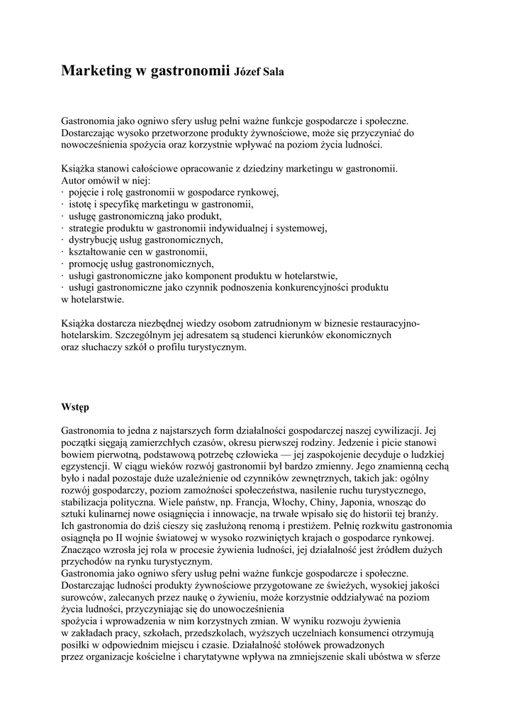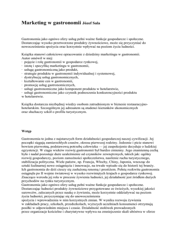 Marketing w gastronomii Józef Sala Gastronomia jako ogniwo sfery usług pełni ważne funkcje gospodarcze i społeczne. Dostarczając wysoko przetworzone produkty żywnościowe, może się przyczyniać do nowocześnienia spożycia oraz korzystnie wpływać na poziom życia ludności. Książka stanowi całościowe opracowanie z dziedziny marketingu w gastronomii. Autor omówił w niej: · pojęcie i rolę gastronomii w gospodarce rynkowej, · istotę i specyfikę marketingu w gastronomii, · usługę gastronomiczną jako produkt, · strategie produktu w gastronomii indywidualnej i systemowej, · dystrybucję usług gastronomicznych, · kształtowanie cen w gastronomii, · promocję usług gastronomicznych, · usługi gastronomiczne jako komponent produktu w hotelarstwie, · usługi gastronomiczne jako czynnik podnoszenia konkurencyjności produktu w hotelarstwie. Książka dostarcza niezbędnej wiedzy osobom zatrudnionym w biznesie restauracyjnohotelarskim. Szczególnym jej adresatem są studenci kierunków ekonomicznych oraz słuchaczy szkół o profilu turystycznym. Wstęp Gastronomia to jedna z najstarszych form działalności gospodarczej naszej cywilizacji. Jej początki sięgają zamierzchłych czasów, okresu pierwszej rodziny. Jedzenie i picie stanowi bowiem pierwotną, podstawową potrzebę człowieka — jej zaspokojenie decyduje o ludzkiej egzystencji. W ciągu wieków rozwój gastronomii był bardzo zmienny. Jego znamienną cechą było i nadal pozostaje duże uzależnienie od czynników zewnętrznych, takich jak: ogólny rozwój gospodarczy, poziom zamożności społeczeństwa, nasilenie ruchu turystycznego, stabilizacja polityczna. Wiele państw, np. Francja, Włochy, Chiny, Japonia, wnosząc do sztuki kulinarnej nowe osiągnięcia i innowacje, na trwałe wpisało się do historii tej branży. Ich gastronomia do dziś cieszy się zasłużoną renomą i prestiżem. Pełnię rozkwitu gastronomia osiągnęła po II wojnie światowej w wysoko rozwiniętych krajach o gospodarce rynkowej. Znacząco wzrosła jej rola w procesie żywienia ludności, jej działalność jest źródłem dużych przychodów na rynku turystycznym. Gastronomia jako ogniwo sfery usług pełni ważne funkcje gospodarcze i społeczne. Dostarczając ludności produkty żywnościowe przygotowane ze świeżych, wysokiej jakości surowców, zalecanych przez naukę o żywieniu, może korzystnie oddziaływać na poziom życia ludności, przyczyniając się do unowocześnienia spożycia i wprowadzenia w nim korzystnych zmian. W wyniku rozwoju żywienia w zakładach pracy, szkołach, przedszkolach, wyższych uczelniach konsumenci otrzymują posiłki w odpowiednim miejscu i czasie. Działalność stołówek prowadzonych przez organizacje kościelne i charytatywne wpływa na zmniejszenie skali ubóstwa w sferze żywienia. Rozwój gastronomii stanowi zatem element napędowy postępu gospodarki żywnościowej w zakresie zarówno przetwórstwa, jak i konsumpcji żywności. W każdej społeczności pożywienie — obok zaspokajania biologicznej potrzeby organizmu — spełnia szersze funkcje społeczne, będąc środkiem utrzymywania określonych stosunków społecznych. Gastronomia, oferując wysokiej jakości posiłki i budzące uznanie programy rozrywkowe, może być źródłem prestiżu. W każdej kulturze istnieją bowiem w zakresie spożycia normy obyczajowe, które są przekazywane z pokolenia na pokolenie. Ludzie jedzą zgodnie z przyjętymi zasadami, zapraszają na wspólny posiłek, umacniając w ten sposób więzi społeczne. Gastronomia odgrywa ważną rolę na rynku turystycznym. Oferując usługi żywieniowe, umożliwia uczestnictwo w turystyce. Jakość usług gastronomicznych ma istotny wpływ na konkurencyjność produktu turystycznego na rynku. Działalność niektórych restauracji może być przedmiotem zainteresowania turystycznego. Przez wiele lat polska gastronomia pozostawała w tyle. Wyraźne dyskryminowanie jej rozwoju w latach 1945–1989 sprawiło, że jej rola w żywieniu ludności pozostawała niewielka, a poziom świadczonych usług był bardzo niski. Dopiero w wyniku rozwoju gospodarki rynkowej zostały stworzone dla gastronomii nowe warunki funkcjonowania i rozwoju. Chociaż w latach 1989–2010 w polskiej gastronomii nastąpiły, niemające precedensu w historii, korzystne zmiany pod względem zarówno wzrostu liczby placówek gastronomicznych, jak i poziomu świadczonych usług, to jednak wśród właścicieli firm i managerów tej branży profesjonalna wiedza o marketingu w gastronomii nie jest zbyt duża. Brakuje doświadczenia w zakresie kształtowania rozwoju gastronomii w warunkach nasilającej się konkurencji oraz badań nad uwarunkowaniami i specyfiką zastosowania instrumentów marketingu. W różnych publikacjach na ten temat problematyka ta jest omawiana fragmentarycznie. Tymczasem w warunkach osiągniętego już poziomu nasycenia siecią placówek gastronomicznych w Polsce manager, chcąc odnieść sukces, powinien dysponować gruntowną wiedzą na temat marketingu w tej branży. Celem opracowania jest przedstawienie istoty i specyfiki instrumentów marketingu w gastronomii oraz ukazanie, jak należy je stosować w tej branży. W pracy przyjęto założenie, że z uwagi na specyficzny charakter działalności w tej gałęzi instrumenty marketingu wymagają odmiennego wdrażania niż na innych rynkach. Książka jest adresowana do studentów szkół o profilu turystycznym, a także wydziałów uczelni zajmujących się problematyką funkcjonowania sektora usług. Może być także przydatna dla osób zatrudnionych w biznesie restauracyjno-hotelarskim. Zawarte w pracy rozważania są rezultatem długoletnich zainteresowań autora tą problematyką. Przygotowując książkę, korzystał on z literatury polskiej i zagranicznej, a także z informacji uzyskanych za pośrednictwem Internetu. Składam serdeczne podziękowania Pani Profesor dr hab. Krystynie Gutkowskiej za wnikliwą