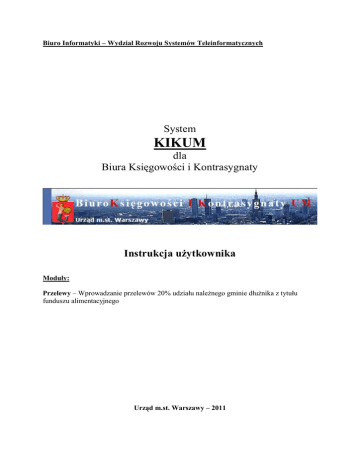 Biuro Informatyki – Wydział Rozwoju Systemów Teleinformatycznych System KIKUM dla Biura Księgowości i Kontrasygnaty Instrukcja uŜytkownika Moduły: Przelewy – Wprowadzanie przelewów 20% udziału naleŜnego gminie dłuŜnika z tytułu funduszu alimentacyjnego Urząd m.st. Warszawy – 2011 System KIKUM (Biuro Księgowości i Kontrasygnaty) dostępny jest z przeglądarki internetowej pod adresem: http://kikum.um.warszawa.pl Jest to system wielomodułowy, w którym sukcesywnie będą dodawane kolejne moduły usprawniające pracę Biura Księgowości i Kontrasygnaty. 1. Autoryzacja Aby rozpocząć pracę w programie naleŜy wykonać proces autoryzacji poprzez podanie swojego Loginu i Hasła. Login i Hasło dla kaŜdego uŜytkownika systemu przekazywane są przez Administratora Systemu. Po wpisaniu swojego Loginu i Hasła naleŜy wcisnąć przycisk [Zaloguj]. 2. Strona główna Po poprawnej autoryzacji otwarta zostanie strona główna systemu. Nagłówek strony Menu Wiadomości ekranowe Na górze strony znajduje się nagłówek strony i menu. W zaleŜności od uprawnień jakie uŜytkownik posiada w systemie w menu wyświetlają odpowiednie opcje. PoniŜej menu znajduje się pasek, w którym przewijają się wiadomości ekranowe. Wiadomości ekranowe są to komunikaty wpisywane przez administratora systemu i widoczne przez wszystkich zalogowanych uŜytkowników. Przesunięcie myszki na pasek wiadomości ekranowych powoduje zatrzymanie przewijania tych wiadomości. Aby odczytać wiadomość ekranową naleŜy kliknąć myszką na przewijającej się wiadomości. 3. Przelewy Moduł Przelewy słuŜy do wprowadzania, zatwierdzania przelewów 20 % udziału naleŜnego gminie dłuŜnika z tytułu funduszu alimentacyjnego. Moduł ten umoŜliwia równieŜ eksport danych o przelewach do systemu CitiDirekt. Aby przejść do modułu Przelewy naleŜy rozwinąć menu [Przelewy] i kliknąć pozycję [Lista przelewów] Otwarte zostanie okno jak na rysunku poniŜej. Lista przelewów składa się z następujących elementów: Przycisku [Dodaj] – słuŜy do dodania nowego przelewu do listy, Wyszukiwarki – słuŜy ona do wyszukiwania przelewów wg. kilku kryteriów: - Dzielnica, - Okres, - Gmina dłuŜnika, - Adres, - Nr rachunku bankowego, - Kwoty (od-do), - Nazwiska i imienia, - Decyzji, - Statusu Listy przelewów. 3.1. Nowy przelew Aby dodać nowy przelew naleŜy myszką kliknąć na przycisku [Dodaj]. Otwarte zostanie okno jak poniŜej. NaleŜy wypełnić kolejno wszystkie pola: Okres – lista rozwijalna, z której moŜna wybrać aktywne w danym momencie okresy. Aktywność okresów ustawia administrator systemu w Biurze Księgowości i Kontrasygnaty. Gmina dłuŜnika – pole tekstowe do wpisania nazwy urzędu gminy dłuŜnika (UM, GOPS, MOPS). Po rozpoczęciu wpisywania tekstu pojawi się lista ze znalezionymi danymi. Kliknięcie myszką na wybranej pozycji na liście spowoduje uzupełnienie danych w pozostałych polach. W celu wyszukania właściwych danych z listy w pole to moŜna wpisywać nazwę urzędu lub miasto. Adres – pola tekstowe, w które naleŜy wpisać dane adresowe urzędu gminy dłuŜnika (ulica, nr budynku, nr lokalu, kod pocztowy, miasto). Nr rachunku bankowego – pole tekstowe (26 znaków), w które naleŜy wpisać pełny numer rachunku bankowego gminy dłuŜnika. Kwota przelewu – pole, w które naleŜy wpisać kwotę przelewu. Pole to kontrolowane jest pod kątem maksymalnej kwoty przelewu jaka moŜe być wpisana. Kwotę tą kontroluje administrator w BkiK. Imię i nazwisko – dwa pola tekstowe, w które naleŜy wpisać imię i nazwisko dłuŜnika. Decyzja – pole tekstowe, w które naleŜy wpisać numer decyzji. Przykładowo wypełniony formularz przelewu pokazany jest poniŜej. Aby zapisać wprowadzone do formularza dane naleŜy kliknąć na przycisku [Zapisz]. W przypadku gdy nie wszystkie wymagane pola zostały wypełnione pojawi się przy nich oznaczenie w postaci czerwonej gwiazdki *. Aby po zapisaniu danych przejść do listy przelewów naleŜy kliknąć na przycisku [Lista przelewów]. 3.2. Lista przelewów 3.2.1. Wyszukiwanie Pozycje na liście przelewów moŜna wyszukiwać przy pomocy wyszukiwarki. Wyszukiwarka umieszczona jest pod przyciskiem [Dodaj], powyŜej właściwej listy przelewów. Wyszukiwać moŜna po następujących polach: Dzielnica – lista rozwijalna, Okres – lista rozwijalna, Gmina dłuŜnika – pole tekstowe, Adres – pole tekstowe, Nr rachunku bankowego – pole tekstowe, Kwota – pola tekstowe (od – do), Nazwisko i imię – pole tekstowe, Decyzja – pole tekstowe, Status – lista rozwijalna Aby wyszukać właściwe pozycje naleŜy wypełnić przynajmniej jedno z pól wyszukiwarki i wcisnąć przycisk w lupką po prawej stronie wyszukiwarki . Aby skasować wprowadzone kryteria i wyświetlić domyślne pozycje naleŜy kliknąć ikonkę . 3.2.2. Podział listy na strony Dane na liście przelewów podzielone są na strony po 10 pozycji. KaŜda strona posiada na dole podsumowanie kwot przelewów na danej stronie. Aby wyświetlić dane na kolejnych stronach naleŜy rozwinąć listę stron i kliknąć na wybranym numerze strony. Lista stron umieszczona jest nad nagłówkiem i pod podsumowaniem tabeli („Idź do strony ...”). 3.2.3. Operacje na liście przelewów W zaleŜności od uprawnień jakie uŜytkownik posiada w systemie na liście przelewów moŜna dokonywać następujący operacji: Modyfikacja przelewu – po kliknięciu na wierszu tabeli z danym przelewem otworzy się okno formularza z moŜliwością edycji danych. Modyfikować moŜna przelewy ze statusem WPRO – wprowadzone. Usunięcie przelewu – przelew ze statusem WPRO moŜe zostać usunięty. Aby usunąć wprowadzony przelew naleŜy na liście przelewów kliknąć ikonkę , która znajduje się w kolumnie „Status” Po kliknięciu pojawi się pytanie „Czy usunąć przelew?” Zatwierdzenie przelewu – przelew ze statusem WPRO moŜe zostać zatwierdzony. Aby zat