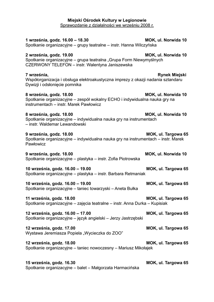 Miejski Ośrodek Kultury w Legionowie Sprawozdanie z działalności we wrześniu 2008 r. 1 września, godz. 16.00 – 18.30 MOK, ul. Norwida 10 Spotkanie organizacyjne – grupy teatralne – instr. Hanna Wilczyńska 2 września, godz. 19.00 MOK, ul. Norwida 10 Spotkanie organizacyjne – grupa teatralna „Grupa Form Niewymyślnych CZERWONY TELEFON – instr. Walentyna Janiszewska 7 września, Rynek Miejski Współorganizacja i obsługa elektroakustyczna imprezy z okazji nadania sztandaru Dywizji i odsłonięcie pomnika 8 września, godz. 18.00 MOK, ul. Norwida 10 Spotkanie organizacyjne – zespół wokalny ECHO i indywidualna nauka gry na instrumentach – instr. Marek Pawłowicz 8 września, godz. 18.00 MOK, ul. Norwida 10 Spotkanie organizacyjne – indywidualna nauka gry na instrumentach – instr. Waldemar Lewandowski 9 września, godz. 18.00 MOK, ul. Targowa 65 Spotkanie organizacyjne – indywidualna nauka gry na instrumentach – instr. Marek Pawłowicz 9 września, godz. 18.00 Spotkanie organizacyjne – plastyka – instr. Zofia Piotrowska MOK, ul. Norwida 10 10 września, godz. 16.00 – 19.00 MOK, ul. Targowa 65 Spotkanie organizacyjne – plastyka – instr. Barbara Retmaniak 10 września, godz. 16.00 – 19.00 Spotkanie organizacyjne – taniec towarzyski – Aneta Bułka MOK, ul. Targowa 65 11 września, godz. 18.00 MOK, ul. Targowa 65 Spotkanie organizacyjne – zajęcia teatralne – instr. Anna Durka – Kupisiak 12 września, godz. 16.00 – 17.00 MOK, ul. Targowa 65 Spotkanie organizacyjne – język angielski – Jerzy Jastrzębski 12 września, godz. 17.00 Wystawa Jeremiasza Popiela „Wycieczka do ZOO” MOK, ul. Targowa 65 12 września, godz. 18.00 MOK, ul. Targowa 65 Spotkanie organizacyjne – taniec nowoczesny – Mariusz Mikołajek 15 września, godz. 16.30 Spotkanie organizacyjne – balet – Małgorzata Harmacińska MOK, ul. Targowa 65 13 września, godz. 14.00 Plac przy ul. Siwińskiego Impreza plenerowa EKOLOGICZNE ZAKOŃCZENIE LATA W programie: • Koncerty zespołów: SORRY BOYS, ODDZIAŁ ZAMKNIĘTY, DAAB, MAANAM, • Wesołe miasteczko • Słowiańska wioska • Widowisko taneczno-pantomimiczne – zespół PROMETEUSZ 19 września, godz. 12.00 – 15.00 CSP Nagłośnienie i obsługa elektroakustyczna imprezy plenerowej – DZIEŃ OTWARTY w CSP 20 września, godz. 19.00 Sala Widowiskowa w Ratuszu Spektakl kabaretowy z udziałem KABARECIARNI Zenona Laskowika pt.: „Co się dzieje, co się dzieje…” 27 września, godz. 20.00 Grzegorz Turnau – koncert piosenki poetyckiej Sala Widowiskowa w Ratuszu 28 września, godz. 12.00 MOK, ul. Targowa 65 Salon Artystyczny im. Fryderyka Chopina – inauguracja sezonu. Koncert muzyki Łacińskiej. 28 września, godz. 15.00 Sala Widowiskowa w Ratuszu Niedzielne Spotkania z Bajką – spektakl teatralny pt.: „Jesień u Kubusia Puchatka” Klub filmowy „POWIETRZA” MOK ul. Norwida 10 4 września, godz. 20.00 - "Jabłka Adama" Reżyseria: Anders Thomas Jensen Scenariusz: Anders Thomas Jensen 11 września, godz. 20.00 - "Babel" Reżyseria: Alejandro Gonzales Inarritu, Scenariusz: Guillermo Arriaga, 18 września, godz. 20.00 - "Pachnidło" Reżyseria: Tom Tykwer, Scenariusz: Andrew Birkin, Caroline Thompson, 25 września, godz. 20.00 - "Kontrolerzy" Reżyseria: Nimród Antal, Scenariusz: Nimród Antal, Jim Adler, W ramach swojej działalności Miejski Ośrodek Kultury prowadzi stałe zajęcia artystyczne dla dzieci, młodzieży i dorosłych: MOK przy ul. Norwida 10: Poniedziałek 15.00 – 18.00 - nowa grupa teatralna - instr. Hanna Wilczyńska 18.00 – 20.00 – grupa teatralna dla młodzieży gimnazjalnej TERAZ JUŻ WŁAŚNIE - instr. Hanna Wilczyńska 14.00 – 18.00 – indywidualna nauka gry na gitarze klasycznej i elektrycznej – inst.. Waldemar Lewandowski 13.00 – 19.15 – indywidualna nauka gry na pianinie, akordeonie, gitarze klasycznej – instr. Marek Pawłowicz 17.00 – 21.00 – zajęcia dla zespołu wokalno- tanecznego SZACHRAJ (sala WOK ul. Zegrzyńska) Wtorek 15.00 – 18.00 – teatr ewangelizacyjny ADONAI - instr. Hanna Wilczyńska 19.00 – 22.00 – grupa teatralna dla dorosłych GRUPA FORM NIEWYMYŚLNYCH CZERWONY TELEFON inst. Walentyna Janiszewska 16.15 – 17.30 – zajęcia plastyczne dla dzieci 5 – 6 lat - instr. Zofia Piotrowska 17.45 – 19.45 – zajęcia plastyczne dla dzieci z klas IV – VI - instr. Zofia Piotrowska 13.00 – 17.45 - indywidualna nauka gry na pianinie, akordeonie, gitarze klasycznej – instr. Marek Pawłowicz Środa 15.00 – 17.00 – grupa teatralna dla młodzieży gimnazjalnej TERAZ JUŻ WŁAŚNIE - instr. Hanna Wilczyńska 17.00 – 20.00 – zajęcia dla zespołu wokalnego ECHO 16.15 – 17.45 – zajęcia plastyczne – tkactwo dla wszystkich grup wiekowych- instr. Zofia Piotrowska 17.45 – 19.45 – zajęcia plastyczne dla dzieci klas I - III- instr. Zofia Piotrowska 14.30 – 17.00 - indywidualna nauka gry na pianinie, akordeonie, gitarze klasycznej – instr. Marek Pawłowicz 17.00 – 21.00 - zajęcia dla zespołu wokalno- tanecznego SZACHRAJ (sala WOK ul. Zegrzyńska) Czwartek 16.00 - 19.30 - teatr ewangelizacyjny ADONAI - instr. Hanna Wilczyńska 14.00 – 16.00 - zajęcia dla zespołu wokalnego MAŁE ECHO – instr. Marek Pawłowicz 16.15 – 18.00 - zajęcia plastyczne dla uczniów gimnazjum i liceum - instr. Zofia Piotrowska 18.00 – 20.00 - zajęcia plastyczne dla uczniów gimnazjum i liceum - instr. Zofia Piotrowska 16.00 – 19.15 - indywidualna nauka gry na pianinie, akordeonie, gitarze klasycznej – instr. Marek Pawłowicz 20.00 – 22.00 – spotkanie Klubu Filmowego POWIETRZA – Mariusz Kraszewski 17.00 – 21.00 - zajęcia dla zespołu wokalno- tanecznego SZACHRAJ (sala WOK ul. Zegrzyńska) Piątek 17.00 – 20.30 – Klub Szachistów Filia MOK przy ul. Targowej 65 Poniedziałek 8.00 – 13.00 – zintegrowane zajęcia artystyczne dla najmłodszych MOKUŚ 17.30 – 18.15 – Balet (grupa młodsza) – MałgorzataHarmacińska 18.3