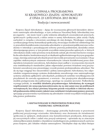 UCHWAŁA PROGRAMOWA XI KRAJOWEGO ZJAZDU ADWOKATURY z dnia 23 listopada 2013 roku Tradycja i nowoczesność Krajowy Zjazd Adwokatury – dążąc do wyznaczenia głównych kierunków aktywności samorządu adwokackiego, w tym zwłaszcza Naczelnej Rady Adwokackiej oraz jej organów – nie może tracić z pola widzenia aktualnych uwarunkowań prawnych, społecznych i politycznych, a także zmian w samej Adwokaturze, jakie zaszły i będą zachodzić w związku z otwarciem szerokiego do niej dostępu. Wynikające z postępu cywilizacyjnego formy komunikacji społecznej, stwarzające możliwość odmiennego niż w przeszłości kształtowania wizerunku adwokatów w przestrzeni publicznej oraz wchodzenia w interakcje z poszukującymi ochrony prawnej podmiotami, dynamika zmian obowiązującego prawa, w tym przede wszystkim zmian procedur sądowych, w których Adwokatura miała i mieć powinna swój doniosły udział, jak również lawinowo rosnąca liczba adwokatów, konfrontowanych ze skutkami ogólnoświatowego kryzysu gospodarczego, stawiają samorząd adwokacki przed niezwykle poważnymi wyzwaniami. Chcąc zapobiec niekorzystnym zmianom wizerunkowym i utracie kształtowanej przez dziesięciolecia tożsamości zawodowej, Adwokatura musi zadbać o wyznaczenie etycznych oraz intelektualnych standardów, jakim odpowiadać powinni świadomi swej przynależności zawodowej oraz prezentujący wysoki poziom profesjonalizmu adwokaci. Nie da się tego osiągnąć bez niezawisłości i pełnej samorządności Adwokatury, bez odpowiednio zorganizowanego systemu doskonalenia zawodowego oraz samorządowego systemu szkolenia aplikantów adwokackich, poddanych rzetelnie weryfikującemu ich przydatność do zawodu egzaminowi, a wreszcie – bez przejrzyście ukształtowanego modelu postępowania dyscyplinarnego, opartego na zasadzie jawności. Podkreślenia wymaga jednak, że wszelkie działania przystosowujące Adwokaturę do wymagań współczesności nie oznaczają koncentrowania się na niej samej oraz jej problemach wewnętrznych, lecz służyć powinny leżącemu przede wszystkim w interesie obywateli podnoszeniu efektywności, jakości oraz rzetelności świadczonej pomocy prawnej, sprzyjając pozytywnemu wyróżnieniu się adwokatów wśród wszystkich świadczących taką pomoc podmiotów. I. Kształtowanie w przestrzeni publicznej wizerunku Adwokatury Krajowy Zjazd Adwokatury – dostrzegając potrzebę budowania w przestrzeni publicznej pozytywnego wizerunku Adwokatury oraz docierania do świadomości społecznej ze spójnym, atrakcyjnym oraz konsekwentnym przekazem, dotyczącym jej rzeczywistych celów i zadań oraz pozycji ustrojowej – opowiada się za znacznym zintensyfikowaniem działań o charakterze marketingowym, podejmowanych zarówno przez krajowe, jak i lokalne władze samorządowe. Niezbędne staje się także bieżące 19 Uchwała programowa... PALESTRA reagowanie na wszystkie ważne w wymiarze społecznym wydarzenia, tak by głos Adwokatury stał się trwałym elementem rzeczywistości medialnej. Krajowy Zjazd Adwokatury zobowiązuje Naczelną Radę Adwokacką do podjęcia działań zmierzających do promowania w świadomości społecznej: − wizerunku adwokata jako zawodu kojarzonego z profesjonalizmem, doświadczeniem, rzetelnością oraz wysokim poziomem merytorycznym i etycznym świadczonych usług; − aktywności społecznej organów Adwokatury i adwokatów, w szczególności uczestnictwa w pracach legislacyjnych zarówno na szczeblu krajowym, jak i lokalnym oraz działalności pro bono; − usług świadczonych przez adwokatów jako dostępnych cenowo dla ogółu społeczeństwa, zrozumiałych i bliskich obywatelowi; − potrzeby korzystania z ubezpieczeń ochrony prawnej. Nieodzowne jest także uświadamianie obywatelom, że najpełniejszą ochronę prawną można im zagwarantować wówczas, gdy korzystać będą z usług adwokackich już w czasie dokonywania ważnych czynności mających znaczenie prawne lub zaraz po wystąpieniu problemu, nie zaś dopiero na etapie sporu sądowego. Krajowy Zjazd zobowiązuje Naczelną Radę Adwokacką do przygotowania zakrojonej na możliwie szeroką skalę kampanii społecznościowej, służącej czytelnemu i jednoznacznemu odróżnieniu zawodu adwokata od innych zawodów prawniczych, której powinny towarzyszyć długofalowe działania, skierowane także do wewnątrz środowiska adwokackiego. Nieodzowne jest również ułatwienie dostępu do danych o adwokatach poprzez upowszechnianie Krajowego Rejestru Adwokatów i Aplikantów Adwokackich oraz zdecydowane promowanie (w mediach, materiałach samorządowych, a także wśród najmłodszych członków samorządu, którzy dopiero do niego wstępują) Znaku Adwokatury jako wyrazistego wyróżnika określającego tożsamość zawodową. Osiągnięcie powyższych celów wymaga profesjonalizacji działań krajowych i lokalnych władz Adwokatury, nawet jeśliby koszty takich działań miały okazać się znaczące. Konieczne staje się zatem promowanie zmiany sposobu postrzegania przez adwokatów funkcji składek i wydatków samorządowych. Pamiętając o konieczności łączenia wymogów nowoczesności z chlubną tradycją zawodu adwokata, Krajowy Zjazd Adwokatury zobowiązuje Naczelną Radę Adwokacką do utworzenia Archiwum Adwokatury Polskiej, tak by stało się ono jednym z istotnych elementów kształtowania wizerunku Adwokatury w przestrzeni publicznej. Naczelna Rada Adwokacka powinna wspierać działania w zakresie propagowania kultury, umacniające wizerunek Adwokatury jako mecenasa sztuki narodowej. II. Działalność Adwokatury na rzecz interesu publicznego Adwokatura podkreśla, że prawo winno w sposób jasny i czytelny dla obywatela kształtować jego prawa i obowiązki. Z tego też względu Krajowy Zjazd Adwokatury zobowiązuje Naczelną Radę Adwokacką do aktywnego uczestniczenia w procesie legislacyjnym, w tym zwłaszcza promowania zmian, których efektem winna być przede ws