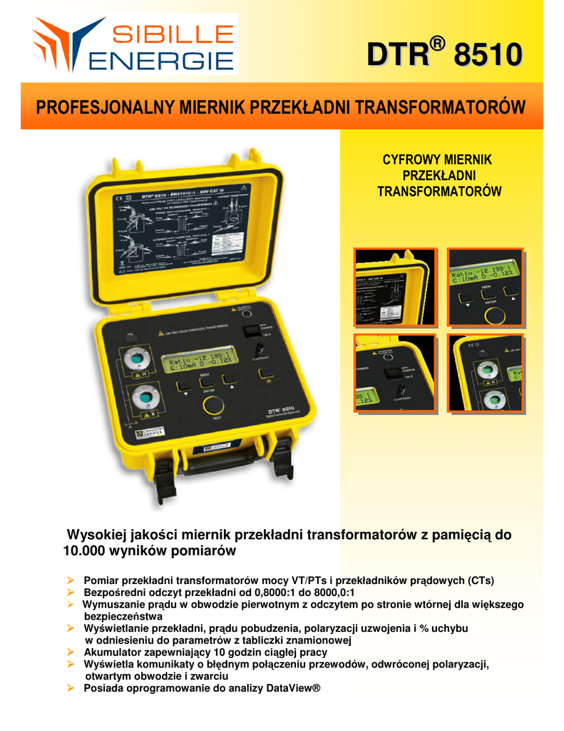 ® DTR 8510 PROFESJONALNY MIERNIK PRZEKŁADNI TRANSFORMATORÓW CYFROWY MIERNIK PRZEKŁADNI TRANSFORMATORÓW Wysokiej jakości miernik przekładni transformatorów z pamięcią do 10.000 wyników pomiarów Pomiar przekładni transformatorów mocy VT/PTs i przekładników prądowych (CTs) Bezpośredni odczyt przekładni od 0,8000:1 do 8000,0:1 Wymuszanie prądu w obwodzie pierwotnym z odczytem po stronie wtórnej dla większego bezpieczeństwa Wyświetlanie przekładni, prądu pobudzenia, polaryzacji uzwojenia i % uchybu w odniesieniu do parametrów z tabliczki znamionowej Akumulator zapewniający 10 godzin ciągłej pracy Wyświetla komunikaty o błędnym połączeniu przewodów, odwróconej polaryzacji, otwartym obwodzie i zwarciu Posiada oprogramowanie do analizy DataView® SKUTECZNY TESTER PRZEKŁADNI ® DTR 8510 ZALETY Mierzy przekładnie transformatorów mocy, VT/PTs i przekładników prądowych. Wyświetla przekładnię, prąd pobudzenia, polaryzację uzwojenia i % uchybu w odniesieniu do parametrów z tablicy znamionowej. Szybki i inteligentny prostownik z uniwersalnym wejściem napięciowym (100-240V, 50-60Hz) ładuje baterie w czasie poniżej 4 godzin. Wewnętrzny akumulator NiMH zapewnia 10 godzin ciągłej pracy. Wymusza prąd w obwodzie pierwotnym z odczytem po stronie wtórnej dla większego bezpieczeństwa. Wyświetla komunikaty o błędnym połączeniu przewodów, odwróconej polaryzacji, otwartym obwodzie i zwarciu. DTR®8510 jest przenośnym cyfrowym miernikiem do badania przekładni transformatorów mocy, napięciowych i prądowych. Podłączony do niezasilanego transformatora, miernik dokładnie mierzy współczynnik przekładni prądu pierwotnego-dowtórnego, jednocześnie wyświetlając polaryzację i prąd pobudzenia. ® DTR 8510 jest przyrządem najnowszej technologii, ulepszającym swego poprzednika DTR®8500, który znakomicie sprawdził się w terenie. DTR®8510 jest w pełni automatyczny i stosuje metodę badań IEEE C57.12-90™-2006 : - bez kalibracji - bez wyboru zakresu - bez ręcznego ustawiania - bez żmudnego równoważenia Łatwe podłączenie i badanie instalacji; nie wymaga kalibracji i kompensacji. Duży podwójny wyświetlacz z regulowanym kontrastem zapewnia dobrą widoczność w każdych warunkach oświetleniowych. Wskaźnik rozładowania baterii Wybór filtra do poprawy wyników badań w środowisku zakłóceń elektrycznych. Port USB upraszczający konfigurację przyrządu i pobieranie wyników badań. Zawiera oprogramowanie DataView® do analizy programowania, pobierania i gromadzenia wyników badań z możliwością generowania raportów. Przy każdym pomiarze, DTR automatycznie sprawdza otwarte uzwojenia, połączenia, wyłączniki, zwarcia (za duży prąd wzbudzenia), nieprawidłowe rozmieszczenie przewodów pomiarowych i odwrotną biegunowość. DTR® został zaprojektowany z myślą o bezpieczeństwie operatora. Badania przeprowadzane są przy niskim napięciu i zupełnie inaczej niż w innych miernikach przekładni, przy obniżonym prądzie wzbudzenia. Ta metoda, w połączeniu ze zintegrowanym obwodem ochrony przed inwersją H/X, chroni przed tworzeniem niebezpiecznych napięć pomiarowych. W wewnętrznej pamięci DTR®8510 może być zgromadzonych do 10.000 pomiarów. Duży, podwójny alfanumeryczny liniowy ekran LCD z ustawianym kontrastem i podświetlaniem gwarantuje szybkie, dokładne wyświetlanie i doskonałą czytelność, zarówno w dzień, jak i w nocy. Wytrzymały i niezawodny, DTR® 8510 zamknięty jest w atrakcyjnej polipropylenowej obudowie, wytrzymującej rygorystyczne warunki w terenie. Zasilany jest wbudowanym akumulatorem NiMH, ładowanym zewnętrzną ładowarką. BUDOWA Podświetlany ekran z 2 liniami po 16 znaków Gniazdo wejściowe ładowania baterii Włącznik zasilania Wejście USB Wskaźnik działania i rozładowania baterii Ustawianie kontrastu ekranu Podłączenie kabla „H” Strona pierwotna Klawisze funkcyjne do programowania i wyświetlania wyników Przycisk kontrolny wyświetlania (*) Podłączenie kabla „L” Strona wtórna Przycisk pomiaru Łatwa, szybka praca – jasne informacyjne wyświetlanie danych Główny wyświetlacz Łatwy wybór trybu pomiaru Wyświetlenie wyniku pomiaru Przechowywanie wyników w wewnętrznej pamięci Wyraźne wskazanie błędów połączeń i innych problemów Programowanie i przechowywanie 10 przekładni na tabliczce znamionowej OPROGRAMOWANIE DataView® Oprogramowanie Analizy Danych i Raportów Konfiguracja wszystkich funkcji DTR® Wyświetla i analizuje dane na PC Konfiguruje funkcje i parametry DTR® na PC Dostosowuje widoki, szablony i raporty do własnych potrzeb Tworzy i przechowuje kompletną bibliotekę konfiguracji jakie mogą być przesłane do DTR®8510 zależnie od potrzeb Uruchamia pomiary bezpośrednio z PC Drukuje raporty przy użyciu standardowych lub niestandardowych szablonów, które można zaprojektować Pomiar na transformatorze w warsztacie Pomiar przekładni na transformatorze prądowym SPECYFIKACJA Zakres przekładni (VT/PT) Dokładność (VT/PT) Zakres przekładni Dokładność (CT) Sygnał pobudzenia Wyświetlanie prądu pobudzenia Częstotliwość pobudzenia Wyświetlacz Języki Metoda pomiarowa Zasilanie Czas pracy Ładowanie Czas ładowania Pamięć Data/Godzina Interfejs Oprogramowanie PARAMETRY MECHANICZNE Wymiary Waga Gniazdo Przewody Obudowa Odporność na drgania Odporność na wstrząsy Odporność na upadek IP BEZPIECZEŃSTWO CE Podwójna izolacja Bezpieczeństwo W CELU ZAMÓWIENIA Pomiar na 3-fazowym transformatorze 2.000 kVA w terenie Automatyczny: od 0,8000 do 8000:1 Zakres przekładni Dokładność (% wartości odczytu) od 0,8000 do 9,9999 ± 0,2% od 10,000 do 999,99 ± 0,1% od 1000,0 do 4999,9 ± 0,2% od 5000,0 do 8000,0 ± 0,25% Automatyczny: od 0,8000 do 1000,0 Zakres przekładni Dokładność (% wartości odczytu) Od 0,8000 do 1000,0 0,5% Tryb VT/PT: 32 Vrms maks.: Tryb CT: Automatyczny poziom od 0 do 1A, od 0,1 do 4,5 Vrms Zakres: 