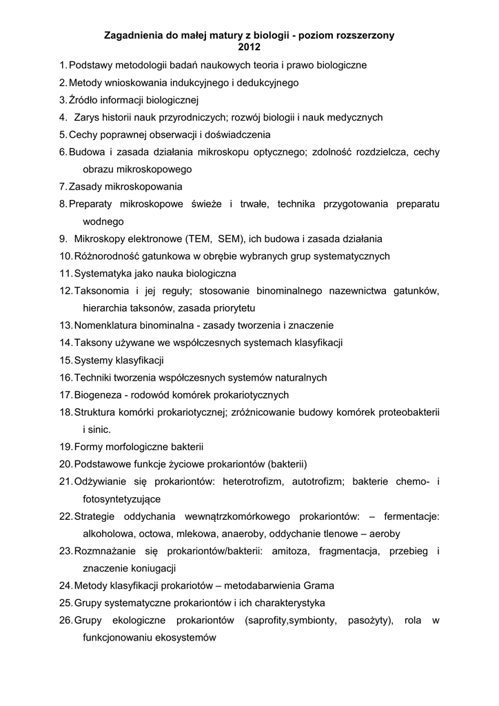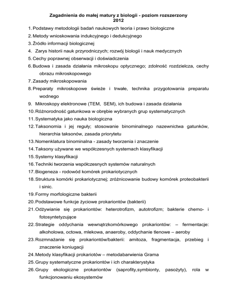 Zagadnienia do małej matury z biologii - poziom rozszerzony 2012 1. Podstawy metodologii badań naukowych teoria i prawo biologiczne 2. Metody wnioskowania indukcyjnego i dedukcyjnego 3. Źródło informacji biologicznej 4. Zarys historii nauk przyrodniczych; rozwój biologii i nauk medycznych 5. Cechy poprawnej obserwacji i doświadczenia 6. Budowa i zasada działania mikroskopu optycznego; zdolność rozdzielcza, cechy obrazu mikroskopowego 7. Zasady mikroskopowania 8. Preparaty mikroskopowe świeże i trwałe, technika przygotowania preparatu wodnego 9. Mikroskopy elektronowe (TEM, SEM), ich budowa i zasada działania 10. Różnorodność gatunkowa w obrębie wybranych grup systematycznych 11. Systematyka jako nauka biologiczna 12. Taksonomia i jej reguły; stosowanie binominalnego nazewnictwa gatunków, hierarchia taksonów, zasada priorytetu 13. Nomenklatura binominalna - zasady tworzenia i znaczenie 14. Taksony używane we współczesnych systemach klasyfikacji 15. Systemy klasyfikacji 16. Techniki tworzenia współczesnych systemów naturalnych 17. Biogeneza - rodowód komórek prokariotycznych 18. Struktura komórki prokariotycznej; zróżnicowanie budowy komórek proteobakterii i sinic. 19. Formy morfologiczne bakterii 20. Podstawowe funkcje życiowe prokariontów (bakterii) 21. Odżywianie się prokariontów: heterotrofizm, autotrofizm; bakterie chemo- i fotosyntetyzujące 22. Strategie oddychania wewnątrzkomórkowego prokariontów: – fermentacje: alkoholowa, octowa, mlekowa, anaeroby, oddychanie tlenowe – aeroby 23. Rozmnażanie się prokariontów/bakterii: amitoza, fragmentacja, przebieg i znaczenie koniugacji 24. Metody klasyfikacji prokariotów – metodabarwienia Grama 25. Grupy systematyczne prokariontów i ich charakterystyka 26. Grupy ekologiczne prokariontów funkcjonowaniu ekosystemów (saprofity,symbionty, pasożyty), rola w Zagadnienia do małej matury z biologii - poziom rozszerzony 2012 27. Rola bakterii w cyklach biogeochemicznych węgla i azotu – bakterie wiążące azot cząsteczkowy 28. Gospodarcze znaczenie bakterii 29. Pochodzenie i ogólna charakterystyka wirusów 30. Budowa i kształty wirionów 31. Etapy infekcji wirusowej; cykl rozwojowy lityczny i lizogeniczny 32. Kryteria klasyfikacji i systematyka wirusów 33. Choroby wirusowe zwierząt, człowieka i roślin 34. Bezkomórkowe czynniki chorobotwórcze; wiroidy, priony 35. Powstanie komórki eukariotycznej – teoria endosymbiozy 36. Polifiletyczny charakter i ogólna charakterystyka protestów 37. Zróżnicowanie morfologiczne protistów; jednokomórkowe, komórczaki, kolonijne, wielokomórkowe i środowisko życia protestów 38. Wybrane czynności życiowe protestów a) odżywianie: -autotrofizm,-heterotrofizm - sposoby pobierania pokarmów: wchłanianie, pinocytoza, fagocytoza, myksotrofizm, b) oddychanie tlenowe, c) osmoregulacja i wydalanie - roztwory izotoniczne, hipertoniczne; wodniczki tętniące,d) wrażliwość - polaryzacja błony komórkowej, e)ruch -techniki lokomocji wśród protestów 39. Strategie rozmnażania się protistów 40. Zalety i wady rozmnażania bezpłciowego i płciowego 41. Cykle życiowe protistów jednokomórkowych: z mejozą post- i pregamiczną, przemiany pokoleń u wielokomórkowych protistów; przemiany izo- i heteromorficzne 42. Proces izogamii, anizogamii i oogamii 43. Główne linie rozwojowe protistów; krasnorosty, zielenice, stramenopile, alweolaty, euglenozoa, sarkodowe 44. Charakterystyka środowisk życia, budowy oraz funkcji życiowych wybranych grup protistów 45. Rola protistów w funkcjonowaniu biosfery oraz w życiu człowieka - pasożytnicze protisty 46. Warunki fizykochemiczne środowiska wodnego i lądowego 47. Główne przystosowania roślin do życia na lądzie 48. Opanowanie środowiska lądowego przez rośliny - pierwsze rośliny 49. Założenia teorii telomowej.Główne linie rozwojowe roślin. Zagadnienia do małej matury z biologii - poziom rozszerzony 2012 50. Mszaki jako odrębna linia organowców,ogólna systematyka mszaków 51. Pochodzenie i środowisko życia mszaków 52. Zróżnicowanie budowy morfologicznej mszaków; gametofit, sporofit 53. Budowa anatomiczna mszaków wyrazem przystosowania do życia na lądzie 54. Morfologia gametofitu i sporofitu mszaków 55. Budowa gametangiów mszaków; plemnio i rodniostany, jednopienność a dwupienność 56. Budowa zarodni mszaków 57. Przemiana pokoleń mszaków – dominacja gametofitu 58. Rozmnażanie wegetatywne mszaków 59. Przegląd systematyczny mszaków 60. Znaczenie biologiczne mszaków; mszaki jako rośliny pionierskie, glebotwórcze, eutrofizacja wód 61. Rola mszaków w obiegu wody w przyrodzie 62. Gospodarcze i lecznicze znaczenie mszaków; materiał opałowy, użyźnianie gleby, znaczenie przemysłowe mszaków 63. Definicja tkanki 64. Klasyfikacja tkanek roślinnych: twórcze, stałe (okrywająca, wypełniająca wzmacniająca, przewodząca) 65. Lokalizacja, rodzaje, budowa i funkcje merystemów 66. Lokalizacja, rodzaje, budowa i funkcje tkanek stałych: 67. -tkanka okrywająca korzenia, łodygi i liści - wytwory tkanki okrywającej: -tkanka miękiszowa, typy miękiszu, - tkanka wzmacniająca, -tkanka przewodząca naczynia a rurki sitowe, - tkanka wydzielnicza 68. Tkanki roślinne a tkanki zwierzęce 69. Paprotniki, jako odrębna linia właściwych organowców lądowych - ogólna systematyka paprotników 70. Budowa morfologiczna paprotników; gametofit, sporofit - organy wegetatywne i rozrodcze 71. Budowa anatomiczna paprotników wyrazem przystosowania do życia na lądzie 72. Gametofit a sporofit paprotników 73. Paprotniki jednako- i różnozarodnikowe 74. Przemiana pokoleń paprotników jednako-i różnozarodnikowych - dominacja sporofitu Zagadnienia do małej matury z biologii - poziom rozszerzony 2012 75. Przegląd systematyczny paprotników - pospolite gatunki skrzypów i paproci 76. Ochrona gatunkowa paprotników 77. Historyczne i współczesne znaczenie paprotników,- 