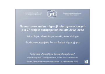 Scenariusze zmian migracji międzynarodowych dla 27 krajów europejskich na lata 2002–2052 Jakub Bijak, Marek Kupiszewski, Anna Kicinger Środkowoeuropejskie Forum Badań Migracyjnych Konferencja „Perspektywy demograficzne Europy” Instytut Statystyki i Demografii SGH, ŚFBM oraz IOM Warsaw Szkoła Główna Handlowa w Warszawie, 19 października 2005 Plan prezentacji 1. Swobodny przepływ pracowników w Europie: status quo i oczekiwania na przyszłość Migracje w Europie po rozszerzeniu UE 2. – – 3. Scenariusze migracji netto spoza Unii Europejskiej – – 4. Trzy scenariusze migracji: założenia Kwantyfikacja założeń Trzy scenariusze migracji: założenia Kwantyfikacja założeń Podsumowanie i wnioski Swobodny przepływ pracowników w Europie PODSTAWY PRAWNE: ¾ Wspólnotowe uregulowania dot. swobody przepływu osób; ¾ Europejski Obszar Gospodarczy (Norwegia, Islandia, Liechtenstein); ¾ Umowy bilateralne między UE a Szwajcarią; ¾ Traktat o Przystąpieniu do Unii Europejskiej Republiki Czeskiej, Estonii, Cypru, Łotwy, Litwy, Węgier, Malty, Polski, Słowenii i Słowacji (2003 r.); ¾ Traktat dotyczący przystąpienia Republiki Bułgarii i Rumunii do Unii Europejskiej (2005 r.); Swobodny przepływ pracowników w Europie ROZSZERZENIE 2004 i 2007 OKRESY PRZEJŚCIOWE w zakresie swobody przepływu osób Formuła 2 + 3 + 2 zgodnie z Aktem o przystąpieniu (2003) i (2005) Swobodny przepływ pracowników w Europie Główne zapisy dotyczące okresów przejściowych: • • • • • • • • Decyzja pozostawiona państwom Formuła 2 + 3 + 2 Zakres stosowania ograniczeń: PRACOWNICY Zakres stosowania ograniczeń: 8 z 10 nowych państw Zasada wzajemności „Standstill clause” Możliwość wycofania się Zasada preferencji Swobodny przepływ pracowników w Europie Efekty okresów przejściowych: • Zróżnicowanie sytuacji prawnej w poszczególnych krajach europejskich • Współistnienie krajowych i wspólnotowych uregulowań prawnych dot. swobody przepływu osób • „Efekt domina” i zamknięcie większości rynków „starej Unii” na pracowników z nowych państw Swobodny przepływ pracowników w Europie Przewidywane scenariusze otwarcia rynków pracy państw UE-15 oraz Norwegii i Szwajcarii: 2004 Irlandia, Szwecja, Wielka Brytania 2006 Belgia, Holandia, Luksemburg, Dania, Finlandia, Norwegia Swobodny przepływ pracowników w Europie Przewidywane scenariusze otwarcia rynków pracy państw UE-15 oraz Norwegii i Szwajcarii: 2009 Francja, Grecja, Hiszpania, Portugalia, Włochy 2011 Niemcy, Austria 2014 Szwajcaria (umowy dwustronne) Swobodny przepływ pracowników w Europie Przewidywane scenariusze otwarcia rynków pracy państw UE-15 oraz Norwegii i Szwajcarii: Zasada wzajemności Bułgaria Rumunia 2007 Zastosowana tylko przez Polskę, Węgry, Słowenię Przesunięcie scenariuszy otwarcia o 3 lata Swobodny przepływ pracowników w Europie Otwieranie się rynków pracy krajów Europy Zachodniej Migracje w Europie po rozszerzeniu UE • • Przedmiot analizy: osiedleńcze migracje rejestrowane W latach 1992-2003 dużo prac badawczych (głównie w Niemczech i Austrii) poświęconych próbom prognozy migracji poakcesyjnych Krytyka istniejących opracowań: • – przewidywania wielkości migracji z ośmiu środkowoeuropejskich krajów akcesyjnych do UE-15 od 140 tys. do ponad miliona osób rocznie – brak kompleksowych prognoz migracji do krajów akcesyjnych oraz ruchów ludności pomiędzy nimi – koncentracja wyłącznie na ekonomicznych determinantach migracji Migracje w Europie po rozszerzeniu UE • Trzy warianty prognozy – podstawowy: stabilny wzrost gospodarczy, postępy procesów integracyjnych w Europie, zbieżność poziomów życia, ogólny wzrost mobilności – wysoki: szybki wzrost gospodarczy i niwelowanie różnic w poziomie życia, znaczący wzrost mobilności – niski: stagnacja ekonomiczna, utrzymujące się rozbieżności między Wschodem a Zachodem, wysoka presja migracyjna • Dane wyjściowe za 2002 rok – Źródła: Rada Europy (2003), Eurostat - NewCronos – Macierz przepływów migracyjnych (O-D), szacowanych jako większe z liczb podawanych przez kraje pochodzenia migrantów i kraje docelowe (por. Kupiszewski 2002) – Struktury według wieku: dane niemieckie przyjęte jako wzorcowe, z wyjątkiem migracji na południe Europy Migracje w Europie po rozszerzeniu UE • Podstawowe składniki prognozowanej wielkości migracji między krajami europejskimi: – Trend, charakteryzujący się ogólnym wzrostem mobilności w trzech wariantach (niski: stała mobilność, podstawowy: wzrost o 0,5% rocznie, wysoki: wzrost o 1% rocznie) – Zaburzenia trendu wynikające z otwierania kolejnych rynków pracy według schematu 0 – 2 – 5 – 7 lat. • Trzy okresy rozwoju przepływów migracyjnych: – Okres przedakcesyjny: kontynuacja trendów z przeszłości – Okres poakcesyjny: krótkotrwałe wzrosty przepływów migracyjnych, zwłaszcza do Europy Zachodniej, wywołany przez otwieranie się nowych rynków pracy – Długookresowa stabilizacja: powrót do trendu Migracje w Europie: kwantyfikacja założeń • Podział badanych krajów na trzy grupy: – Europa Zachodnia (UE-15 + Norwegia i Szwajcaria) – Europa Środkowa (8 nowych krajów członkowskich) – Europa Południowo-Wschodnia (Bułgaria i Rumunia) • 9 scenariuszy dla przepływów między grupami (a nie dla wszystkich 702 par krajów) • Prognozowana wartość migracji: iloczyn trendu dla danego wariantu projekcji przez czynnik wzrostu po otwarciu rynków pracy: – Ustalony dla danej pary grup krajów dla każdego z wariantów – Malejący według krzywej logistycznej aż do powrotu do trendu Europa Pd.-Wsch. Europa Środkowa Europa Zachodnia Z \ Do Europa Zachodnia Europa Środkowa West - West migration scenarios Initial migration rate = 100 Europa Pd.-Wsch. West - Central migration scenarios Initial migration rate = 100 West - East migration scenarios Initial migration ra