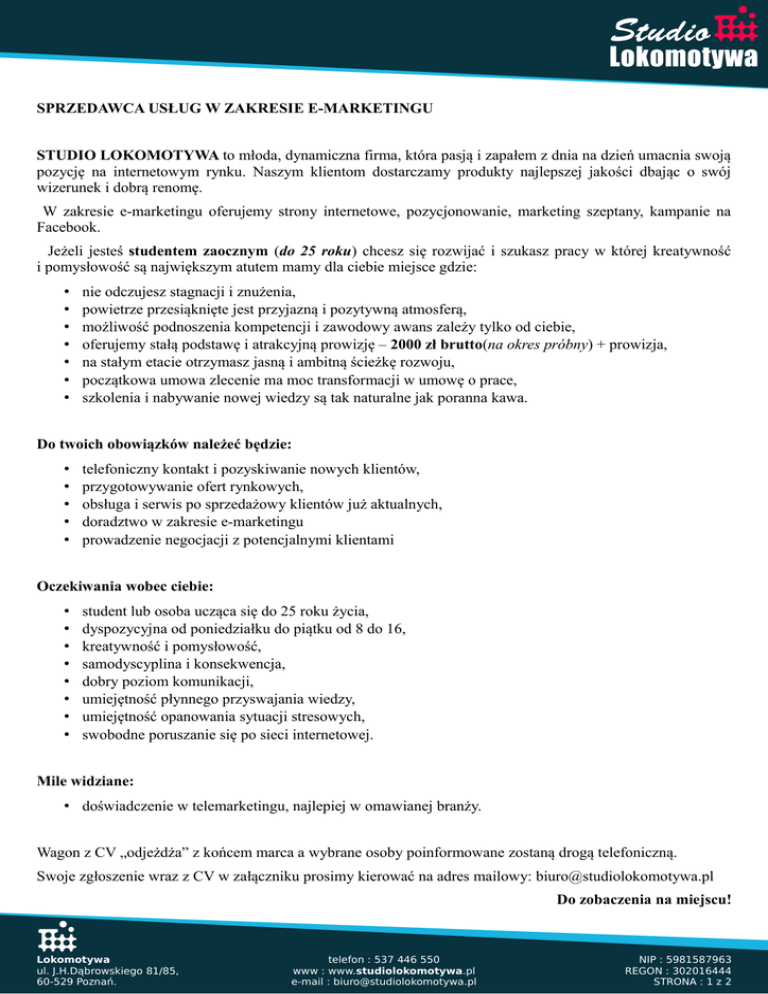 SPRZEDAWCA USŁUG W ZAKRESIE E-MARKETINGU STUDIO LOKOMOTYWA to młoda, dynamiczna firma, która pasją i zapałem z dnia na dzień umacnia swoją pozycję na internetowym rynku. Naszym klientom dostarczamy produkty najlepszej jakości dbając o swój wizerunek i dobrą renomę. W zakresie e-marketingu oferujemy strony internetowe, pozycjonowanie, marketing szeptany, kampanie na Facebook. Jeżeli jesteś studentem zaocznym (do 25 roku) chcesz się rozwijać i szukasz pracy w której kreatywność i pomysłowość są największym atutem mamy dla ciebie miejsce gdzie: • • • • • • • nie odczujesz stagnacji i znużenia, powietrze przesiąknięte jest przyjazną i pozytywną atmosferą, możliwość podnoszenia kompetencji i zawodowy awans zależy tylko od ciebie, oferujemy stałą podstawę i atrakcyjną prowizję – 2000 zł brutto(na okres próbny) + prowizja, na stałym etacie otrzymasz jasną i ambitną ścieżkę rozwoju, początkowa umowa zlecenie ma moc transformacji w umowę o prace, szkolenia i nabywanie nowej wiedzy są tak naturalne jak poranna kawa. Do twoich obowiązków należeć będzie: • • • • • telefoniczny kontakt i pozyskiwanie nowych klientów, przygotowywanie ofert rynkowych, obsługa i serwis po sprzedażowy klientów już aktualnych, doradztwo w zakresie e-marketingu prowadzenie negocjacji z potencjalnymi klientami Oczekiwania wobec ciebie: • • • • • • • • student lub osoba ucząca się do 25 roku życia, dyspozycyjna od poniedziałku do piątku od 8 do 16, kreatywność i pomysłowość, samodyscyplina i konsekwencja, dobry poziom komunikacji, umiejętność płynnego przyswajania wiedzy, umiejętność opanowania sytuacji stresowych, swobodne poruszanie się po sieci internetowej. Mile widziane: • doświadczenie w telemarketingu, najlepiej w omawianej branży. Wagon z CV „odjeżdża” z końcem marca a wybrane osoby poinformowane zostaną drogą telefoniczną. Swoje zgłoszenie wraz z CV w załączniku prosimy kierować na adres mailowy: [email protected] Do zobaczenia na miejscu! Lokomotywa ul. J.H.Dąbrowskiego 81/85, 60-529 Poznań. telefon : 537 446 550 www : www.studiolokomotywa.pl e-mail : [email protected] NIP : 5981587963 REGON : 302016444 STRONA : 1 z 2