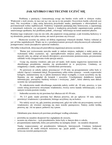 JAK SZYBKO I SKUTECZNIE UCZYĆ SIĘ Problemy z pamięcią i koncentracją uwagi ma bardzo wiele osób w różnym wieku. Większość z nich uważa, że tacy już są i nic się na to nie poradzi. Oczywiście każdy człowiek jest inny. Nie wszystkim z taką samą łatwością przychodzi nauka, pamiętanie o obowiązkach czy powinnościach wobec najbliższych. Niektórzy wspaniale pamiętają daty historyczne, a zapominają o imieninach rodziców czy przyjaciół. Innym z trudnością przychodzi zapamiętywanie godziny umówionego spotkania, bez problemu jednak ,,wkuwają” informacje na temat anatomii płazów. Pomimo tego większość z nas nic nie robi, aby poprawić swoją pamięć, a jak twierdzą fachowcy w tej dziedzinie, pamięć nie tylko można, ale nawet powinno się ćwiczyć. Skuteczne uczenie się zależy od dobrej organizacji własnych działań. Należy wdrażać je już od klas najmłodszych. Wiąże się to z przełamywaniem pewnych dotychczasowych schematów postępowania i może początkowo sprawiać trudności. Oto kilka wskazówek, dotyczących prawidłowej organizacji procesu uczenia się: Ważne jest wytworzenie nawyku nauki w stałym miejscu, najlepiej o stałej porze, po wykonaniu kilku czynności, np.: uporządkowanie miejsca pracy, włączenie ulubionej muzyki (aby się odciąć od innych dźwięków), przewietrzenie pomieszczenia, przyniesienie szklanki wody (niegazowana woda sprzyja nauce). Ucząc się, musimy wiedzieć, jaki jest cel nauki. Jeśli mamy negatywne nastawienie do określonego przedmiotu, staramy się przekształcić je w pozytywne. Ustalamy, co osiągniemy z nauki, zapisujemy i wielokrotnie powtarzamy. Po powrocie ze szkoły należy przeznaczyć 15-20 min. na przypomnienie sobie było w szkole i łączyć z tematami lekcji. Przypominamy sobie różne sytuacje – wesołe wypowiedzi kolegów, zastanawiamy się w jakim momencie lekcji wystąpiły, o czym uczyliśmy się itp. Staramy się nie zaglądać do książek i zeszytów. Uruchamiamy dodatkowe kanały informacyjne, pracujemy bardziej twórczo i tworzymy ,,haki”, które ułatwią nam dalsze uczenie się i przypominanie. Po zakończeniu nauki określonego materiału należy zrobić ok. 10 min. przerwy, w tym czasie mózg przetwarza otrzymane wiadomości, tworzy nowe kanały informacyjne, a tym samym wzrasta poziom wiedzy. Jednostka uczenia się nie powinna być dłuższa niż 45-50 min. Po 2-3 godz. nauki powinna być dłuższa przerwa, ale po upływie 10 min. należy powtórzyć wiadomości z przedmiotu, którego uczyliśmy się na końcu. Nie należy uczyć się, gdy jesteśmy przemęczeni, gdyż nie tylko nie przyswajamy nowych wiadomości, ale również zacierają się stare ścieżki pamięciowe. Należy zrobić krótką przerwę, np.: iść na spacer, pobawić się z psem. Odrabianie prac domowych powinno przebiegać według schematu: • • • powtórka na zasadzie skojarzeń bez zaglądania do zeszytu, uczenie się właściwe – tych przedmiotów, które były w danym dniu w szkole, przypominanie materiału, który jest potrzebny na następny dzień – na zasadzie skojarzeń. Naukę rozpoczynamy od przedmiotów lubianych, łatwiejszych. Ustalamy kolejność przedmiotów do nauki różnych treściowo np.: język polski – matematyka. Unika się wówczas ścieżek pamięciowych. Przedmiot trudny lub nie lubiany dzielimy na fragmenty i wyznaczamy odcinki, których będziemy się uczyć. Uczymy się, przeplatając naukę tego przedmiotu z innymi przedmiotami. W ten sposób materiał jest lepiej utrwalony i łatwiejszy do zrozumienia. Wiąże się to z efektem początku i końca. Najlepiej zapamiętujemy wiadomości znajdujące się na początku i na końcu. Dzieląc materiał na części tworzymy wiele początków i końców. Często, mimo dobrego opanowania materiału, mamy trudności z przypominaniem sobie tego, czego nauczyliśmy się. Spowodowane jest to blokadą emocjonalną. Im bardziej staramy się sobie przypomnieć tę wiadomość, tym bardziej blokuje się kanał, w którym przepływa informacja. Należy wówczas zamknąć na chwilę oczy, wyobrazić sobie coś miłego, uśmiechnąć się i zrobić 2-3 oddechy. Powodzenia!