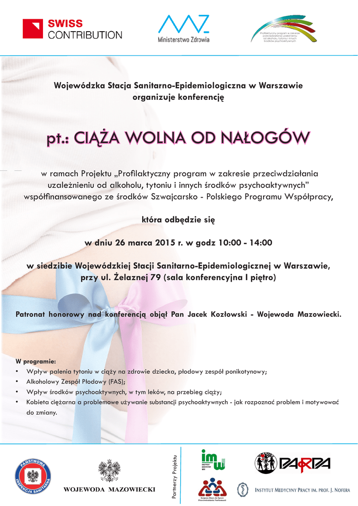 Profilaktyczny program w zakresie przeciwdziałania uzależnieniu od alkoholu, tytoniu i innych środków psychoaktywnych Wojewódzka Stacja Sanitarno-Epidemiologiczna w Warszawie organizuje konferencję pt.: CIĄŻA WOLNA OD NAŁOGÓW w ramach Projektu „Profilaktyczny program w zakresie przeciwdziałania uzależnieniu od alkoholu, tytoniu i innych środków psychoaktywnych” współfinansowanego ze środków Szwajcarsko - Polskiego Programu Współpracy, która odbędzie się w dniu 26 marca 2015 r. w godz 10:00 - 14:00 w siedzibie Wojewódzkiej Stacji Sanitarno-Epidemiologicznej w Warszawie, przy ul. Żelaznej 79 (sala konferencyjna I piętro) Patronat honorowy nad konferencją objął Pan Jacek Kozłowski - Wojewoda Mazowiecki. Partnerzy Projektu W programie: • Wpływ palenia tytoniu w ciąży na zdrowie dziecka, płodowy zespół ponikotynowy; • Alkoholowy Zespół Płodowy (FAS); • Wpływ środków psychoaktywnych, w tym leków, na przebieg ciąży; • Kobieta ciężarna a problemowe używanie substancji psychoaktywnych - jak rozpoznać problem i motywować do zmiany.