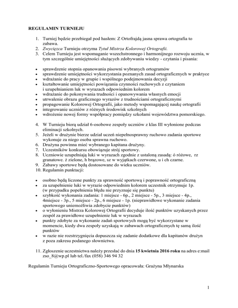 REGULAMIN TURNIEJU 1. Turniej będzie przebiegał pod hasłem: Z Ortofrajdą jasna sprawa ortografia to zabawa. 2. Zwycięzca Turnieju otrzyma Tytuł Mistrza Kolorowej Ortografii. 3. Celem Turnieju jest wspomaganie wszechstronnego i harmonijnego rozwoju ucznia, w tym szczególnie umiejętności służących zdobywaniu wiedzy - czytania i pisania: sprawdzenie stopnia opanowania pisowni wybranych ortogramów sprawdzenie umiejętności wykorzystania poznanych zasad ortograficznych w praktyce wdrażanie do pracy w grupie i wspólnego podejmowania decyzji kształtowanie umiejętności powiązania czynności ruchowych z czytaniem i uzupełnianiem luk w wyrazach odpowiednim kolorem wdrażanie do pokonywania trudności i opanowywania własnych emocji utrwalenie obrazu graficznego wyrazów z trudnościami ortograficznymi propagowanie Kolorowej Ortografii, jako metody wspomagającej naukę ortografii integrowanie uczniów z różnych środowisk szkolnych wdrożenie nowej formy współpracy pomiędzy szkołami województwa pomorskiego. 4. W Turnieju biorą udział 6-osobowe zespoły uczniów z klas III wyłonione podczas eliminacji szkolnych. 5. Jeżeli w drużynie bierze udział uczeń niepełnosprawny ruchowo zadania sportowe wykonuje za niego osoba sprawna ruchowo. 6. Drużyna powinna mieć wybranego kapitana drużyny. 7. Uczestników konkursu obowiązuje strój sportowy. 8. Uczniowie uzupełniają luki w wyrazach zgodnie z ustaloną zasadą: ó różowe, rz granatowe. ż zielone, h brązowe, sz w wyjątkach czerwone, u i ch czarne. 9. Zabawy sportowe będą dostosowane do wieku uczniów. 10. Regulamin punktacji: osobno będą liczone punkty za sprawność sportową i poprawność ortograficzną za uzupełnienie luki w wyrazie odpowiednim kolorem uczestnik otrzymuje 1p. (w przypadku popełnienia błędu nie przyznaje się punktu) szybkość wykonania zadania: 1 miejsce - 6p., 2 miejsce - 5p., 3 miejsce - 4p., 4miejsce - 3p., 5 miejsce - 2p., 6 miejsce - 1p. (nieprawidłowe wykonanie zadania sportowego uniemożliwia zdobycie punktów) o wyłonieniu Mistrza Kolorowej Ortografii decyduje ilość punktów uzyskanych przez zespół za prawidłowe uzupełnienie luk w wyrazach punkty zdobyte za wykonanie zadań sportowych mogą być wykorzystane w momencie, kiedy dwa zespoły uzyskają w zabawach ortograficznych tę samą ilość punktów w razie nie rozstrzygnięcia dopuszcza się zadanie dodatkowe dla kapitanów drużyn z poza zakresu podanego słownictwa. 11. Zgłoszenie uczestnictwa należy przesłać do dnia 15 kwietnia 2016 roku na adres e:mail [email protected] lub tel./fax (058) 346 94 32 Regulamin Turnieju Ortograficzno-Sportowego opracowała: Grażyna Młynarska 1