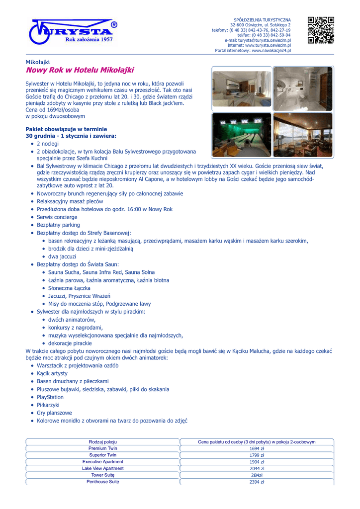 SPÓŁDZIELNIA TURYSTYCZNA 32-600 Oświęcim, ul. Solskiego 2 telefony: (0 48 33) 842-43-76, 842-27-19 tel/fax: (0 48 33) 842-59-94 e-mail: [email protected] Internet: www.turysta.oswiecim.pl Portal internetowy: www.nawakacje24.pl Nowy Rok w Hotelu Mikołajki Sylwester w Hotelu Mikołajki, to jedyna noc w roku, która pozwoli przenieść się magicznym wehikułem czasu w przeszłość. Tak oto nasi Goście trafią do Chicago z przełomu lat 20. i 30. gdzie światem rządzi pieniądz zdobyty w kasynie przy stole z ruletką lub Black jack'iem. Cena od 1694zł/osoba w pokoju dwuosobowym Pakiet obowiązuje w terminie 30 grudnia - 1 stycznia i zawiera: 2 noclegi 2 obiadokolacje, w tym kolacja Balu Sylwestrowego przygotowana specjalnie przez Szefa Kuchni Bal Sylwestrowy w klimacie Chicago z przełomu lat dwudziestych i trzydziestych XX wieku. Goście przeniosą siew świat, gdzie rzeczywistością rządzą zręczni krupierzy oraz unoszący się w powietrzu zapach cygar i wielkich pieniędzy. Nad wszystkim czuwać będzie nieposkromiony Al Capone, a w hotelowym lobby na Gości czekać będzie jego samochódzabytkowe auto wprost z lat 20. Noworoczny brunch regenerujący siły po całonocnej zabawie Relaksacyjny masaż pleców Przedłużona doba hotelowa do godz. 16:00 w Nowy Rok Serwis concierge Bezpłatny parking Bezpłatny dostęp do Strefy Basenowej: basen rekreacyjny z leżanką masującą, przeciwprądami, masażem karku wąskim i masażem karku szerokim, brodzik dla dzieci z mini-zjeżdżalnią dwa jaccuzi Bezpłatny dostęp do Świata Saun: Sauna Sucha, Sauna Infra Red, Sauna Solna Łaźnia parowa, Łaźnia aromatyczna, Łaźnia błotna Słoneczna Łączka Jacuzzi, Prysznice Wrażeń Misy do moczenia stóp, Podgrzewane ławy Sylwester dla najmłodszych w stylu pirackim: dwóch animatorów, konkursy z nagrodami, muzyka wyselekcjonowana specjalnie dla najmłodszych, dekoracje pirackie W trakcie całego pobytu noworocznego nasi najmłodsi goście będą mogli bawić się w Kąciku Malucha, gdzie na każdego czekać będzie moc atrakcji pod czujnym okiem dwóch animatorek: Warsztacik z projektowania ozdób Kącik artysty Basen dmuchany z piłeczkami Pluszowe bujawki, siedziska, zabawki, piłki do skakania PlayStation Piłkarzyki Gry planszowe Kolorowe monidło z otworami na twarz do pozowania do zdjęć Rodzaj pokoju Premium Twin Superior Twin Executive Apartment Lake View Apartment Tower Suitę Penthouse Suitę Cena pakietu od osoby (3 dni pobytu) w pokoju 2-osobowym 1694 zł 1799 zł 1904 zł 2044 zl 2i84zł 2394 zł Dopłata do dziecka o-3lat Dopłata do dziecka 4-i2lat Dopłata do dziecka >12 lub dostawka 207 zł 417 zł 707 zł Każda wcześniejsza i kolejna doba z obiadokolacją, bezpłatnym dostępem do Kącika Malucha, Świata Saun, Strefy Basenowej i zajęciami fitness (Nordic Walking z instruktorem, zajęcia ruchowe w wodzie) przygotowanymi specjalnie przez naszych terapeutów w cenie od: 446zł za osobę dorosłą 199zł dostawka dla dorosłego lub dziecka powyżej 12 roku życia 128zł/doba dla dziecka 4-12 56zł/doba dla dziecka 0-3 Przy rezerwacji pobytu obejmującego Pakiet Świąteczny i Pakiet Noworoczny oferujemy rabat w wysokości 10%. Dla naszych Gości oferujemy specjalne rabaty pobytowe: Rabat na zabiegi SPA-15% Rabat na zakup kosmetyków-5% Rabat na zakup posiłków w Restauracji a la carte New Island Pub -10% Rabat na zakup alkoholi i napojów - 5%