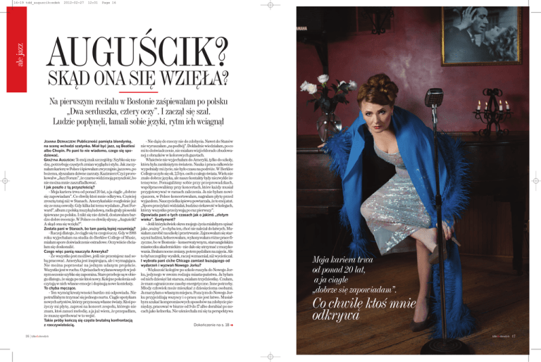 16-19 tdd_auguscik:edek 2012-02-27 12:01 Page 16 ale jazz AUGUŚCIK? SKĄD ONA SIĘ WZIĘŁA? Na pierwszym recitalu w Bostonie zaśpiewałam po polsku „Dwa serduszka, cztery oczy”. I zaczął się szał. Ludzie popłynęli, łamali sobie języki, rytm ich wciągnął JOANNA DERKACZEW: Publiczność pamięta blondynkę, na scenę wchodzi szatynka. Miał być jazz, są Beatlesi albo Chopin. Po pani to nie wiadomo, czego się spodziewać. GRAŻYNA AUGUŚCIK: Tomójznakszczególny.Szybkosięnu- dzę, potrzebuję częstych zmian wyglądu i stylu. Jak zaczynałamkarieręwPolsceiśpiewałamzwyczajnie,jazzowo,po bożemu, słyszałam dziwne zarzuty. Kazimierz Czyż prorokowałw„JazzForum”,żeczarnowidzimojąprzyszłość,bo nie można mnie zaszufladkować. I jak poszło z tą przyszłością? – Moja kariera trwa od ponad 20 lat, a ja ciągle „dobrze się zapowiadam”. Co chwilę ktoś mnie odkrywa. Częściej zresztą tutaj niż w Stanach. Amerykańskie rozgłośnie już się ze mną oswoiły. Gdy kilka lat temu wydałam „Past Forward”,albumzpolskąmuzykąludową,radiagrałypiosenki śpiewane po polsku. I nikt się nie dziwił, dostawałam bardzo dobre recenzje. W Polsce co chwilę słyszę: „Auguścik? A skąd ona się wzięła?”. Została pani w Stanach, bo tam panią lepiej rozumieją? – Raczej dlatego, że ciągle się tu czegoś uczę. Gdy w 1988 roku wyjechałam na studia do Berklee College of Music, miałam spore doświadczenie estradowe. Oczywiście chciałam się doskonalić. Czego więc panią nauczyła Ameryka? – Że wszystko jest możliwe, jeśli nie przestajesz nad sobą pracować. Ameryka jest inspirująca, ale i wymagająca. Nie można poprzestać na jednym udanym projekcie. Wszystkojestwruchu.Ogwiazdachwylansowanych wjednymsezonieszybkosięzapomina.Stareprzebojesąwobiegu dlatego, że sięga po nie ktoś nowy. Kolejne pokolenia odczytują w nich własne emocje i dopisują nowe konteksty. To chyba męczące. – Ten wymóg kreatywności bardzo mi odpowiada. Nie potrafiłabym trzymać się jednego nurtu. Ciągle spotykam nowych artystów, którzy przynoszą własne światy. Ktoś pożyczy mi płytę, zaprosi na koncert zespołu, którego nie znam, ktoś zanuci melodię, a ja już wiem, że przepadłam, że muszę spróbować w to wejść. Takie próby kończą się często brutalną konfrontacją z rzeczywistością. 16 tylkodladorosłych – Nie dążę do rzeczy nie do zdobycia. Nawet do Stanów nie wyruszałam „na podbój”. Dokładnie wiedziałam, po co mi to doświadczenie, nie miałam wizji eldorado zbudowanej z obrazków w kolorowych gazetach. Właściwie nie wyjechałam do Ameryki, tylko do szkoły, która była zamkniętym światem. Nauka i praca całkowicie wypełniały mi życie, nie było czasu na podróże. W Berklee Collegeuczyłosięok.2,5tys.osóbzcałegoświata.Wielunie znało dobrze języka, ale nasze kontakty były niezwykle intensywne. Pomagaliśmy sobie przy przeprowadzkach, współpracowaliśmy przy koncertach, które każdy musiał przygotowywać w ramach zaliczenia. Ja nie byłam nowicjuszem, w Polsce koncertowałam, nagrałam płytę przed wyjazdem.Nauczycielkaśpiewupowtarzała,żetomójatut. „Sporoprzeżyłaśiwidziałaś,budziszciekawośćwkolegach, którzy wszystko przeżywają po raz pierwszy”. Opowiada pani o tych czasach jak o jakimś „złotym wieku”. Sentyment? – Jeśli którykolwiek okres mojego życia miałabym opisać jako „ważny”, to chyba ten, choć nie należał do łatwych. Musiałamzarobićnaszkołęiprzetrwanie.Zajmowałamsięstarszymi ludźmi, kelnerowałam, wykonywałam różne prace fizyczne, bo w Bostonie – konserwatywnym, staroangielskim miasteczku akademickim – nie dało się utrzymać z muzykowania.Brałamnocnezmiany,potempędziłamnazajęcia.Ale to był szczególny wysiłek, raczej wzmacniał, niż wycieńczał. I wybrała pani ciche Chicago zamiast buzującego od wydarzeń i wyzwań Nowego Jorku? – Większość kolegów po szkole ruszyła do Nowego Jorku, jedynego w swoim rodzaju miasta-państwa. Ja byłam od nich dziesięć lat starsza, miałam trzydziestkę. Czułam, że mam ograniczone zasoby energetyczne. Inne potrzeby. Młody człowiek może mieszkać z dziesięcioma osobami. Ja marzyłam o własnym miejscu. Poza tym do Nowego Jorku przyjeżdżają wszyscy i o pracę nie jest łatwo. Musiałbym szukać kompromisowych sposobów na zdobycie pieniędzy, pracować w biurze od 9 do 17 albo dorabiać po nocach jako kelnerka. Nie uśmiechała mi się ta perspektywa Moja kariera trwa od ponad 20 lat, a ja ciągle „dobrze się zapowiadam”. Co chwilę ktoś mnie odkrywa Dokończenie na s. 18 tylkodladorosłych 17 16-19 tdd_auguscik:edek 2012-02-27 12:01 Page 18 ale jazz ale jazz Dokończenie ze s. 16 – kolejne lata w stanie przejściowym. Nie chciałam dłużej odraczać prawdziwego startu. Wyjechałam do Stanów, by śpiewać. W Chicago łatwiej zacząć? – Pojechałam tam po pierwszym roku zarabiać na kolejny semestr. Pierwszewrażenie – fatalne.Po 24 godzinach w pociąguwjeżdżałam do miasta od strony południowej. Mijałam fabryki, stalownie, całą tę industrialną ohydę. W porównaniu z zadbanym Bostonem – brzydko, brudno i pusto. Bary w śródmieściu zamykano o 17, gdy ludzie kończyli pracę. Ale Chicago miało zalety: życie było tańsze, a konkurencja nie tak potężna i bezwzględna. Spędziłam tam lato. Poznałam środowisko jazzowe, zagrałam koncerty. Gdy kończyłam studia, miałam do czego wracać. Zaczęłam współpracę z Green Mill – najlepszym klubem jazzowym na świecie. Dziś miasto wypiękniało, jest dynamiczne i artystyczne. Od początku czerwca do końca września są koncerty i festiwale. Prawie wszystkiedarmowe.Ludziespędzajączaspozadomem –wparkach, na trawie, w centrum miasta. Słuchają muzyki i piknikują. Jest dla kogo grać. Chicago pozwala mi robić to, co najbardziej kocham. Mam swoją publiczność i prasa mnie lubi. Za co? –