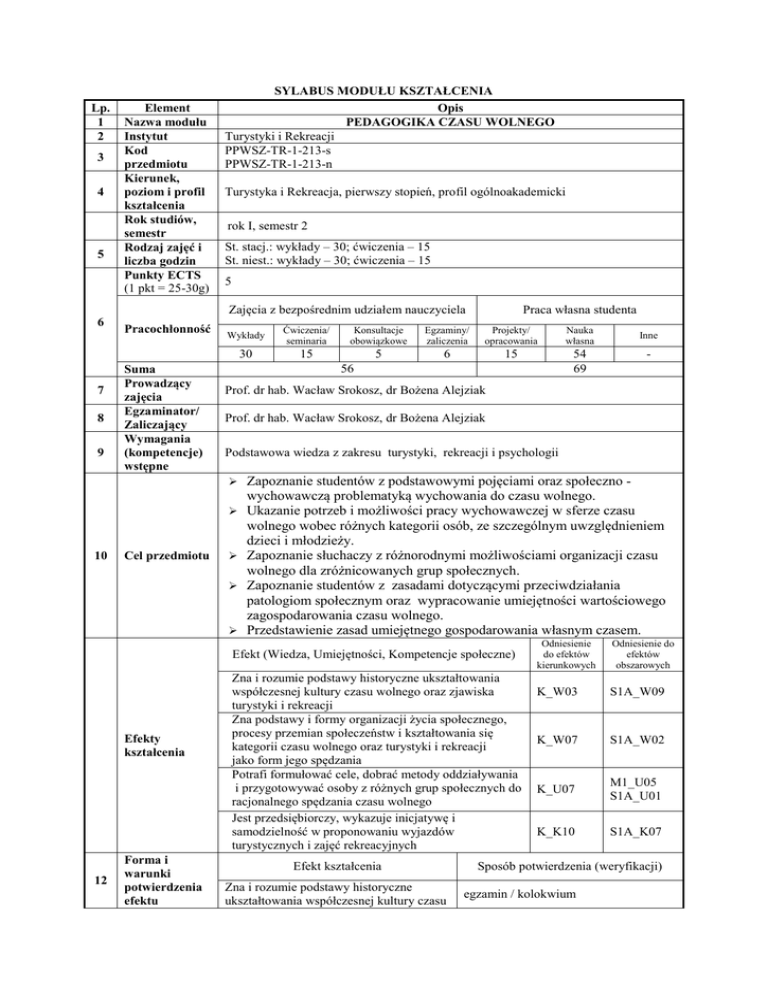 Lp. 1 2 3 4 5 Element Nazwa modułu Instytut Kod przedmiotu Kierunek, poziom i profil kształcenia Rok studiów, semestr Rodzaj zajęć i liczba godzin Punkty ECTS (1 pkt = 25-30g) SYLABUS MODUŁU KSZTAŁCENIA Opis PEDAGOGIKA CZASU WOLNEGO Turystyki i Rekreacji PPWSZ-TR-1-213-s PPWSZ-TR-1-213-n Turystyka i Rekreacja, pierwszy stopień, profil ogólnoakademicki rok I, semestr 2 St. stacj.: wykłady – 30; ćwiczenia – 15 St. niest.: wykłady – 30; ćwiczenia – 15 5 Zajęcia z bezpośrednim udziałem nauczyciela 6 7 8 9 Pracochłonność Suma Prowadzący zajęcia Egzaminator/ Zaliczający Wymagania (kompetencje) wstępne Wykłady Ćwiczenia/ seminaria 30 15 Egzaminy/ zaliczenia Projekty/ opracowania Nauka własna 5 6 15 54 69 Podstawowa wiedza z zakresu turystyki, rekreacji i psychologii Zapoznanie studentów z podstawowymi pojęciami oraz społeczno wychowawczą problematyką wychowania do czasu wolnego. Ukazanie potrzeb i możliwości pracy wychowawczej w sferze czasu wolnego wobec różnych kategorii osób, ze szczególnym uwzględnieniem dzieci i młodzieży. Zapoznanie słuchaczy z różnorodnymi możliwościami organizacji czasu wolnego dla zróżnicowanych grup społecznych. Zapoznanie studentów z zasadami dotyczącymi przeciwdziałania patologiom społecznym oraz wypracowanie umiejętności wartościowego zagospodarowania czasu wolnego. Przedstawienie zasad umiejętnego gospodarowania własnym czasem. Efekt (Wiedza, Umiejętności, Kompetencje społeczne) 12 Forma i warunki potwierdzenia efektu - Prof. dr hab. Wacław Srokosz, dr Bożena Alejziak Efekty kształcenia Inne Prof. dr hab. Wacław Srokosz, dr Bożena Alejziak Cel przedmiotu Konsultacje obowiązkowe 56 10 Praca własna studenta Zna i rozumie podstawy historyczne ukształtowania współczesnej kultury czasu wolnego oraz zjawiska turystyki i rekreacji Zna podstawy i formy organizacji życia społecznego, procesy przemian społeczeństw i kształtowania się kategorii czasu wolnego oraz turystyki i rekreacji jako form jego spędzania Potrafi formułować cele, dobrać metody oddziaływania i przygotowywać osoby z różnych grup społecznych do racjonalnego spędzania czasu wolnego Jest przedsiębiorczy, wykazuje inicjatywę i samodzielność w proponowaniu wyjazdów turystycznych i zajęć rekreacyjnych Efekt kształcenia Zna i rozumie podstawy historyczne ukształtowania współczesnej kultury czasu Odniesienie do efektów kierunkowych Odniesienie do efektów obszarowych K_W03 S1A_W09 K_W07 S1A_W02 K_U07 M1_U05 S1A_U01 K_K10 S1A_K07 Sposób potwierdzenia (weryfikacji) egzamin / kolokwium 2 kształcenia wolnego oraz zjawiska turystyki i rekreacji Zna podstawy i formy organizacji życia społecznego, procesy przemian społeczeństw i kształtowania się kategorii czasu wolnego oraz turystyki i rekreacji jako form jego spędzania Potrafi formułować cele, dobrać metody oddziaływania i przygotowywać osoby z różnych grup społecznych do racjonalnego spędzania czasu wolnego Jest przedsiębiorczy, wykazuje inicjatywę i samodzielność w proponowaniu wyjazdów turystycznych i zajęć rekreacyjnych 13 Treści merytoryczne przedmiotu 14 Wykaz literatury podstawowej 15 Wykaz literatury uzupełniającej (pomocniczej) egzamin / kolokwium Projekt + prezentacja projektu Projekt, praca w grupie, dyskusja grupowa Definicje, istota, cele, funkcje czasu wolnego. Zarys historii problematyki czasu wolnego. Koncepcje czasu wolnego. Umiejscowienie pedagogiki czasu wolnego wśród nauk pedagogicznych. Pedagogika czasu wolnego i jej metody badawcze. Istota i zadania wychowania do czasu wolnego. Naczelne cele wychowania oraz wychowanie do czasu wolnego. Środowiskowe uwarunkowania kształtowania wzorców zachowań wolnoczasowych dzieci i młodzieży. Wychowanie do czasu wolnego jako forma kształtowania osobowości. Poznawcza koncepcja osobowości. Koncepcja samowychowania. Wychowawcze aspekty turystyki. Wychowanie i samowychowanie przez turystykę i do turystyki). Budżet czasu: definicja oraz główne składniki. Wychowanie do czasu wolnego a wychowanie zdrowotne i wychowanie fizyczne. Współczesne formy spędzania czasu wolnego: turystyka, sport, środki masowego przekazu. Znaczenie wychowawcze, zdrowotne i kulturotwórcze zabawy. Korzystanie z instytucji kulturalnych jako współczesnej formy pożytecznego zagospodarowania wolnego czasu (filharmonia, teatr, wystawa, muzeum, itp.). Placówki oświatowo-wychowawcze wychowania pozaszkolnego. Przejawy niewłaściwego spędzania czasu wolnego (przemoc, agresja, subkultury, sekty, blokowiska, samotność w sieci. Negatywne konsekwencje uzależnień od technologii informacyjnych (telewizja, komputery i gry komputerowe, Internet. Zagrożenia cyberprzestrzeni – zagrożenia zdrowotne, psychiczne, moralne, społeczne itd. 1. Alejziak B., Samowychowanie a turystyka, Albis, Kraków, 2008. 2. Czerepaniak Walczak M., Wychowanie do czasu wolnego, [w:] Dudzikowa M., Wychowanie. Pojęcia. Procesy. Konteksty, t.2. GWP, Gdańsk, 2007. 3. Pięta J., Pedagogika czasu wolnego, Almamer, Warszawa, 2008. 1. Jędrzejko M., Patologie społeczne, Wyższa Szkoła Humanistyczna, 2006. 2. Kwilecka M., Brożek Z., Bezpośrednie funkcje rekreacji, Almamer, Warszawa, 2007. 3. Muszyński W., Jakość życia i czas wolny we współczesnym społeczeństwie, Wyd. Adam Marszałek, Toruń, 2008.
