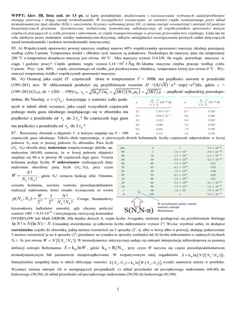 WPPT; kier. IB, lista zad. nr 13 pt. (z karty przedmiotu): Analizowanie i rozwiazywanie wybranych zadań/problemów stosując pierwszą i drugą zasadę termodynamiki. W szczególności wyznaczanie: a) wartości ciepła wymienionego przez układ termodynamiczny (gaz idealny (GI)) z otoczeniem, b) pracy wykonanej przez GI, c) zmian energii wewnętrznej i entropii GI podczas kwazistatycznych przemian (izochoryczna, izobaryczna, izotermiczna, adiabatyczna), d) współczynników sprawności maszyn cieplnych pracujących w cyklu prostym i odwrotnym, e) ciepła transportowanego w procesie przewodnictwa cieplnego. Lista ma na celu zdobycie przez studentów wiedzy matematyczno-fizycznej, nabycie umiejętności rozwiązywania prostych zadań dotyczących zasad termodynamiki i podstaw termodynamiki statystycznej. 85. A) Współczynnik sprawności pewnej maszyny cieplnej stanowi 60% współczynnika sprawności maszyny idealnej pracującej według cyklu Carnota. Temperatura źródeł i chłodnic tych maszyn są jednakowe. Dochodząca do maszyny para ma temperaturę 200 oC a temperatura skraplacza maszyny jest równa 60 oC . Moc maszyny wynosi 314 kW. Ile węgla potrzebuje maszyna w ciągu 1 godziny pracy? Ciepło spalania węgla wynosi 3,14 =107 J kg. B) Idealna maszyna cieplna pracuje według cyklu Carnota. Przy tym 80% ciepła, otrzymanego od źródła, jest przekazywana chłodnicy, temperatura której jest równa 0 oC . Wyznaczyć temperaturę źródła i współczynnik sprawności maszyny. 86. A) Oszacuj jaka część Π cząsteczek tlenu w temperaturze T = 300K ma prędkości zawarte w przedziale (199÷201) m/s. W obliczeniach posłużyć się przybliżonym wzorem Π =(4⁄√ ) ∙ ∙ exp(− )dz, gdzie z = (199+201)/(2vp), dz = (201 – 199)/vp, vp = 2k BT m0 = 2RT ( N Am0 ) = 2RT µ – prędkość najbardziej prawdopodobna. B) Niechaj x = v vp ; korzystając z wartości całki podanych w tabeli obok wyznacz, jaka część wszystkich cząsteczek jednego mola gazu idealnego znajdującego się w zbiorniku ma prędkości z przedziału od vp do 2 vp ? Ile cząsteczek tego gazu ma prędkości z przedziału od vp do 2 vp ? 87. Rozważmy zbiornik o objętości V, w którym znajduje się N = 100 cząsteczek gazu idealnego. Tabela obok reprezentuje, w pierwszych dwóch kolumnach, liczby cząsteczek odpowiednio w lewej połowie NL oraz w prawej połowie NP zbiornika. Para liczb (NL; NP) określa dany makrostan rozpatrywanego układu, np. makrostan (60;40) oznacza, że w lewej połowie objętości znajduje się 60 a w prawej 40 cząsteczek tego gazu. Trzecia kolumna podaje liczby W mikrostanów realizujących dany makrostan określony parą liczb (NL; NP), przy czym W= N! , gdzie NL! oznacza funkcję silni. Ostatnia, NL ! NP ! czwarta kolumna, zawiera wartości prawdopodobieństw realizacji makrostanu, które zostało wyznaczone ze wzoru p( N L ; N P ) = W 1 N! = N⋅ . Uwaga: Standardowy N 2 2 NL !NP ! W tej kolumnie należy wpisać wartości entropii kieszonkowy kalkulator zawodzi, gdy chcemy policzyć Boltzmanna 157 wartość 100! = 9,33⋅10 i otrzymujemy zazwyczaj komunikat OVERFLOW lub Math ERROR. Dla bardzo dużych N, rzędu liczby Avogadra, możemy posługiwać się przybliżeniem Stirlinga ln N ! ≈ N (ln N ) − N . Uzasadnij stwierdzenia: a) całkowita liczba mikrostanów wynosi 2N; Ws-ka: wyobraź sobie, że dodajesz rozróżnialne cząstki do zbiornika, jedną możesz rozmieścić na 2 sposoby (21, tj. albo w lewej albo w prawej), dodając jednocześnie 2 możesz rozmieścić je na 4 sposoby (22; przedstaw na rysunku te sposoby rozkładu) itd; b) liczba mikrostanów o zadanych liczbach NL i NP jest równa W = N ! ( N L ! N P !) . W termodynamice statystycznej nadaje się entropii interpretację mikroskopową za pomocą definicji entropii Boltzmanna S = k B ln W , gdzie k B = R N A , przy czym W nazywa się często prawdopodobieństwem termodynamicznym lub parametrem nieuporządkowania. W rozpatrywanym tutaj zagadnieniu S = k B ln ( N ! ( N L ! N P !) ) . Samodzielnie uzupełnij dane w tabeli obliczając wartości S ( N L ; N P ) = k B ln W ( N L ; N P ) , wyniki zamieścić należy w portfolio. Wyznacz zmianę entropii ∆S w następujących przypadkach: c) układ przechodzi od początkowego makrostanu (60;40) do końcowego (50;50); d) układ przechodzi od początkowego makrostanu (50;50) do końcowego (0;100). 1 88. Energia mechaniczna cząsteczki gazu o masie m wchodzącego w skład powietrza na powierzchni Ziemi wynosi . = −G + = − !"# + , gdzie RZ – promień Ziemi. Uzasadnij ten wzór. Wyznacz temperaturę po- wietrza, przy której cząsteczkowy wodór, azot, tlen mogą uciec z pola grawitacyjnego Ziemi. Ws-ka: Przyjąć za v2 prędkość średnią kwadratową. Jakie konsekwencje mają otrzymane wyniki dla składu atmosfery ziemskiej. Czy z upływem wieków skład atmosfer ziemskiej będzie zmieniał się? Jeśli tak, to w jaki sposób? 89. Silnik Stirlinga jest nieco podobny do silnika Otto (benzynowego) chociaż kompresja i rozprężanie zachodzi izotermicznie a nie adiabatycznie. Jest to silnik zewnętrznego spalania, ponieważ w jego wnętrzu nie zachodzi spalanie się mieszanki paliwowej. Do działania silnika wystarcza różnica stworzenie różnicy temperatur między substancją roboczą i otoczeniem. Może to być wywołane przez światło słoneczne, wody geotermalne, różnica temperatur między wodą mórz/oceanów, ogrzewanie silnika płomieniem ze źródła. Ciepło jest pobierane z zewnątrz ze spalanego poza silnikiem paliwa. Dlatego jest to bardzo cichy silnik, w porównaniu z silnikiem Otto ponieważ nie jest spalana mieszanka wybuchowa. Jednak nie znalazł na razie powszechnego zastosowania w samochodach ze względu na rozmiary, masę i mniejszą sprawność niż silnik Otto i Diesla. Zamknięty cykl składa się z 4 przemian: a→b – przemiana izotermiczna w temperaturze T1, której stopień kompresji wynosi r; b→c – przemiana izochoryczna, w której te