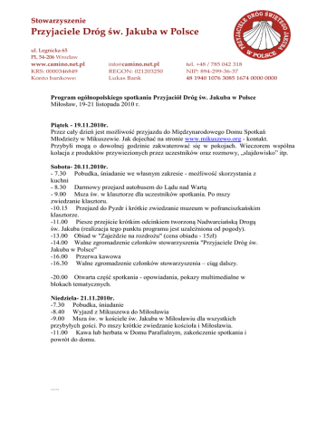 Stowarzyszenie Przyjaciele Dróg św. Jakuba w Polsce ul. Legnicka 65 PL 54-206 Wrocław www.camino.net.pl KRS: 0000346849 Konto bankowe: [email protected] REGON: 021203250 Lukas Bank tel. +48 / 785 042 318 NIP: 894-299-36-37 48 1940 1076 3085 1674 0000 0000 Program ogólnopolskiego spotkania Przyjaciół Dróg św. Jakuba w Polsce Miłosław, 19-21 listopada 2010 r. Piątek - 19.11.2010r. Przez cały dzień jest możliwość przyjazdu do Międzynarodowego Domu Spotkań Młodzieży w Mikuszewie. Jak dojechać na stronie www.mikuszewo.org - kontakt. Przybyli mogą o dowolnej godzinie zakwaterować się w pokojach. Wieczorem wspólna kolacja z produktów przywiezionych przez uczestników oraz rozmowy, „slajdowisko” itp. Sobota- 20.11.2010r. - 7.30 Pobudka, śniadanie we własnym zakresie - możliwość skorzystania z kuchni - 8.30 Darmowy przejazd autobusem do Lądu nad Wartą - 9.00 Msza św. w klasztorze dla uczestników spotkania. Po mszy zwiedzanie klasztoru. -10.15 Przejazd do Pyzdr i krótkie zwiedzanie muzeum w pofranciszkańskim klasztorze. -11.00 Piesze przejście krótkim odcinkiem tworzoną Nadwarciańską Drogą św. Jakuba (realizacja tego punktu programu jest uzależniona od pogody). -13.00 Obiad w "Zajeździe na rozdrożu" (cena obiadu - 15zł) -14.00 Walne zgromadzenie członków stowarzyszenia "Przyjaciele Dróg św. Jakuba w Polsce" -16.00 Przerwa kawowa -16.30 Walne zgromadzenie członków stowarzyszenia – ciąg dalszy. -20.00 Otwarta część spotkania - opowiadania, pokazy multimedialne w blokach tematycznych. Niedziela- 21.11.2010r. -7.30 Pobudka, śniadanie -8.40 Wyjazd z Mikuszewa do Miłosławia -9.00 Msza św. w kościele św. Jakuba w Miłosławiu dla wszystkich przybyłych gości. Po mszy krótkie zwiedzanie kościoła i Miłosławia. -11.00 Kawa lub herbata w Domu Parafialnym, zakończenie spotkania i powrót do domu. …. Stowarzyszenie Przyjaciele Dróg św. Jakuba w Polsce ul. Legnicka 65 PL 54-206 Wrocław www.camino.net.pl KRS: 0000346849 Konto bankowe: [email protected] REGON: 021203250 Lukas Bank tel. +48 / 785 042 318 NIP: 894-299-36-37 48 1940 1076 3085 1674 0000 0000 Koszty: Zapłata gotówką w momencie przyjazdu: Noclegi – cena za 1 dobę 30zł, za 2 doby 50zł Wyżywienie we własnym zakresie – cena za 1 obiad 15zł Dojazd: Samochodem można dojechać trasą A2 , skręcając z kierunku Wrześni i z Miłosławia w kierunku Pyzdr ... Pociągiem – najbliższe stacje kolejowe to Środa Wlkp. i Września /20km od Mikuszewa/ oraz Miłosław /6km od Mikuszewa/. Autobusem – z Poznania bezpośredni PKS w kierunku Pyzdr, Turku i Zagórowa Poznań – Mikuszewo godz. 11.10, 13.00, 16.05, 18.30; Września – Mikuszewo godz. 10.23, 10.45, 13.20, 14.30, 15.30, 18.00, 20.00 kursują w dni robocze; w sobotę tylko o godz. 10.45, 14.30; Środa – Mikuszewo 7.30, 12.15, 13.55 –kursują w dni robocze; 12.15 także w sobotę Zgłoszenia: Do dnia 31 października br. pocztą elektroniczną na adres: [email protected]