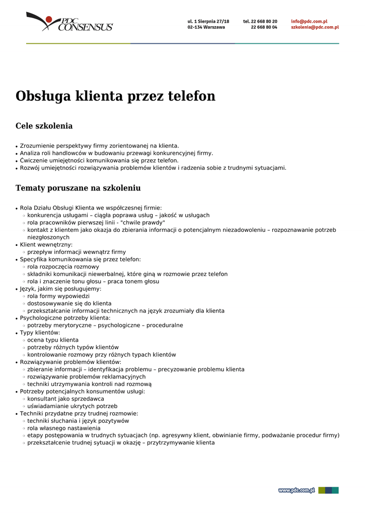 Obsługa klienta przez telefon Cele szkolenia ● ● ● ● Zrozumienie perspektywy firmy zorientowanej na klienta. Analiza roli handlowców w budowaniu przewagi konkurencyjnej firmy. Ćwiczenie umiejętności komunikowania się przez telefon. Rozwój umiejętności rozwiązywania problemów klientów i radzenia sobie z trudnymi sytuacjami. Tematy poruszane na szkoleniu ● Rola Działu Obsługi Klienta we współczesnej firmie: konkurencja usługami – ciągła poprawa usług – jakość w usługach rola pracowników pierwszej linii - "chwile prawdy" kontakt z klientem jako okazja do zbierania informacji o potencjalnym niezadowoleniu – rozpoznawanie potrzeb niezgłoszonych Klient wewnętrzny: przepływ informacji wewnątrz firmy Specyfika komunikowania się przez telefon: rola rozpoczęcia rozmowy składniki komunikacji niewerbalnej, które giną w rozmowie przez telefon rola i znaczenie tonu głosu – praca tonem głosu Język, jakim się posługujemy: rola formy wypowiedzi dostosowywanie się do klienta przekształcanie informacji technicznych na język zrozumiały dla klienta Psychologiczne potrzeby klienta: potrzeby merytoryczne – psychologiczne – proceduralne Typy klientów: ocena typu klienta potrzeby różnych typów klientów kontrolowanie rozmowy przy różnych typach klientów Rozwiązywanie problemów klientów: zbieranie informacji – identyfikacja problemu – precyzowanie problemu klienta rozwiązywanie problemów reklamacyjnych techniki utrzymywania kontroli nad rozmową Potrzeby potencjalnych konsumentów usługi: konsultant jako sprzedawca uświadamianie ukrytych potrzeb Techniki przydatne przy trudnej rozmowie: techniki słuchania i język pozytywów rola własnego nastawienia etapy postępowania w trudnych sytuacjach (np. agresywny klient, obwinianie firmy, podważanie procedur firmy) przekształcenie trudnej sytuacji w okazję – przytrzymywanie klienta ❍ ❍ ❍ ● ❍ ● ❍ ❍ ❍ ● ❍ ❍ ❍ ● ❍ ● ❍ ❍ ❍ ● ❍ ❍ ❍ ● ❍ ❍ ● ❍ ❍ ❍ ❍