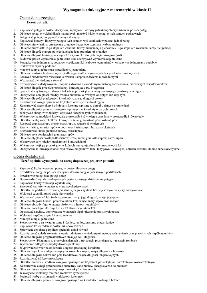 Wymagania edukacyjne z matematyki w klasie II Ocena dopuszczająca Uczeń potrafi: Zapisywać potęgi w postaci iloczynów, zapisywać iloczyny jednakowych czynników w postaci potęg Obliczać potęgi o wykładnikach naturalnych, mnożyć i dzielić potęgi o tych samych podstawach Potęgować potęgi, potęgować ilorazy i iloczyny Zapisywać ilorazy i iloczyny potęg o tych samych wykładnikach w postaci jednej potęgi Obliczać pierwiastki arytmetyczne drugiego i trzeciego stopnia z liczb naturalnych Obliczać pierwiastki 2-go stopnia z kwadratu liczby nieujemnej i pierwiastek 3-go stopnia z sześcianu liczby nieujemnej Obliczać długość okręgu, pole koła, znając jego promień lub średnicę Obliczać długość łuków, (pola wycinków) jako określonych części okręgów (kół) Budować proste wyrażenia algebraiczne oraz odczytywać wyrażenia algebraiczne Porządkować jednomiany, podawać współczynniki liczbowe jednomianów, wskazywać jednomiany podobne Redukować wyrazy podobne Mnożyć sumy algebraiczne przez liczby, jednomiany Obliczać wartości liczbowe wyrażeń dla argumentów wymiernych bez przekształcenia wyrażeń Podawać przykładowe rozwiązania równań I stopnia z dwiema niewiadomymi Wyznaczać niewiadome z równań Rozwiązywać układy równań I stopnia z dwiema niewiadomymi metodą podstawiania, przeciwnych współczynników Obliczać długość przeciwprostokątnej, korzystając z tw. Pitagorasa Sprawdzać czy trójkąty o danych bokach są prostokątne, wskazywać trójkąty prostokątne w figurze Odczytywać odległości między dwoma punktami o równych odciętych lub rzędnych Obliczać długości przekątnych kwadratów, znając długości boków Konstruować okręgi opisane na trójkątach oraz styczne do okręgów Konstruować sześciokąty i ośmiokąty foremne wpisane w okręgi o danych promieniach Obliczać długości promieni okręgów wpisanych w kwadraty o danych bokach Wpisywać okręgi w wielokąty i opisywać okręgi na tych wielokątach Wskazywać na modelach krawędzie prostopadłe i równoległe oraz ściany prostopadłe i równoległe Określać liczbę wierzchołków, krawędzi i ścian graniastosłupów, ostrosłupów Rysować graniastosłupy proste, ostrosłupy w rzutach równoległych Kreślić siatki graniastosłupów o podstawach trójkątnych lub czworokątnych Rozpoznawać siatki graniastosłupów, ostrosłupów Obliczać pola powierzchni graniastosłupów Obliczać objętości prostopadłościanów, sześcianów, graniastosłupów, ostrosłupów Wskazywać kąty między przekątnymi i krawędziami Wskazywać trójkąty prostokątne, w których występują dane lub szukane odcinki 34. Odczytywać informacje z tabel, wykresów, diagramów, tabel łodygowo-listkowych, obliczać średnie, zbierać dane statystyczne 1. 2. 3. 4. 5. 6. 7. 8. 9. 10. 11. 12. 13. 14. 15. 16. 17. 18. 19. 20. 21. 22. 23. 24. 25. 26. 27. 28. 29. 30. 31. 32. 33. Ocena dostateczna Uczeń spełnia wymagania na ocenę dopuszczającą oraz potrafi: 1. 2. 3. 4. 5. 6. 7. 8. 9. 10. 11. 12. 13. 14. 15. 16. 17. 18. 19. 20. 21. 22. 23. 24. 25. 26. 27. 28. 29. 30. 31. 32. Zapisywać liczby w postaci potęg, w postaci iloczynu potęg Przedstawić potęgi w postaci iloczynu i ilorazu potęg o tych samych podstawach Przedstawić potęgi jako potęgi potęg Doprowadzać wyrażenia do prostych postaci, stosując działania na potęgach Zapisywać liczby w notacji wykładniczej Szacować wartości wyrażeń zawierających pierwiastki Określać na podstawie rozwinięcia dziesiętnego, czy dana liczba jest wymierna, czy niewymierna Wyłączać czynniki przed znak pierwiastka Wyznaczać promień lub średnicę okręgu, znając jego długość, znając jego pole Obliczać długości łuków i pola wycinków kół, znając miary kątów środkowych Obliczać obwody figur o brzegu złożonym z łuków i odcinków Obliczać pola figur złożonych z wielokątów i wycinków kół Opuszczać nawiasy, doprowadzać wyrażenia algebraiczne do prostszych postaci Wyłączać wspólne czynniki przed nawias Mnożyć sumy algebraiczne Stosować wzory na kwadrat sumy i różnicy, na iloczyn sumy przez różnicę Zapisywać treści zadań w postaci układów równań Sprawdzać czy dane pary liczb spełniają układ równań Rozwiązywać układy równań I stopnia z dwiema niewiadomymi metodą podstawiania oraz przeciwnych współczynników Obliczać długości przyprostokątnych stosując tw. Pitagorasa Stosować tw. Pitagorasa w prostych zadaniach o trójkątach, prostokątach, trapezach, rombach Wyznaczać odległości między dwoma punktami Wyprowadzać wzór na obliczanie długości przekątnej kwadratu Obliczać wysokości lub pola trójkątów równobocznych, znając długości ich boków Obliczać długości boków lub pola kwadratów, znając długości ich przekątnych Rozwiązywać trójkąty prostokątne Określać położenie środków okręgów opisanych na trójkątach prostokątnym, ostrokątnym, rozwartokątnym Konstruować okręgi przechodzące przez trzy dane punkty, okręgi styczne do prostych Obliczać miary kątów wewnętrznych wielokątów foremnych Wskazywać wielokąty foremne środkowo symetryczne Podawać liczbę osi symetrii wielokątów foremnych Obliczać długości promieni okręgów opisanych na kwadratach o danych bokach 33. Obliczać długości promieni, pola lub obwody kół opisanych na trójkątach równobocznych i wpisanych w trójkąty równoboczne o danych bokach 34. Wskazywać na rysunkach krawędzie prostopadłe i równoległe oraz ściany prostopadłe i równoległe 35. Obliczać sumy długości krawędzi graniastosłupów i ostrosłupów 36. Kreślić siatki graniastosłupów, ostrosłupów o podstawach będących dowolnymi wielokątami 37. Zamieniać jednostki objętości 38. Wskazywać kąty między przekątnymi a podstawami, między odcinkami a podstawą 39. Obliczać pola powierzchni ostrosłupów 40. Stosować tw. Pitagorasa do wyzna