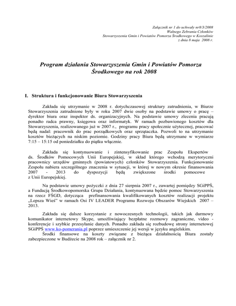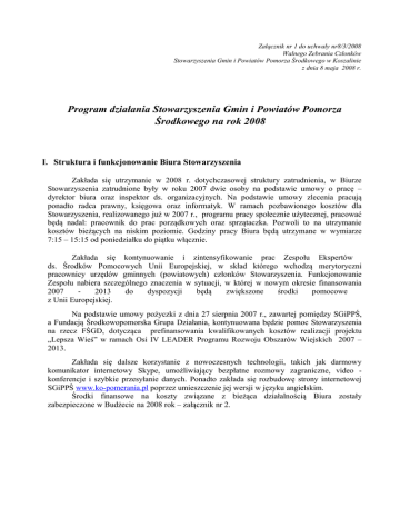 Załącznik nr 1 do uchwały nr8/3/2008 Walnego Zebrania Członków Stowarzyszenia Gmin i Powiatów Pomorza Środkowego w Koszalinie z dnia 8 maja 2008 r. Program działania Stowarzyszenia Gmin i Powiatów Pomorza Środkowego na rok 2008 I. Struktura i funkcjonowanie Biura Stowarzyszenia Zakłada się utrzymanie w 2008 r. dotychczasowej struktury zatrudnienia, w Biurze Stowarzyszenia zatrudnione były w roku 2007 dwie osoby na podstawie umowy o pracę – dyrektor biura oraz inspektor ds. organizacyjnych. Na podstawie umowy zlecenia pracują ponadto radca prawny, księgowa oraz informatyk. W ramach pozbawionego kosztów dla Stowarzyszenia, realizowanego już w 2007 r., programu pracy społecznie użytecznej, pracować będą nadal: pracownik do prac porządkowych oraz sprzątaczka. Pozwoli to na utrzymanie kosztów bieżących na niskim poziomie. Godziny pracy Biura będą utrzymane w wymiarze 7:15 – 15:15 od poniedziałku do piątku włącznie. Zakłada się kontynuowanie i zintensyfikowanie prac Zespołu Ekspertów ds. Środków Pomocowych Unii Europejskiej, w skład którego wchodzą merytoryczni pracownicy urzędów gminnych (powiatowych) członków Stowarzyszenia. Funkcjonowanie Zespołu nabiera szczególnego znaczenia w sytuacji, w której w nowym okresie finansowania 2007 2013 do dyspozycji będą zwiększone środki pomocowe z Unii Europejskiej. Na podstawie umowy pożyczki z dnia 27 sierpnia 2007 r., zawartej pomiędzy SGiPPŚ, a Fundacją Środkowopomorska Grupa Działania, kontynuowana będzie pomoc Stowarzyszenia na rzecz FŚGD, dotycząca prefinansowania kwalifikowanych kosztów realizacji projektu „Lepsza Wieś” w ramach Osi IV LEADER Programu Rozwoju Obszarów Wiejskich 2007 – 2013. Zakłada się dalsze korzystanie z nowoczesnych technologii, takich jak darmowy komunikator internetowy Skype, umożliwiający bezpłatne rozmowy zagraniczne, video konferencje i szybkie przesyłanie danych. Ponadto zakłada się rozbudowę strony internetowej SGiPPŚ www.ko-pomerania.pl poprzez umieszczenie jej wersji w języku angielskim. Środki finansowe na koszty związane z bieżąca działalnością Biura zostały zabezpieczone w Budżecie na 2008 rok – załącznik nr 2. Planowane działania: 1. Na podstawie uchwały WZC 8/2/2008 przygotowanie i złożenie wniosku, dotyczącego utworzenia transgranicznego, tematycznego szlaku rowerowego, łączącego Południową Skanię (Szwecja), Bornholm (Dania) oraz Pomorze Środkowe. Projekt przewiduje po polskiej stronie m.in. wykonanie studiów wykonalności tras rowerowych oraz realizację tzw. małej architektury (miejsca postojowe, rodzinne miejsca rekreacji ruchowej) we wszystkich gminach członkowskich. Źródło finansowania: Program Południowy Bałtyk, Priorytet 2 – Atrakcyjność i wspólna tożsamość, Działanie 2.3 – Zrównoważone użycie przyrodniczego oraz kulturowego dziedzictwa dla rozwoju regionalnego; 2. Planuje się wykorzystanie dokumentacji złożonego wniosku "Utworzenie integracyjnych ogólnodostępnych stref rekreacji dziecięcej" do Norweskiego Mechanizmu Finansowego – Priorytet 2.5 „Opieka zdrowotna i opieka nad dzieckiem”, który nie został rekomendowany do dofinansowania, na przygotowanie nowego wniosku dotyczącego budowy placów zabaw lub/i boisk sportowych w zainteresowanych gminach członkowskich z wykorzystaniem innych źródeł finansowania, takich, jak: Program Rozwoju Obszarów Wiejskich (Odnowa i rozwój wsi) – orientacyjny termin naboru – czerwiec 2008 r. (max. kwota na 1 miejscowość w całym okresie programowania – 500 000 PLN, max. poziom dofinansowania – 75%) lub Regionalny Program Operacyjny Województwa Zachodniopomorskiego na lata 2007 - 2013, Oś Priorytetowa 5. Turystyka, Kultura i Rewitalizacja, Działanie 5.1.1 – Infrastruktura turystyczna, poddziałanie 5.1.1. Infrastruktura turystyki, (nie przewiduje się minimalnych/ maksymalnych wartości projektu, max. poziom dofinansowania – 50%), orientacyjny termin ogłoszenia konkursu – maj 2008 r., 3. Na podstawie uchwały WZC 22/5/2007, we współpracy ze Związkiem Miast i Gmin Dorzecza Parsęty w Karlinie oraz Stowarzyszeniem Gmin Polskich Euroregionu Pomerania, planuje się utworzenie przy Stowarzyszeniu „Centrum Serwisowo Doradczego”, źródło finansowania: Program Europejska Współpraca Terytorialna Współpraca Transgraniczna (Meklemburgia – Pomorze Przednie, Brandenburgia – Województwo Zachodniopomorskie). Orientacyjny termin ogłoszenia konkursu czerwiec 2008 r.; 4. Na podstawie uchwały WZC 13/3/2006 – przygotowanie wniosku dotyczącego realizacji projektu pod nazwą "Trasa pieszo rowerowa Święte Góry Pomorza” (infrastruktura) źródło finansowania: Regionalny Program Operacyjny Województwa Zachodniopomorskiego na lata 2007 -2013, Oś Priorytetowa 5. Turystyka, Kultura i Rewitalizacja, Działanie 5.3 – Ścieżki rowerowe. Planowany termin rozpoczęcia naboru –2009 r.; 5. Na podstawie uchwały WZC nr 19/4/2007 z dnia 8 września 2007 r., w roku 2008 planuje się ponowne złożenie zaktualizowanego wniosku o dofinansowanie projektu pn. „Zrównoważony transport dla Koszalina”. Źródło finansowania: Fundusz dla Organizacji Pozarządowych EOG (termin ogłoszenia II naboru: II kwartał 2008 r.) ; 6. Na podstawie uchwały WZC 21/7/2004, planuje się działania, mające na celu aktualizację i ponowne złożenie wniosku na budowę drogi Gąski – Śmiechów (3,6 km). Partnerami realizacji projektu są Gmina Będzino oraz Gmina Mielno. Źródło finansowania Regionalny Program Operacyjny Województwa Zachodniopomorskiego na lata 2007 -2013, poddziałanie 2.1.2. Lokalna infrastruktura drogowa. Termin ogłoszenia konkursu w ramach RPO – grudzień 2008 r.; 7. Na podstawie uchwały WZC 23/5/2007, planuje się przygotowanie i złożenie wniosku o dofinansowanie utworzenia drogi Osieki – Łabusz (3,5 km). Partnerami realizacji projektu są: Gmina Będzino, Gmina i Miasto Sianów, Gmina Mi