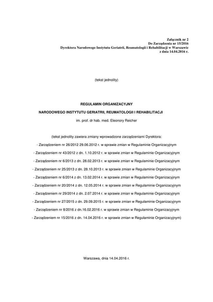 Załącznik nr 2 Do Zarządzenia nr 15/2016 Dyrektora Narodowego Instytutu Geriatrii, Reumatologii i Rehabilitacji w Warszawie z dnia 14.04.2016 r. (tekst jednolity) REGULAMIN ORGANIZACYJNY NARODOWEGO INSTYTUTU GERIATRII, REUMATOLOGII I REHABILITACJI im. prof. dr hab. med. Eleonory Reicher (tekst jednolity zawiera zmiany wprowadzone zarządzeniami Dyrektora: - Zarządzeniem nr 26/2012 29.06.2012 r. w sprawie zmian w Regulaminie Organizacyjnym - Zarządzeniem nr 43/2012 z dn. 1.10.2012 r. w sprawie zmian w Regulaminie Organizacyjnym - Zarządzeniem nr 6/2013 z dn. 28.02.2013 r. w sprawie zmian w Regulaminie Organizacyjnym - Zarządzeniem nr 25/2013 z dn. 28.10.2013 r. w sprawie zmian w Regulaminie Organizacyjnym - Zarządzeniem nr 6/2014 z dn. 13.02.2014 r. w sprawie zmian w Regulaminie Organizacyjnym - Zarządzeniem nr 20/2014 z dn. 12.05.2014 r. w sprawie zmian w Regulaminie Organizacyjnym - Zarządzeniem nr 29/2014 z dn. 2.07.2014 r. w sprawie zmian w Regulaminie Organizacyjnym - Zarządzeniem nr 27/2015 z dn. 29.09.2015 r. w sprawie zmian w Regulaminie Organizacyjnym - Zarządzeniem nr 8/2016 z dn.16.02.2016 r. w sprawie zmian w Regulaminie Organizacyjnym - Zarządzeniem nr 15/2016 z dn. 14.04.2016 r. w sprawie zmian w Regulaminie Organizacyjnym) Warszawa, dnia 14.04.2016 r. ROZDZIAŁ I Postanowienia ogólne §1 1. Podstawę działania Narodowego Instytutu Geriatrii, Reumatologii i Rehabilitacji, zwanego dalej Instytutem stanowią: 1) Statut Instytutu zatwierdzony przez ministra właściwego dla spraw zdrowia, 2) niniejszy Regulamin, 3) obowiązujące Instytut przepisy prawa, w tym w szczególności przepisy ustawy z dnia 30 kwietnia 2010 roku o instytutach badawczych (j.t. Dz.U. z 2015 r., poz. 1095 z późn. zm.), 4) wewnętrzne uregulowania i procedury. 2. Niniejszy regulamin organizacyjny określa: 1) strukturę organizacyjną Instytutu, zakresy działania komórek organizacyjnych oraz zadania i obowiązki osób zajmujących w Instytucie stanowiska samodzielne i kierownicze, 2) organizację i zadania poszczególnych pionów organizacyjnych, zakresy działania poszczególnych jednostek organizacyjnych oraz ogólne zasady współpracy pomiędzy tymi jednostkami dla zapewnienia sprawności funkcjonowania Instytutu pod względem leczniczym, administracyjnym i gospodarczym. 3. Strukturę organizacyjną ilustruje schemat organizacyjny Instytutu stanowiący załącznik nr 1 do niniejszego regulaminu. ROZDZIAŁ II Struktura zarządzania §2 1. Organami Instytutu są: 1) Dyrektor, 2) Rada Naukowa. §3 1. Dyrektor kieruje całokształtem działalności Instytutu, a w szczególności: 1) ustala plany działalności Instytutu i jego strukturę organizacyjną, 2) realizuje politykę kadrową, 3) reprezentuje Instytut, 4) zarządza mieniem i odpowiada za wykorzystanie mienia Instytutu na realizacje zadań statutowych, i oszczędności, zgodnie z zasadami legalności, rzetelności, celowości, gospodarności 5) odpowiada za wyniki działalności naukowej i badawczo rozwojowej Instytutu, 6) podejmuje decyzję we wszystkich sprawach dotyczących Instytutu, z wyjątkiem należących do zakresu działania Rady Naukowej. 2. Dyrektor zarządza Instytutem przy pomocy: 1) Zastępcy Dyrektora ds. Naukowych, 2) Zastępcy Dyrektora ds. Klinicznych, 3) Zastępcy Dyrektora ds. Techniczno-Administracyjnych, 4) Zastępcę Dyrektora ds. Ekonomiczno-Finansowych, 5) Zastępcy Dyrektora ds. Pielęgniarstwa, 6) Głównego Księgowego, 7) Kierowników komórek organizacyjnych i pracowników na samodzielnych stanowiskach pracy. 3. Zastępców Dyrektora powołuje Dyrektor po zasięgnięciu opinii Rady Naukowej. 4. Kierowników komórek organizacyjnych prowadzących badania naukowe lub prace rozwojowe, w tym kierowników klinik, zakładów i oddziałów zatrudnia Dyrektor na okres 6 lat, spośród kandydatów wyłonionych w drodze konkursu po zasięgnięciu opinii Rady Naukowej. W przypadku pozytywnej oceny pracy Dyrektor, po zasięgnięciu opinii Rady Naukowej, może przedłużyć na kolejne kadencje zatrudnienie na zajmowanym stanowisku. Tryb i zasady przeprowadzenia konkursu określa regulamin ustalony przez Dyrektora Instytutu. 6. Zastępcy Dyrektora kierują działalnością w powierzonym im zakresie spraw przy udziale podporządkowanych im bezpośrednio komórek organizacyjnych w granicach umocowania ustalonego przez Dyrektora. 7. Dyrektora podczas jego nieobecności zastępuje Zastępca Dyrektora ds. Naukowych lub inny wyznaczony przez niego Zastępca, bądź upoważniony kierownik komórki organizacyjnej. 8. Dyrektor Instytutu może powołać kolegium jako swój organ opiniodawczo - doradczy. Członków kolegium powołuje i odwołuje Dyrektor. §4 1. Rada Naukowa, jest organem stanowiącym, inicjującym, opiniodawczym i doradczym Instytutu w zakresie jego działalności statutowej oraz w sprawach rozwoju kadry naukowej i badawczotechnicznej. 2. Zadania Rady Naukowej określa ustawa. 3. Zasady i tryb działania Rady Naukowej określa jej regulamin. §5 1. Komisja Dyscyplinarna wybierana jest zgodnie ze Statutem. Rzecznik Dyscyplinarny Instytutu powołany jest przez Radę Naukową Instytutu. 2. Zasady, zadania i tryb działania Komisji Dyscyplinarnej oraz Rzecznika Dyscypliny określa ustawa. §6 1. Dyrektor powołuje w Instytucie: 1) komisje lub zespoły stałe, dla prowadzenia lub opiniowania określonych zagadnień, składające się z pracowników Instytutu. Komisje nie są uprawnione do wydawania poleceń komórkom organizacyjnym. 2) komisje doraźne lub zespoły robocze dla opracowania określonych zagadnień. 2. Komisje i zespoły powoływane są na ściśle określony czas, bądź też dla opracowania oznaczonego zadania. Wykonują one swe zadania w godzinach służbowych i za wykonaną pracę nie przysługuje ich członkom wynagrodzenie, chyba że w zarządzeniu o ich powołaniu jest podane, że mogą wykonywać przydzieloną im pracę w godzinach pozasłużbowych z podaniem podstawy prawnej źródła fi
