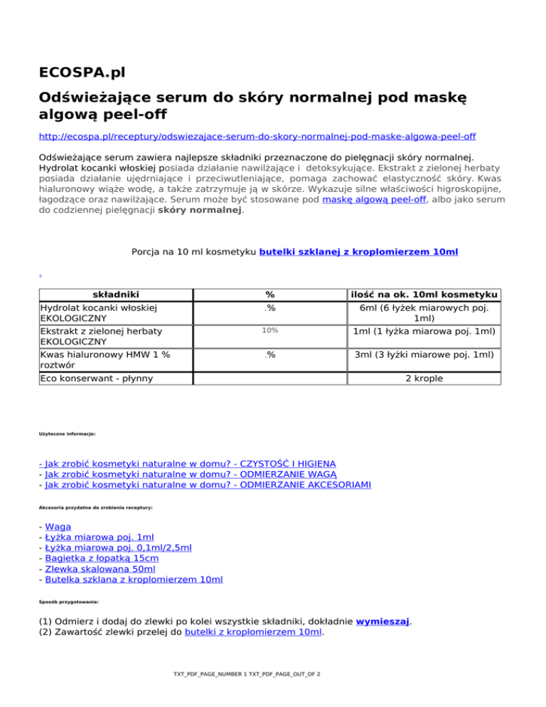 ECOSPA.pl Odświeżające serum do skóry normalnej pod maskę algową peel-off http://ecospa.pl/receptury/odswiezajace-serum-do-skory-normalnej-pod-maske-algowa-peel-off Odświeżające serum zawiera najlepsze składniki przeznaczone do pielęgnacji skóry normalnej. Hydrolat kocanki włoskiej posiada działanie nawilżające i detoksykujące. Ekstrakt z zielonej herbaty posiada działanie ujędrniające i przeciwutleniające, pomaga zachować elastyczność skóry. Kwas hialuronowy wiąże wodę, a także zatrzymuje ją w skórze. Wykazuje silne właściwości higroskopijne, łagodzące oraz nawilżające. Serum może być stosowane pod maskę algową peel-off, albo jako serum do codziennej pielęgnacji skóry normalnej. Porcja na 10 ml kosmetyku butelki szklanej z kroplomierzem 10ml . składniki Hydrolat kocanki włoskiej EKOLOGICZNY % ilość na ok. 10ml kosmetyku % 6ml (6 łyżek miarowych poj. 1ml) 10% 1ml (1 łyżka miarowa poj. 1ml) % 3ml (3 łyżki miarowe poj. 1ml) 2 krople 60 Ekstrakt z zielonej herbaty EKOLOGICZNY Kwas hialuronowy HMW 1 % roztwór 30 Eco konserwant - płynny Użyteczne informacje: - Jak zrobić kosmetyki naturalne w domu? - CZYSTOŚĆ I HIGIENA - Jak zrobić kosmetyki naturalne w domu? - ODMIERZANIE WAGĄ - Jak zrobić kosmetyki naturalne w domu? - ODMIERZANIE AKCESORIAMI Akcesoria przydatne do zrobienia receptury: - Waga - Łyżka miarowa poj. 1ml - Łyżka miarowa poj. 0,1ml/2,5ml - Bagietka z łopatką 15cm - Zlewka skalowana 50ml - Butelka szklana z kroplomierzem 10ml Sposób przygotowania: (1) Odmierz i dodaj do zlewki po kolei wszystkie składniki, dokładnie wymieszaj. (2) Zawartość zlewki przelej do butelki z kroplomierzem 10ml. TXT_PDF_PAGE_NUMBER 1 TXT_PDF_PAGE_OUT_OF 2 Instrukcja użycia: (1) Umyj twarz, np. bazowym żelem do mycia EKOLOGICZNYM. (2) Stonizuj skórę twarzy ulubionym hydrolatem. Może to być hydrolat kocanki włoskiej użyty w recepture. (3) Wykonując kuliste ruchy, delikatnie masując skórę opuszkami palców, rozprowadź serum po twarzy, szyi i dekolcie omijając oczy i usta. (4) Na serum możesz zaaplikować maskę algową peel-off albo swój ulubiony krem. Może to być np. krem z bazy kremowej EKOLOGICZNEJ. Przechowywanie stosowanie termin przydatności w lodówce pod maskę algową peel-off lub jako serum do codziennej pielęgnacji 6 tygodni TXT_PDF_PAGE_NUMBER 2 TXT_PDF_PAGE_OUT_OF 2