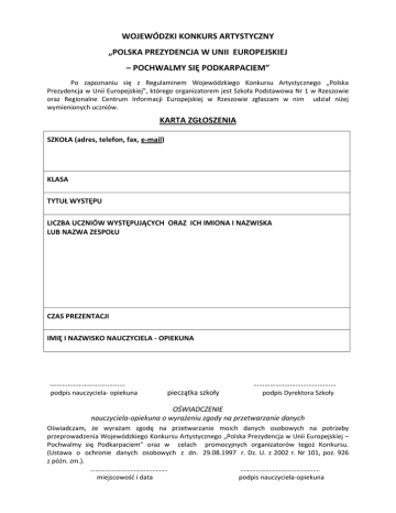 WOJEWÓDZKI KONKURS ARTYSTYCZNY „POLSKA PREZYDENCJA W UNII EUROPEJSKIEJ – POCHWALMY SIĘ PODKARPACIEM” Po zapoznaniu się z Regulaminem Wojewódzkiego Konkursu Artystycznego „Polska Prezydencja w Unii Europejskiej”, którego organizatorem jest Szkoła Podstawowa Nr 1 w Rzeszowie oraz Regionalne Centrum Informacji Europejskiej w Rzeszowie zgłaszam w nim udział niżej wymienionych uczniów. KARTA ZGŁOSZENIA SZKOŁA (adres, telefon, fax, e-mail) KLASA TYTUŁ WYSTĘPU LICZBA UCZNIÓW WYSTĘPUJĄCYCH ORAZ ICH IMIONA I NAZWISKA LUB NAZWA ZESPOŁU CZAS PREZENTACJI IMIĘ I NAZWISKO NAUCZYCIELA - OPIEKUNA ………………………............. podpis nauczyciela- opiekuna ……………………………………… pieczątka szkoły podpis Dyrektora Szkoły OŚWIADCZENIE nauczyciela-opiekuna o wyrażeniu zgody na przetwarzanie danych Oświadczam, że wyrażam zgodę na przetwarzanie moich danych osobowych na potrzeby przeprowadzenia Wojewódzkiego Konkursu Artystycznego „Polska Prezydencja w Unii Europejskiej – Pochwalmy się Podkarpaciem” oraz w celach promocyjnych organizatorów tegoż Konkursu. (Ustawa o ochronie danych osobowych z dn. 29.08.1997 r. Dz. U. z 2002 r. Nr 101, poz. 926 z późn. zm.). ………………………………………. ……………………………………….. miejscowość i data podpis nauczyciela-opiekuna