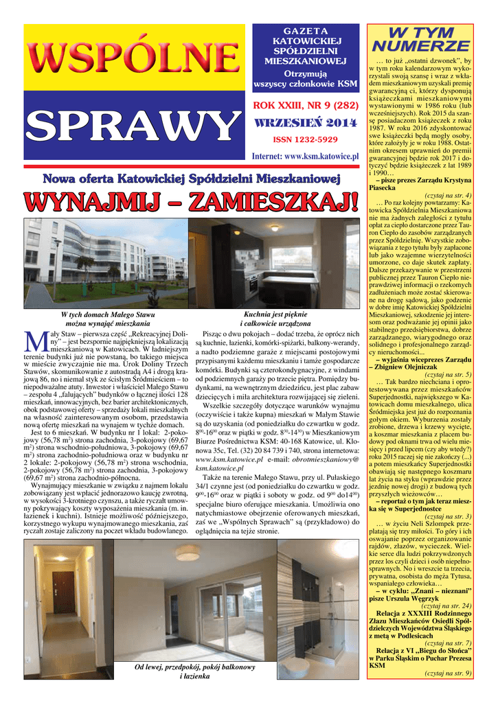 WSPÓLNE SPRAWY GAZETA KATOWICKIEJ SPÓ£DZIELNI MIESZKANIOWEJ Otrzymuj¹ wszyscy cz³onkowie KSM ROK XXIII, NR 9 (282) WRZESIEŃ 2014 ISSN 1232-5929 Internet: www.ksm.katowice.pl Nowa oferta Katowickiej Spółdzielni Mieszkaniowej Wynajmij – zamieszkaj! W tych domach Małego Stawu można wynająć mieszkania ały Staw – pierwsza część „Rekreacyjnej Doliny” – jest bezspornie najpiękniejszą lokalizacją mieszkaniową w Katowicach. W ładniejszym terenie budynki już nie powstaną, bo takiego miejsca w mieście zwyczajnie nie ma. Urok Doliny Trzech Stawów, skomunikowanie z autostradą A4 i drogą krajową 86, no i niemal styk ze ścisłym Śródmieściem – to niepodważalne atuty. Inwestor i właściciel Małego Stawu – zespołu 4 „falujących” budynków o łącznej ilości 128 mieszkań, innowacyjnych, bez barier architektonicznych, obok podstawowej oferty – sprzedaży lokali mieszkalnych na własność zainteresowanym osobom, przedstawia nową ofertę mieszkań na wynajem w tychże domach. Jest to 6 mieszkań. W budynku nr 1 lokal: 2-pokojowy (56,78 m2) strona zachodnia, 3-pokojowy (69,67 m2) strona wschodnio-południowa, 3-pokojowy (69,67 m2) strona zachodnio-południowa oraz w budynku nr 2 lokale: 2-pokojowy (56,78 m2) strona wschodnia, 2-pokojowy (56,78 m2) strona zachodnia, 3-pokojowy (69,67 m2) strona zachodnio-północna. Wynajmujący mieszkanie w związku z najmem lokalu zobowiązany jest wpłacić jednorazowo kaucję zwrotną, w wysokości 3-krotniego czynszu, a także ryczałt umowny pokrywający koszty wyposażenia mieszkania (m. in. łazienek i kuchni). Istnieje możliwość późniejszego, korzystnego wykupu wynajmowanego mieszkania, zaś ryczałt zostaje zaliczony na poczet wkładu budowlanego. M Kuchnia jest pięknie i całkowicie urządzona Pisząc o dwu pokojach – dodać trzeba, że oprócz nich są kuchnie, łazienki, komórki-spiżarki, balkony-werandy, a nadto podziemne garaże z miejscami postojowymi przypisanymi każdemu mieszkaniu i tamże gospodarcze komórki. Budynki są czterokondygnacyjne, z windami od podziemnych garaży po trzecie piętra. Pomiędzy budynkami, na wewnętrznym dziedzińcu, jest plac zabaw dziecięcych i miła architektura rozwijającej się zieleni. Wszelkie szczegóły dotyczące warunków wynajmu (oczywiście i także kupna) mieszkań w Małym Stawie są do uzyskania (od poniedziałku do czwartku w godz. 800-1600 oraz w piątki w godz. 830-1430) w Mieszkaniowym Biurze Pośrednictwa KSM: 40-168 Katowice, ul. Klonowa 35c, Tel. (32) 20 84 739 i 740, strona internetowa: www.ksm.katowice.pl e-mail: obrotmieszkaniowy@ ksm.katowice.pl Także na terenie Małego Stawu, przy ul. Pułaskiego 34/1 czynne jest (od poniedziałku do czwartku w godz. 900-1600 oraz w piątki i soboty w godz. od 900 do1400) specjalne biuro oferujące mieszkania. Umożliwia ono natychmiastowe obejrzenie oferowanych mieszkań, zaś we „Wspólnych Sprawach” są (przykładowo) do oglądnięcia na tejże stronie. Od lewej, przedpokój, pokój balkonowy i łazienka W TYM NUMERZE … to już „ostatni dzwonek”, by w tym roku kalendarzowym wykorzystali swoją szansę i wraz z wkładem mieszkaniowym uzyskali premię gwarancyjną ci, którzy dysponują książeczkami mieszkaniowymi wystawionymi w 1986 roku (lub wcześniejszych). Rok 2015 da szansę posiadaczom książeczek z roku 1987. W roku 2016 zdyskontować swe książeczki będą mogły osoby, które założyły je w roku 1988. Ostatnim okresem uprawnień do premii gwarancyjnej będzie rok 2017 i dotyczyć będzie książeczek z lat 1989 i 1990… – pisze prezes Zarządu Krystyna Piasecka (czytaj na str. 4) … Po raz kolejny powtarzamy: Katowicka Spółdzielnia Mieszkaniowa nie ma żadnych zaległości z tytułu opłat za ciepło dostarczone przez Tauron Ciepło do zasobów zarządzanych przez Spółdzielnię. Wszystkie zobowiązania z tego tytułu były zapłacone lub jako wzajemne wierzytelności umorzone, co daje skutek zapłaty. Dalsze przekazywanie w przestrzeni publicznej przez Tauron Ciepło nieprawdziwej informacji o rzekomych zadłużeniach może zostać skierowane na drogę sądową, jako godzenie w dobre imię Katowickiej Spółdzielni Mieszkaniowej, szkodzenie jej interesom oraz podważanie jej opinii jako stabilnego przedsiębiorstwa, dobrze zarządzanego, wiarygodnego oraz solidnego i profesjonalnego zarządcy nieruchomości... – wyjaśnia wiceprezes Zarządu – Zbigniew Olejniczak (czytaj na str. 5) … Tak bardzo niechciana i oprotestowywana przez mieszkańców Superjednostki, największego w Katowicach domu mieszkalnego, ulica Śródmiejska jest już do rozpoznania gołym okiem. Wyburzenia zostały zrobione, drzewa i krzewy wycięte, a koszmar mieszkania z placem budowy pod oknami trwa od wielu miesięcy i przed lipcem (czy aby wtedy?) roku 2015 raczej się nie zakończy (...) a potem mieszkańcy Superjednostki obawiają się następnego koszmaru lat życia na styku (wprawdzie przez jezdnię nowej drogi) z budową tych przyszłych wieżowców… – reportaż o tym jak teraz mieszka się w Superjednostce (czytaj na str. 3) … w życiu Neli Szlompek przeplatają się trzy miłości. To góry i ich oswajanie poprzez organizowanie rajdów, złazów, wycieczek. Wielkie serce dla ludzi pokrzywdzonych przez los czyli dzieci i osób niepełnosprawnych. No i wreszcie ta trzecia, prywatna, osobista do męża Tytusa, wspaniałego człowieka… – w cyklu: „Znani – nieznani” pisze Urszula Węgrzyk (czytaj na str. 24) Relacja z XXXIII Rodzinnego Złazu Mieszkańców Osiedli Spółdzielczych Województwa Śląskiego z metą w Podlesicach (czytaj na str. 7) Relacja z VI „Biegu do Słońca” w Parku Śląskim o Puchar Prezesa KSM (czytaj na str. 9) Uwaga PT kandydaci do organów samorządowych Czas przedwyborczy 16 listopada 2014 roku odbędą się wybory do samorządu terytorialnego. Mieszkańcy zasobów Katowickiej Spółdzielni Mieszkaniowej – wraz z innymi osobami mieszkaj