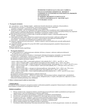 BURMISTRZ STAREGO SĄCZA OGŁASZA NABÓR NA WOLNE STANOWISKO URZĘDNICZE: REFERENT SAMODZIELNE STANOWISKO D.S POZYSKIWANIA ŚRODKÓW ZEWNĘTRZNYCH W URZĘDZIE MIEJSKIM W STARYM SĄCZU UL. STEFANA BATOREGO 25 33 - 340 STARY SĄCZ W WYMIARZE 1 ETATU 1. Wymagania niezbędne: a) wykształcenie wyższe drugiego stopnia : preferowane kierunki ekonomiczne, techniczne, lub przyrodnicze ; b) doświadczenie zawodowe w samodzielnym i skutecznym przygotowywaniu i rozliczaniu projektów i programów realizowanych z funduszy Unii Europejskiej; c) obywatelstwo polskie , lub Unii Europejskiej, albo innego państwa, które na podstawie umów międzynarodowych lub przepisów prawa wspólnotowego daje prawo do podjęcia zatrudnienia na terytorium Rzeczypospolitej Polskiej oraz znajomość języka polskiego potwierdzona dokumentem określonym w przepisach o służbie cywilnej: d) brak skazania prawomocnym wyrokiem sądu za umyślne przestępstwo ścigane z oskarżenia publicznego lub umyślne przestępstwo skarbowe; e ) nieposzlakowana opinia, pełna zdolność do czynności prawnych oraz korzystanie z pełni praw publicznych oraz spełnienie pozostałych wymagań z art.6 ustawy o pracownikach samorządowych określonych dla pracowników samorządowych zatrudnionych na podstawie umowy o pracę; f) znajomość regulacji prawnych dotyczących : funduszy unijnych, zamówień publicznych, procedur aplikacyjnych i rozliczania dotacji; g) znajomość polityki regionalnej UE na lata 2014-2020 i zasad realizacji programów, projektów finansowanych ze środków zewnętrznych; h) prawo jazdy kat. B ; i ) biegła znajomość języka angielskiego. 2. Wymagania dodatkowe: a) studia podyplomowe i udokumentowane szkolenia, lub kursy związane z zakresem zadań przewidzianych do realizacji na w/w stanowisku ; b) preferowane doświadczenie zawodowe w instytucjach wdrażających programy europejskie i na stanowiskach urzędniczych w jednostkach o których mowa w art.2 ustawy o pracownikach samorządowych; c) znajomość zasad prowadzenia inwestycji publicznych; d) znajomość przepisów prawnych z zakresu : - ustawy z dnia 8 marca 1990 r. o samorządzie gminnym ( tekst jednolity Dz.U. z 2013 r. poz.594 ze zm.), - ustawy z dnia 21 listopada 2008 r. o pracownikach samorządowych (tekst jednolity Dz.U. z 2014 r. poz.1202.), - ustawy z dnia 14 czerwca 1960 r. Kodeks Postępowania Administracyjnego (tekst jednolity Dz. U. z 2013 r. poz.267 ze zm.), -ustawy z dnia 29 sierpnia 1997 r. o ochronie danych osobowych (tekst jednolity Dz.U. z 2014 poz.1182 ze zm.) wraz z aktami wykonawczymi, - ustawy z dnia 6 września 2001 r. o dostępie do informacji publicznej (tekst jednolity Dz.U. z 2014 r. poz. 782 ze zm.), - ustawy z dnia 27 sierpnia 2009 r. o finansach publicznych (tekst jednolity Dz.U.z 2013 r. poz.885 ze zm.), - ustawy z dnia 29 stycznia 2004 r. Prawo zamówień publicznych (tekst jednolity Dz.U. z 2014 r. poz.423 ze zm.) wraz z aktami wykonawczymi , e) umiejętność sprawnej obsługi komputera i pakietów biurowych; f) predyspozycje osobowościowe : zdolność do kreatywnego i innowacyjnego myślenia, zaangażowanie, samodzielność , odpowiedzialność, komunikatywność w mowie i piśmie, umiejętność pracy w zespole, obowiązkowość, odporność na stres i konieczność działania pod presją czasu, dokładność. 3. Zakres wykonywanych zadań na stanowisku: Zadania główne : Prowadzenie działań związanych z przygotowywaniem i rozliczaniem projektów, programów finansowanych ze środków unijnych i innych funduszy zewnętrznych oraz programów krajowych. Zadania szczegółowe: 1. 2. 3. 4. 5. 6. 7. Bieżące monitorowanie dostępności funduszy umożliwiających pozyskiwanie środków pozabudżetowych krajowych i zagranicznych w tym Unii Europejskiej na realizację zadań Gminy. Analiza możliwości finansowania projektów z programów europejskich i pozaeuropejskich. Pozyskiwanie i gromadzenie danych niezbędnych do właściwego opracowywania wniosków. Przygotowywanie, przy współpracy z merytorycznymi komórkami organizacyjnymi Urzędu i jednostkami organizacyjnymi Gminy, wniosków aplikacyjnych i koordynacja ich bieżącej obsługi. Opracowywanie merytoryczne opinii i załączników do wniosków o dofinansowanie. Bieżąca obsługa projektów pod względem przepływu dokumentów. Prowadzenie pełnej dokumentacji dotyczącej pozyskiwania funduszy od chwili przygotowania wniosku do rozliczenia- 8. 9. w tym przygotowanie sprawozdań, wniosków o płatność, harmonogramów płatności . Współpraca z odpowiednimi organami administracji rządowej i samorządowej a także z sektorem społecznym, gospodarczym w celu pozyskiwania środków pozabudżetowych. Monitorowanie trwałości realizowanych przez Gminę projektów. i Zadania okresowe: Zlecone przez bezpośredniego przełożonego oraz przełożonego wyższego stopnia. 4.Wymagane dokumenty: 1. List motywacyjny. 2. Życiorys (CV). 3. Uwierzytelnione kserokopie świadectw pracy. 4. Uwierzytelnione kserokopie dokumentów poświadczających wykształcenie (dyplom lub zaświadczenie o stanie odbytych studiów). 5. Uwierzytelnione kserokopie innych dodatkowych dokumentów o posiadanych kwalifikacjach uprawnieniach i umiejętnościach. 6. Wypełniony kwestionariusz osobowy dla osoby ubiegającej się o zatrudnienie. 7. Uwierzytelniony dokument potwierdzający niepełnosprawność w przypadku kandydata który zamierza skorzystać uprawnienia, o którym mowa w art. 13 a ust.2 ustawy z dnia 21 listopada 2008 r. o pracownikach samorządowych ( tekst jednolity Dz.U.z 2014 r. poz.1202.). 8. Oświadczenie o stanie zdrowia kandydata pozwalającym na pracę na wskazanym stanowisku. 9. Oświadczenie kandydata o pełnej zdolności do czynności prawnych oraz o korzystaniu z pełni praw publicznych. 10.Oświadczenie kandydata ze nie był skazany prawomocnym wyrokiem sądu za umyślne przestępstwo ścigane z oskarżenia publicznego, lub umyślne przestępstwo skarbowe . Uwierzytel