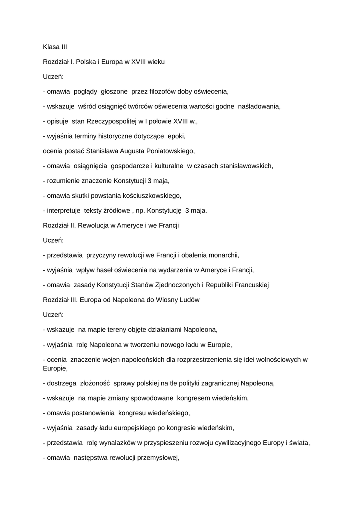 Klasa III Rozdział I. Polska i Europa w XVIII wieku Uczeń: - omawia poglądy głoszone przez filozofów doby oświecenia, - wskazuje wśród osiągnięć twórców oświecenia wartości godne naśladowania, - opisuje stan Rzeczypospolitej w I połowie XVIII w., - wyjaśnia terminy historyczne dotyczące epoki, ocenia postać Stanisława Augusta Poniatowskiego, - omawia osiągnięcia gospodarcze i kulturalne w czasach stanisławowskich, - rozumienie znaczenie Konstytucji 3 maja, - omawia skutki powstania kościuszkowskiego, - interpretuje teksty źródłowe , np. Konstytucję 3 maja. Rozdział II. Rewolucja w Ameryce i we Francji Uczeń: - przedstawia przyczyny rewolucji we Francji i obalenia monarchii, - wyjaśnia wpływ haseł oświecenia na wydarzenia w Ameryce i Francji, - omawia zasady Konstytucji Stanów Zjednoczonych i Republiki Francuskiej Rozdział III. Europa od Napoleona do Wiosny Ludów Uczeń: - wskazuje na mapie tereny objęte działaniami Napoleona, - wyjaśnia rolę Napoleona w tworzeniu nowego ładu w Europie, - ocenia znaczenie wojen napoleońskich dla rozprzestrzenienia się idei wolnościowych w Europie, - dostrzega złożoność sprawy polskiej na tle polityki zagranicznej Napoleona, - wskazuje na mapie zmiany spowodowane kongresem wiedeńskim, - omawia postanowienia kongresu wiedeńskiego, - wyjaśnia zasady ładu europejskiego po kongresie wiedeńskim, - przedstawia rolę wynalazków w przyspieszeniu rozwoju cywilizacyjnego Europy i świata, - omawia następstwa rewolucji przemysłowej, - omawia genezę nowych idei społecznych, - porównuje i ocenia nowe idee społeczne, - wskazuje różnice w celach powstań i rewolucji europejskich, - określa rolę powstań w kształtowaniu się świadomości narodowej, - omawia osiągnięcia i porażki walczących narodów i grup społecznych. Rozdział IV. Ziemie polskie w okresie powstań narodowych Uczeń: - wskazuje na mapie zmiany terytorialne po kongresie wiedeńskim oraz po powstaniach, - posługuje się terminami historycznymi, - opisuje ziemię polskie po kongresie wiedeńskim, - przedstawia genezę i przebieg powstań na ziemiach polskich w XIX w., - ocenia skutki powstań, - przedstawia najwybitniejszych twórców Wielkiej Emigracji, - wskazuje przyczyny i skutki wystąpień w latach 1846-1848, - omawia sytuację w Królestwie Polskim przed powstaniem styczniowym, - ocenia wpływ sytuacji w Królestwie Polskim na decyzję o rozpoczęciu powstania styczniowego, - omawia skutki i znaczenie powstania styczniowego, - omawia politykę Rosji wobec Polaków po powstaniu styczniowym, - wskazuje podłoże ruchu robotniczego, narodowego i ludowego na ziemiach polskich, - omawia rozwój przemysłu i nowoczesnego rolnictwa na ziemiach polskich, - określa różnicę między romantyzmem i pozytywizmem, Rozdział V. Polska i świat w II połowie XIX wieku Uczeń: - wskazuje na mapie omawiane państwa i ich terytoria, - omawia genezę , przebieg i skutki zjednoczenia Włoch i Niemiec, - omawia oddziaływania idei wolnościowych i nacjonalistycznych na kształtowanie się świadomości narodowej, - wyjaśnia polityczno-społeczne i gospodarcze podłoże wojny domowej w Ameryce - przedstawia główne cechy polityki kolonialnej mocarstw, - określa wpływ rozwoju przemysłu na powstanie nowoczesnego kolonializmu, - wskazuje zależności między rozwojem gospodarczym świata a postępem w nauce, - przedstawia nowe programy demokratyczne i ich wpływ na życie codzienne ludzi. Rozdział VI. I wojna światowa Uczeń: - wskazuje na mapie omawiane państwa i ich terytoria, - wyjaśnia znaczenie poznanych terminów historycznych, - omawia genezę i przebieg I wojny światowej, - porównanie propagandę bolszewików z realiami ich polityki, - wskazuje powojenne zmiany na mapie Europy i świata, - ocenia sytuację na świecie po traktacie wersalskim, -omawia działania Polaków w czasie I wojny - przedstawia sprawę polską podczas I wojny światowej, - wymienia rolę wybitnych Polaków w czasie wojny.